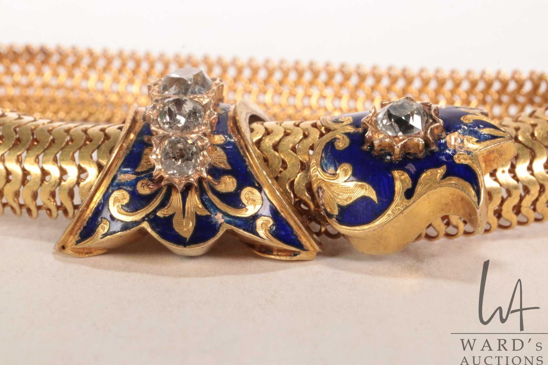 Antique Victorian Revival 14kt yellow gold, diamond, serpentine link and guilloche blue enamel adjus