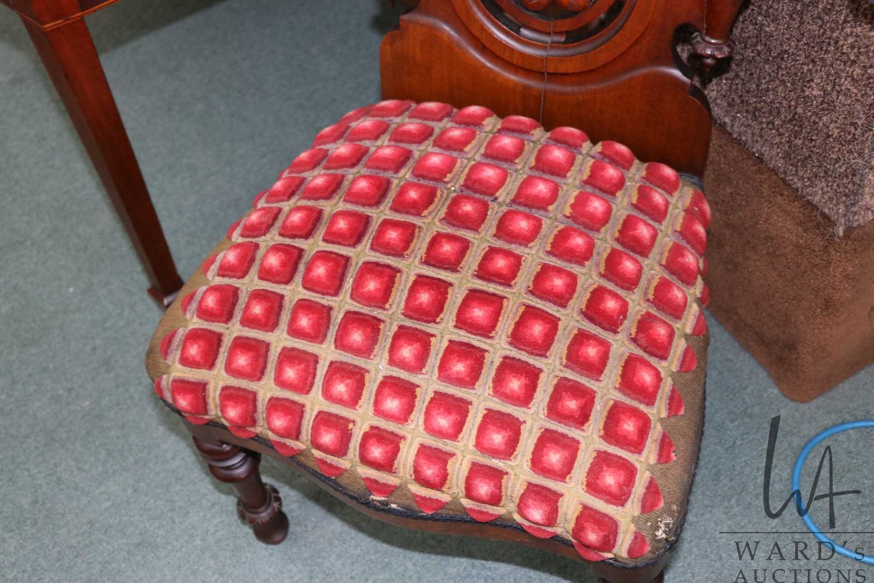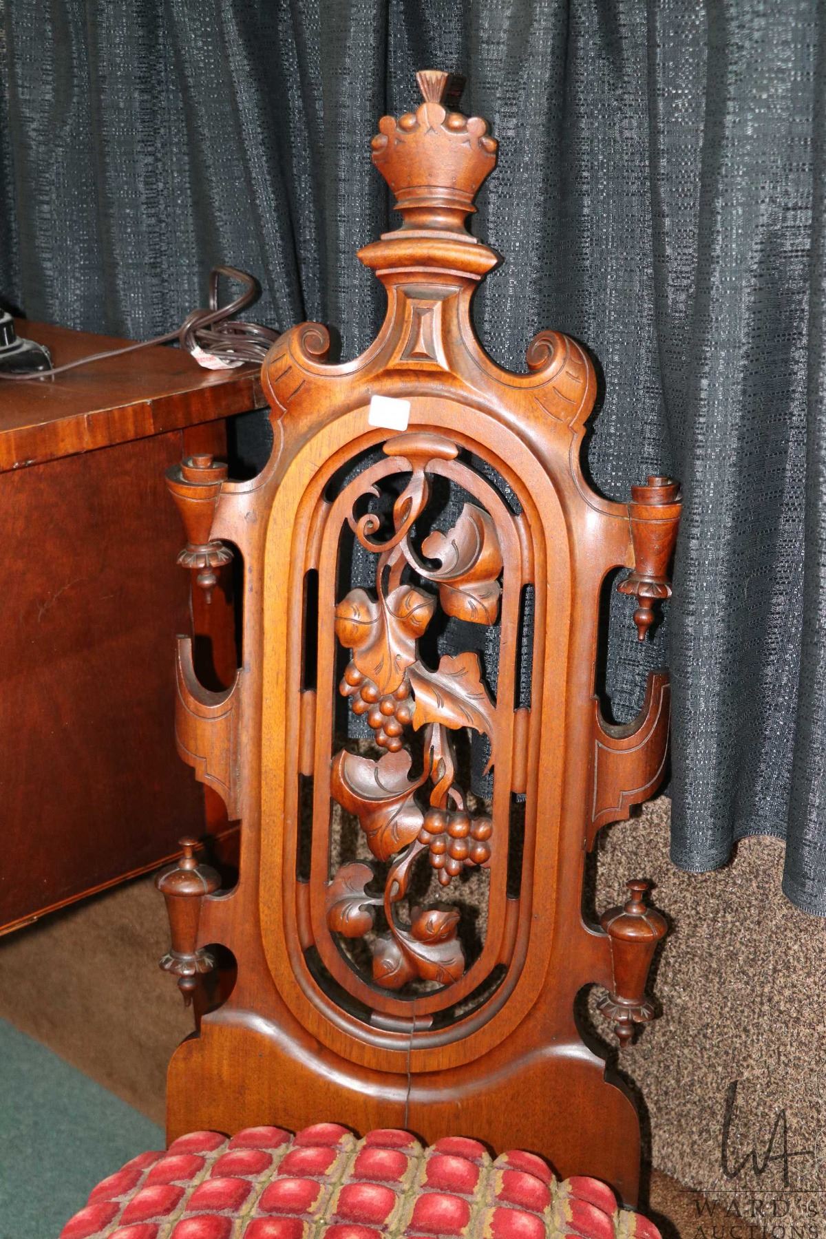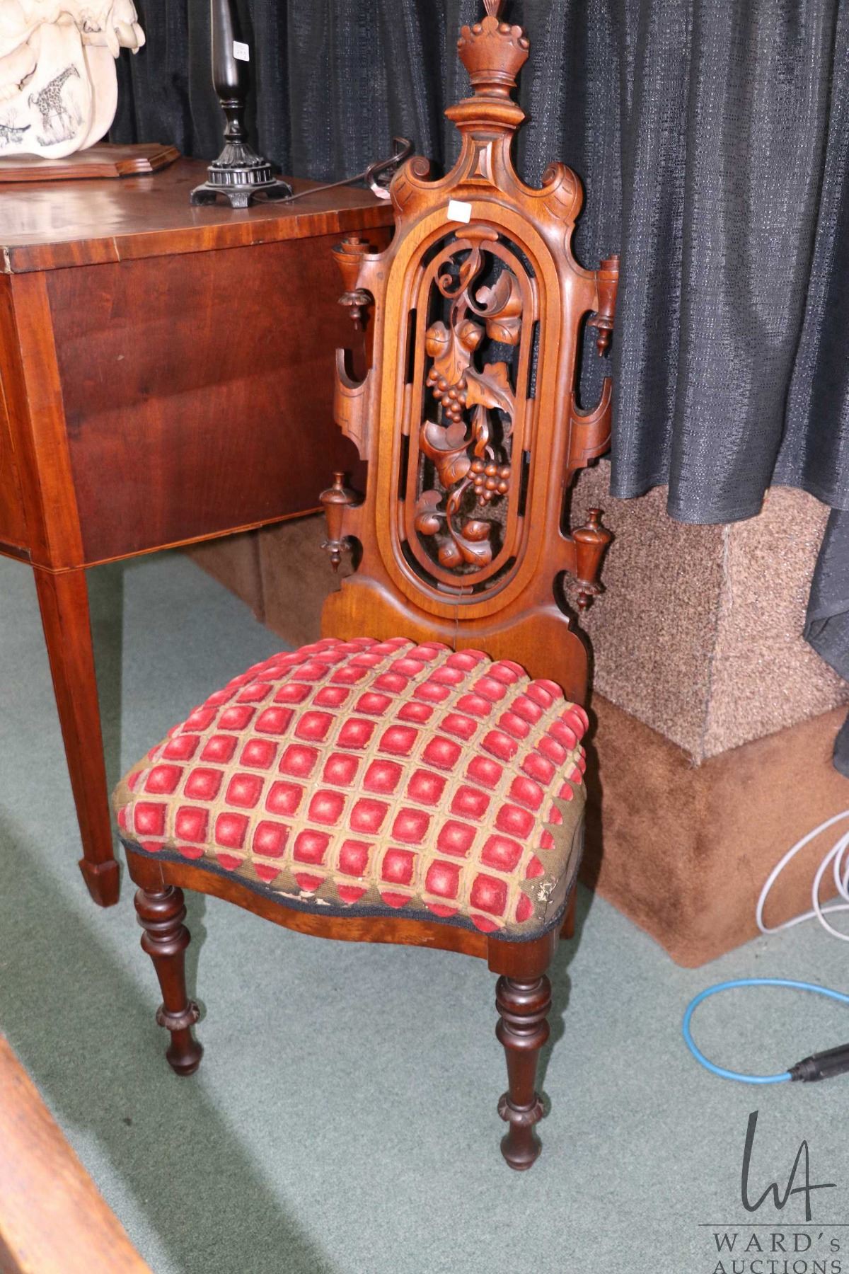 Antique Victorian Rococo revival walnut side chair with grape and leaf carved back and upholstered seat, note: back to seat attachment very loose