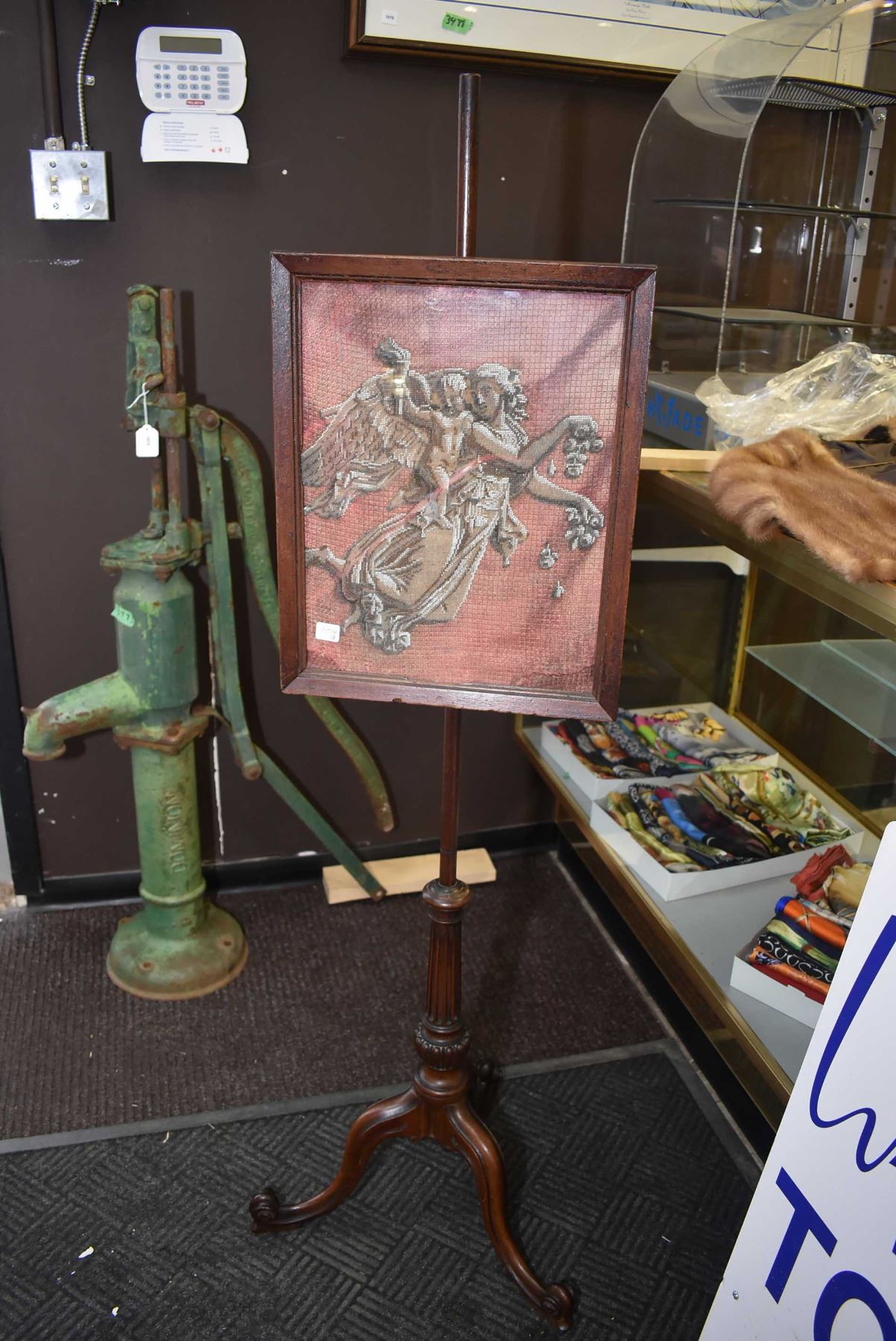Antique Victorian rosewood adjustable draft screen with glass beaded angel motif tapestry