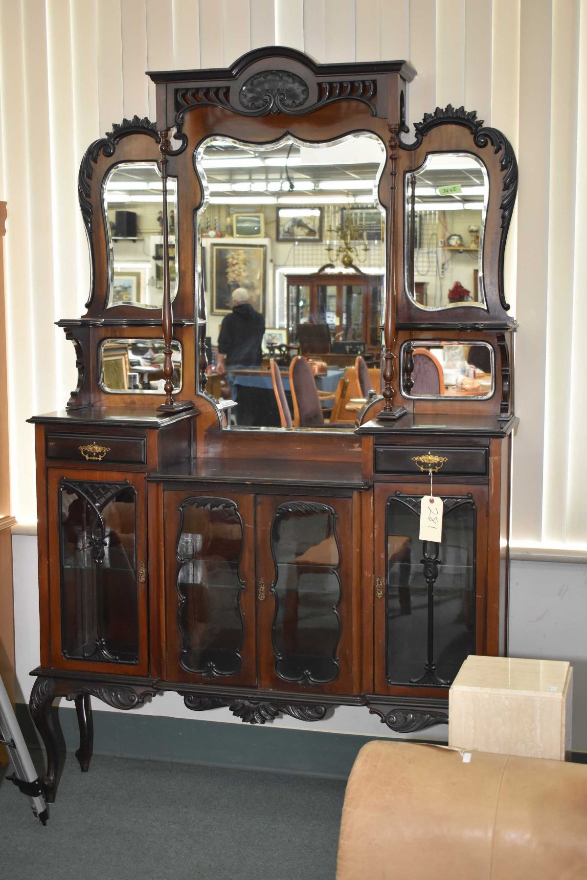 Antique Victorian rosewood ‚tagŠre with multiple bevelled mirrors, turned columns, carved decoration and four display doors in base