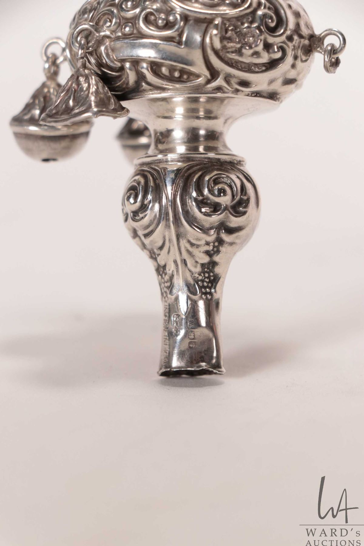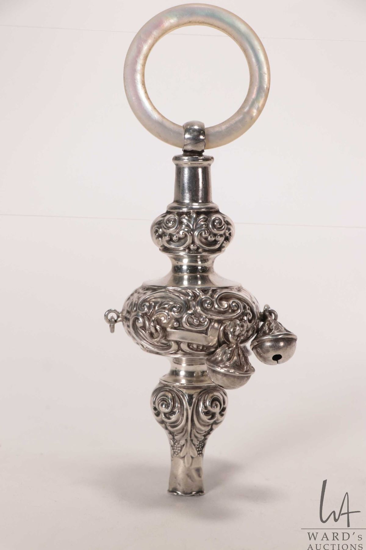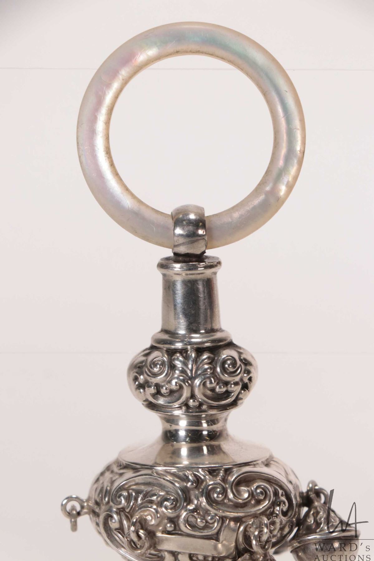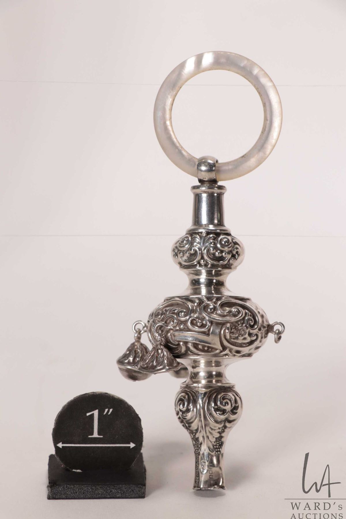 Antique Victorian sterling silver baby rattle with mother-of-pearl ring and three bells, note: missing three bells and gum soother. Marked with British sterling silver hallmarks