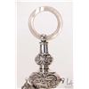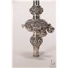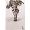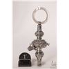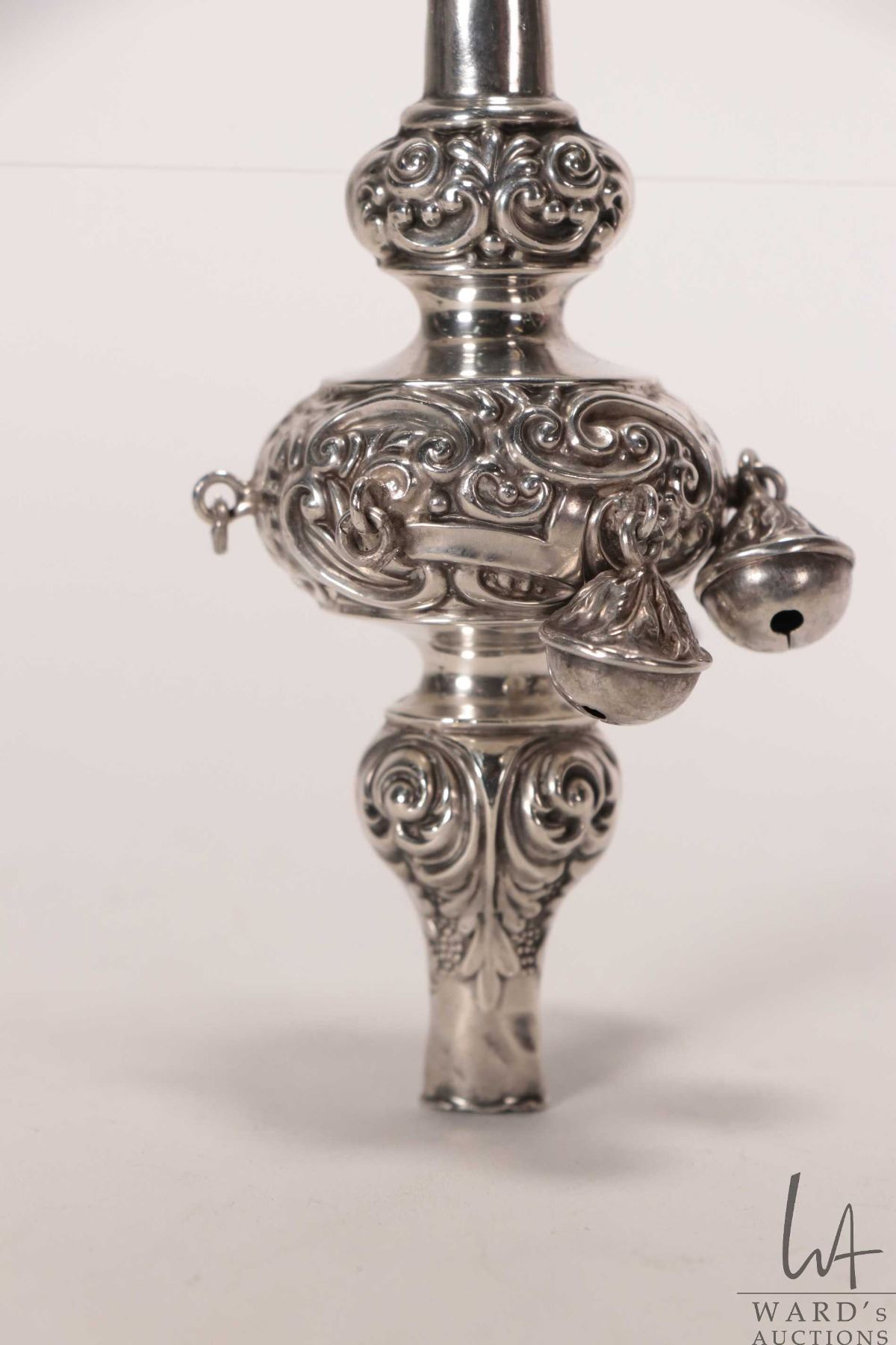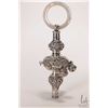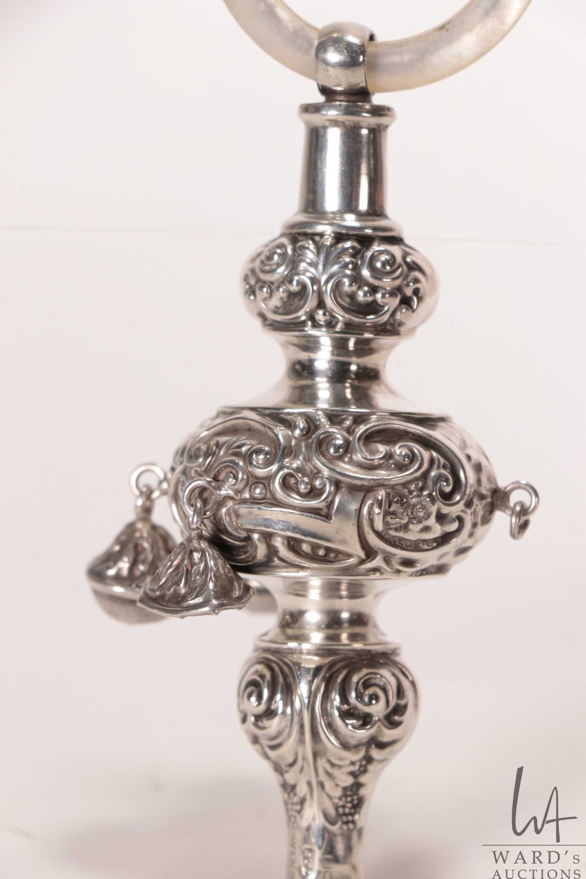 Antique Victorian sterling silver baby rattle with mother-of-pearl ring and three bells, note: missi