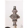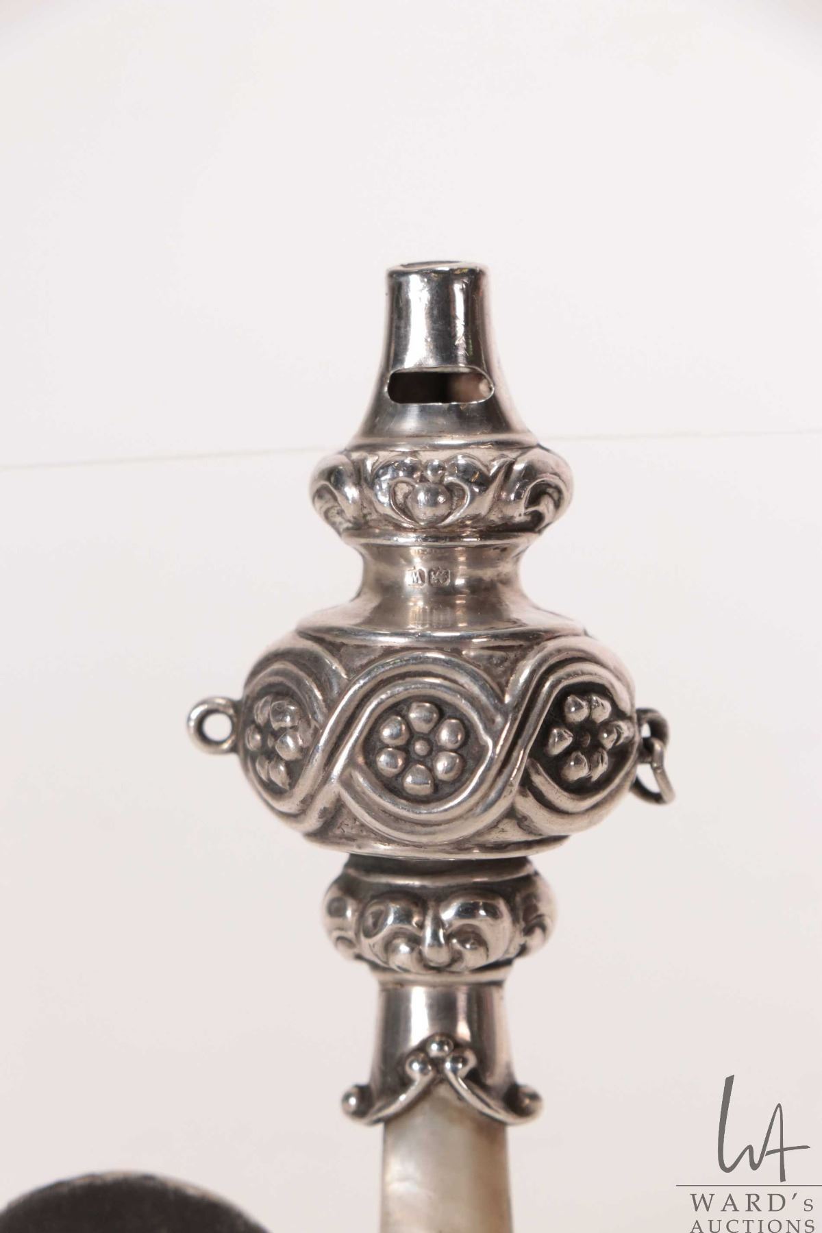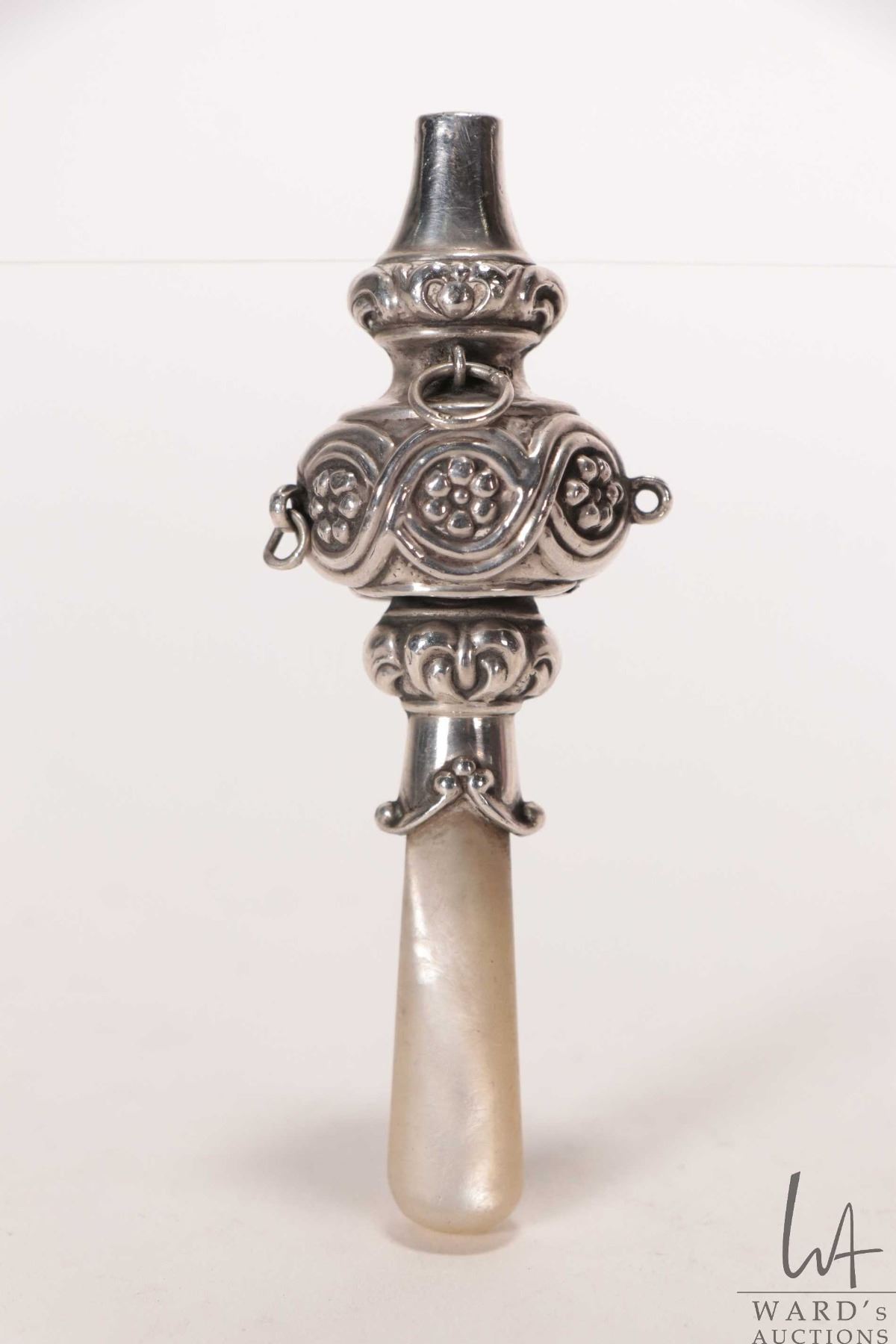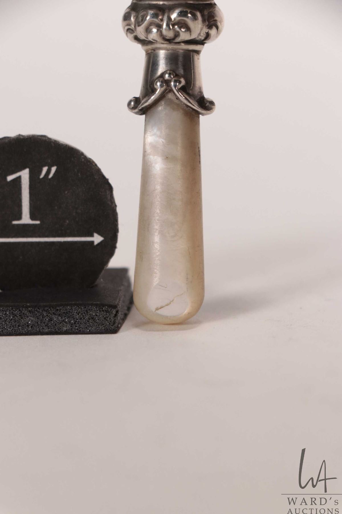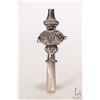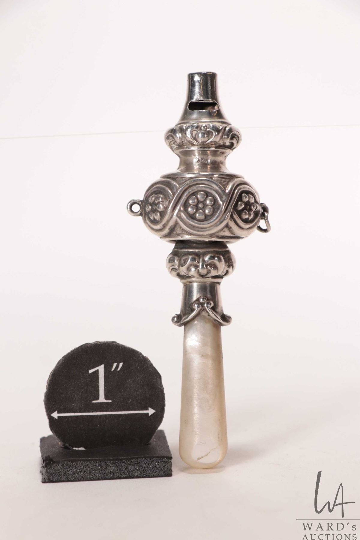 Antique Victorian sterling silver bells and whistle baby rattle with mother-of-pearl soother. Marked with British sterling hallmarks. Note: missing bells