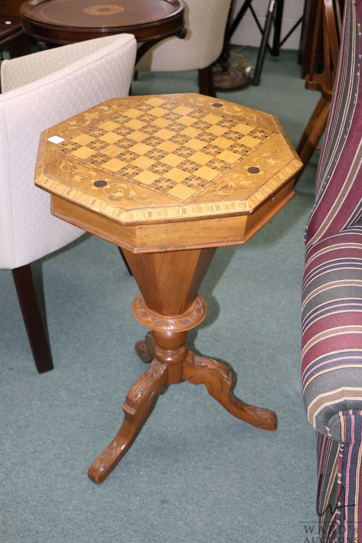 Antique Victorian trumpet sewing table with checkerboard marquetry top, inlaid decoration and carved cabriole feet