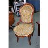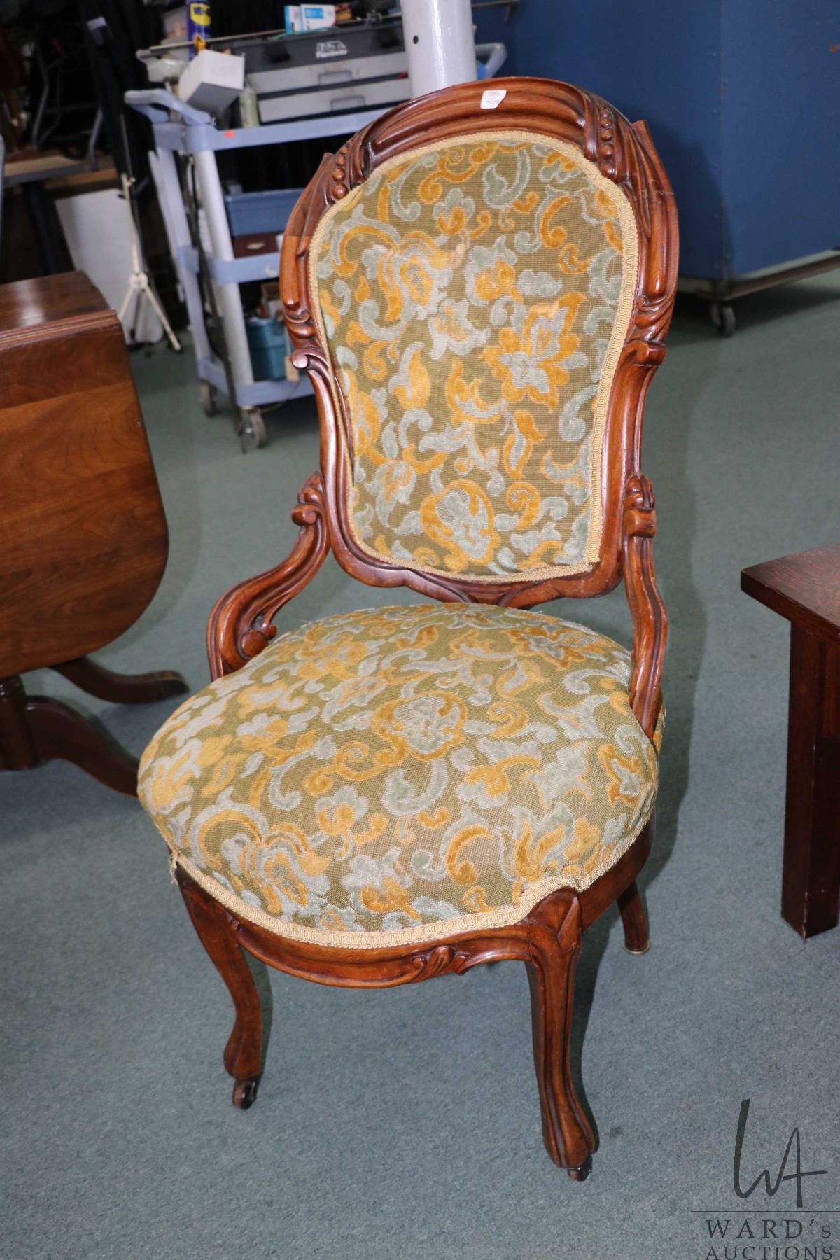 Antique Victorian upholstered parlour chair with carved decoration and porcelain castors