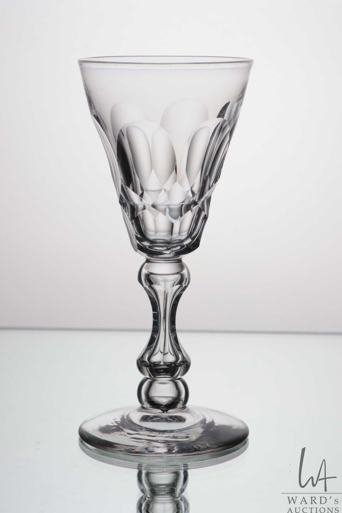 Antique William IV/ Victorian toastmasters glass with petal cut bowl and triple knob trapped bubble stem on sightly conical base, circa 1830's, 13.5cm in height