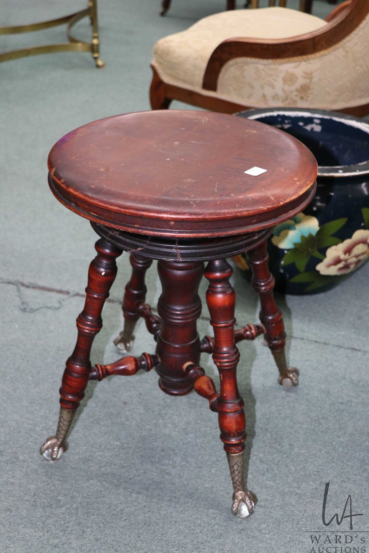 Antique adjustable height, swivel seat piano stool with cast and glass ball and claw feet