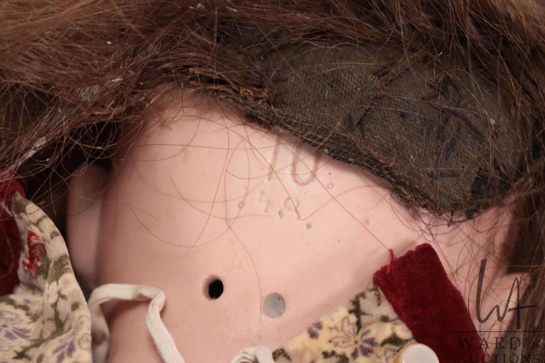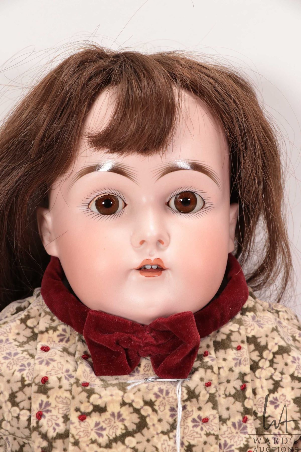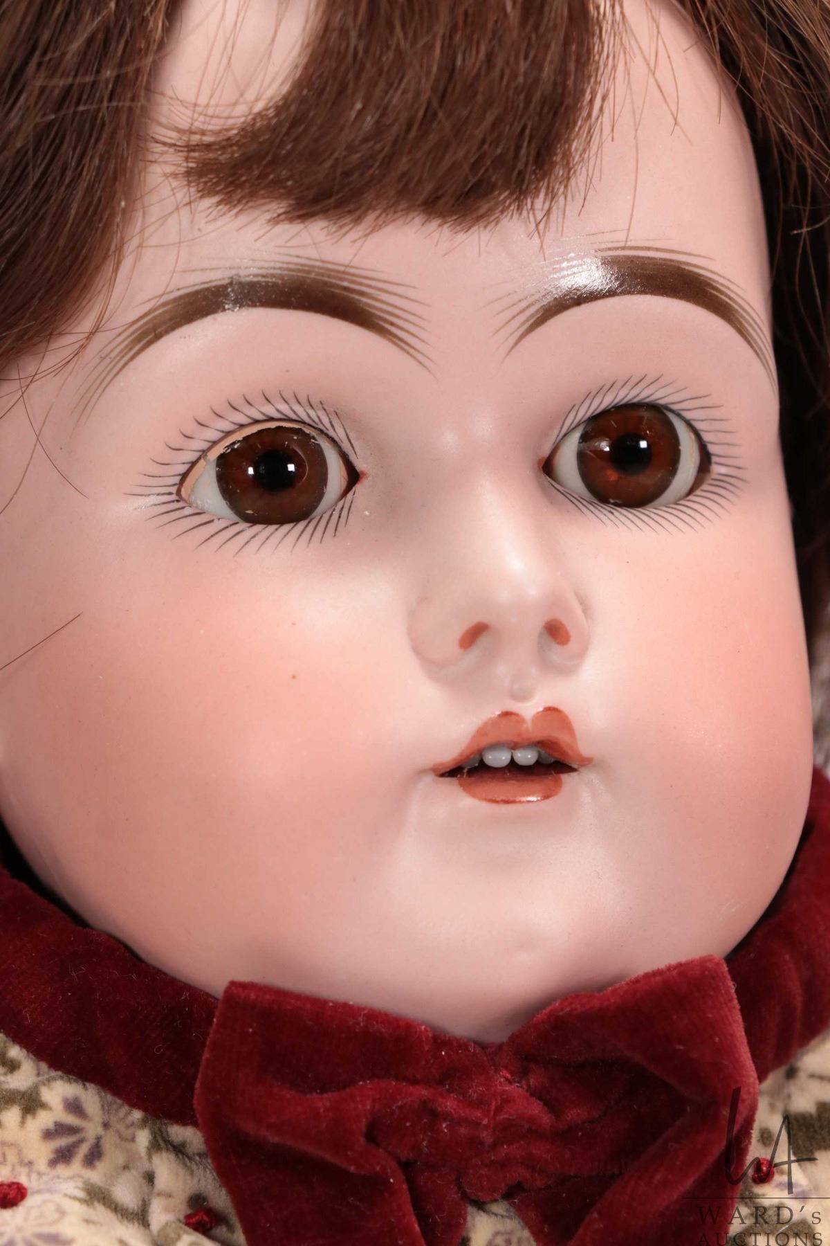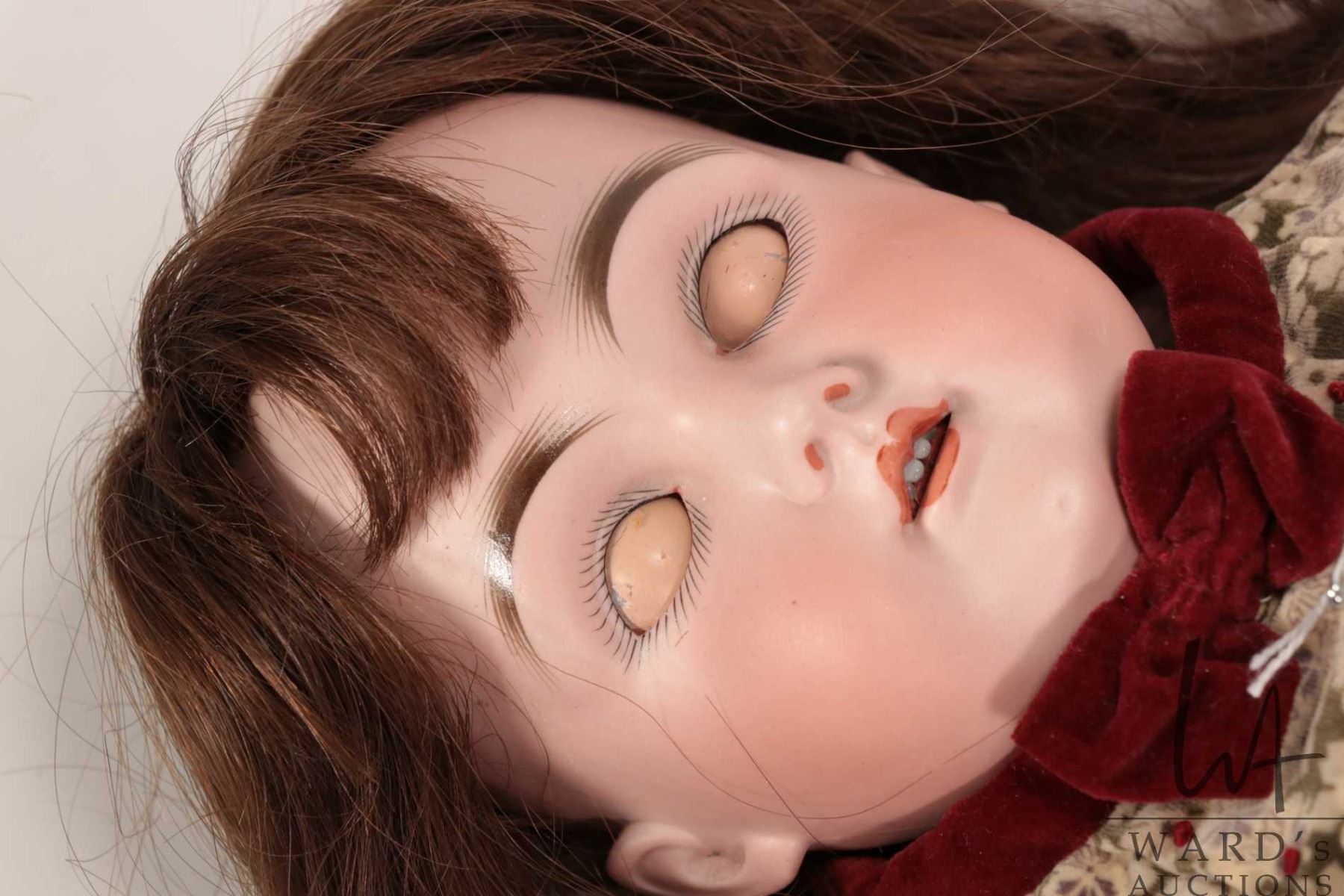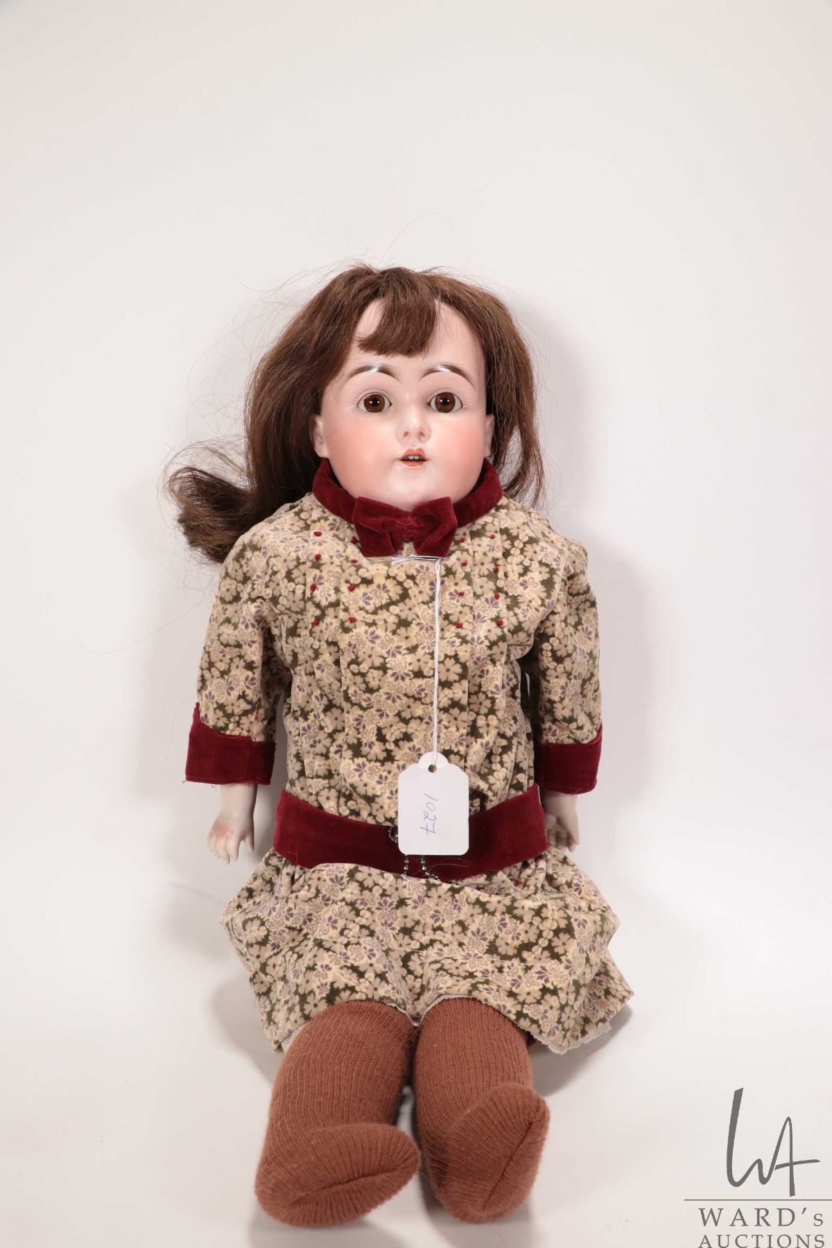 Antique bisque head doll with glass sleep eyes, and open mouth, leather body and bisque hands, human hair wig, 20" in height. No cracks seen to bisque Note: Viewing in person recommended. Buyer must satisfy themselves as to condition