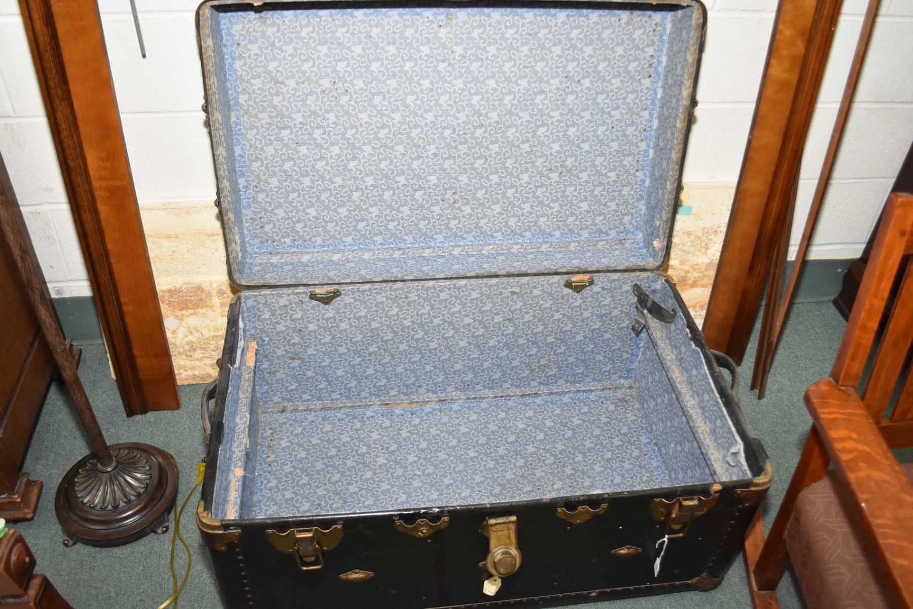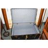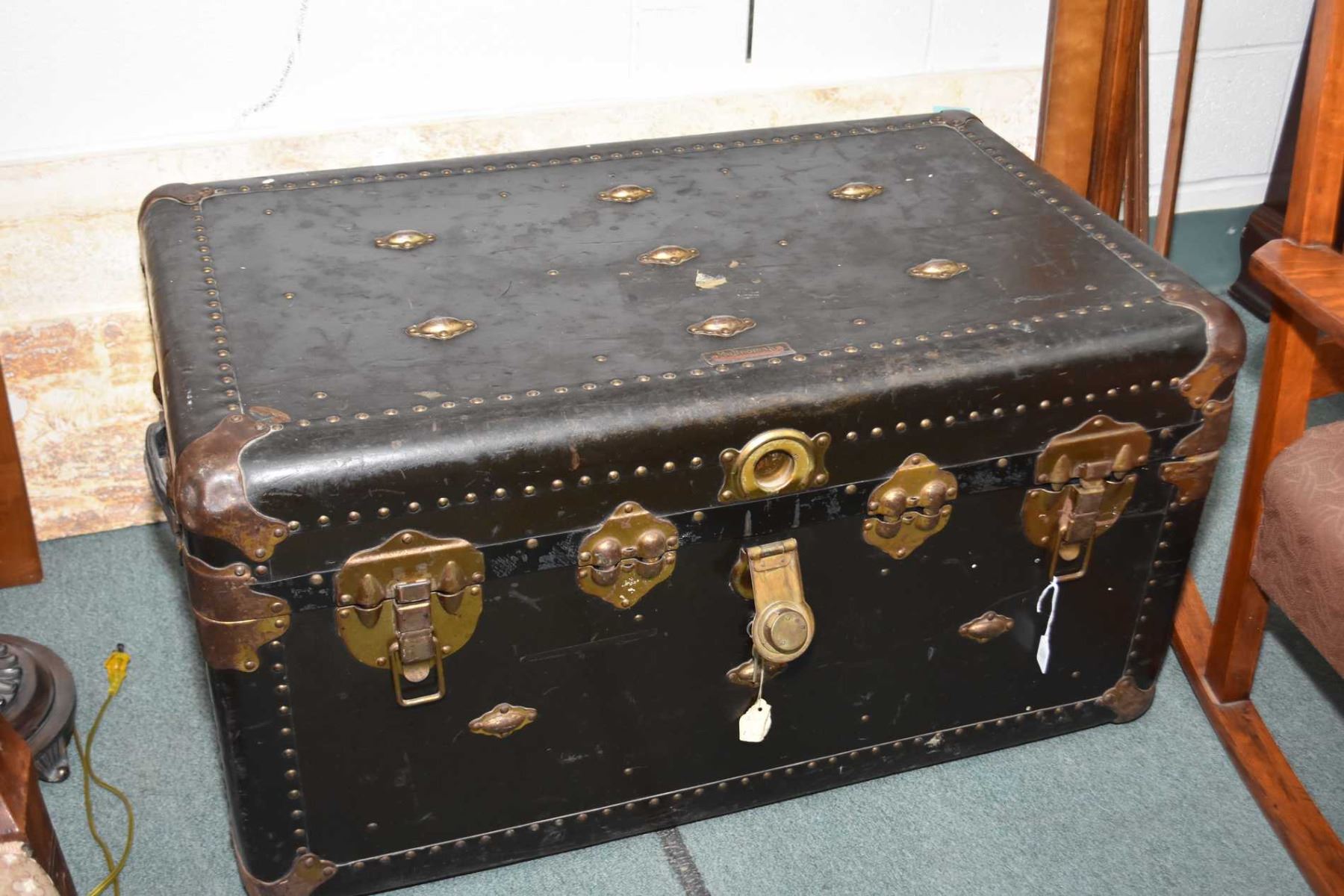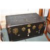 Antique brass bound metal steamer trunk with enamelled brass label Multnomah Baggage man proof