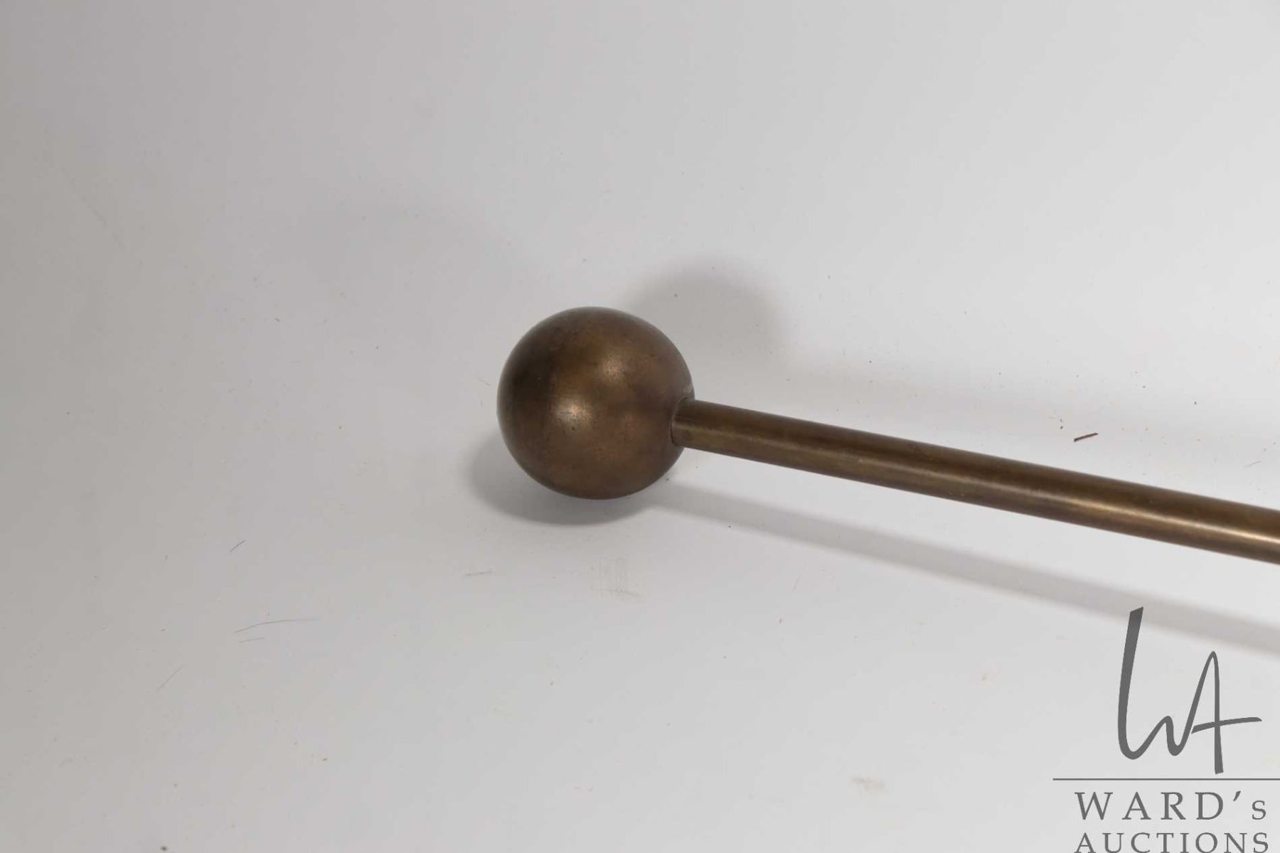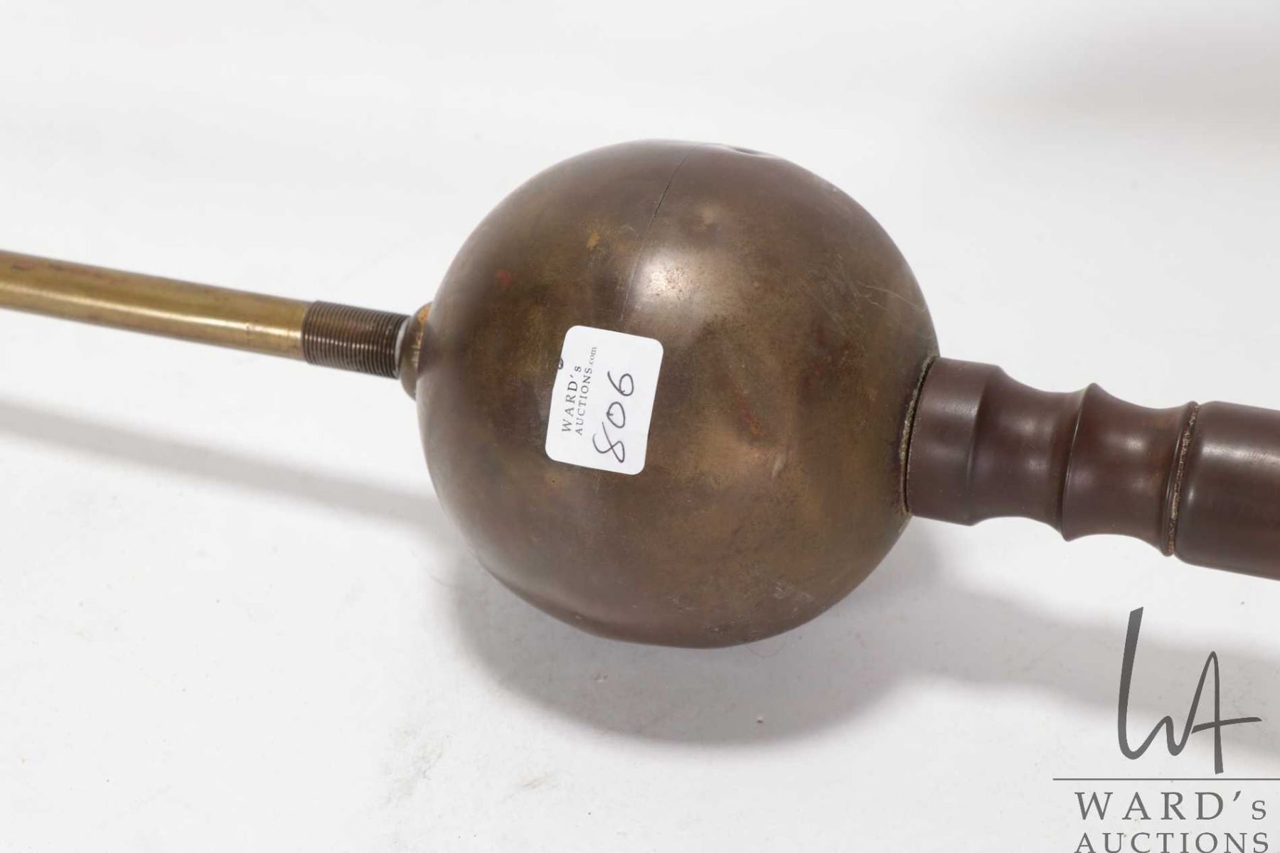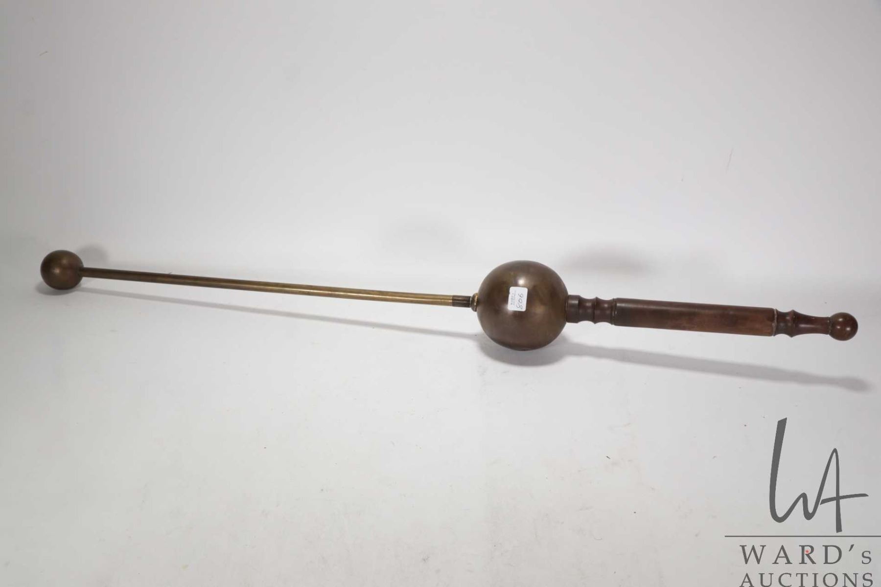 Antique brass instrument with heavy weighted ball on one end, large brass float and wooden handle. Consignor purports it is an instrument for generating electricity. We believe it to be a hydrometer of unconfirmed usage, 37" in length