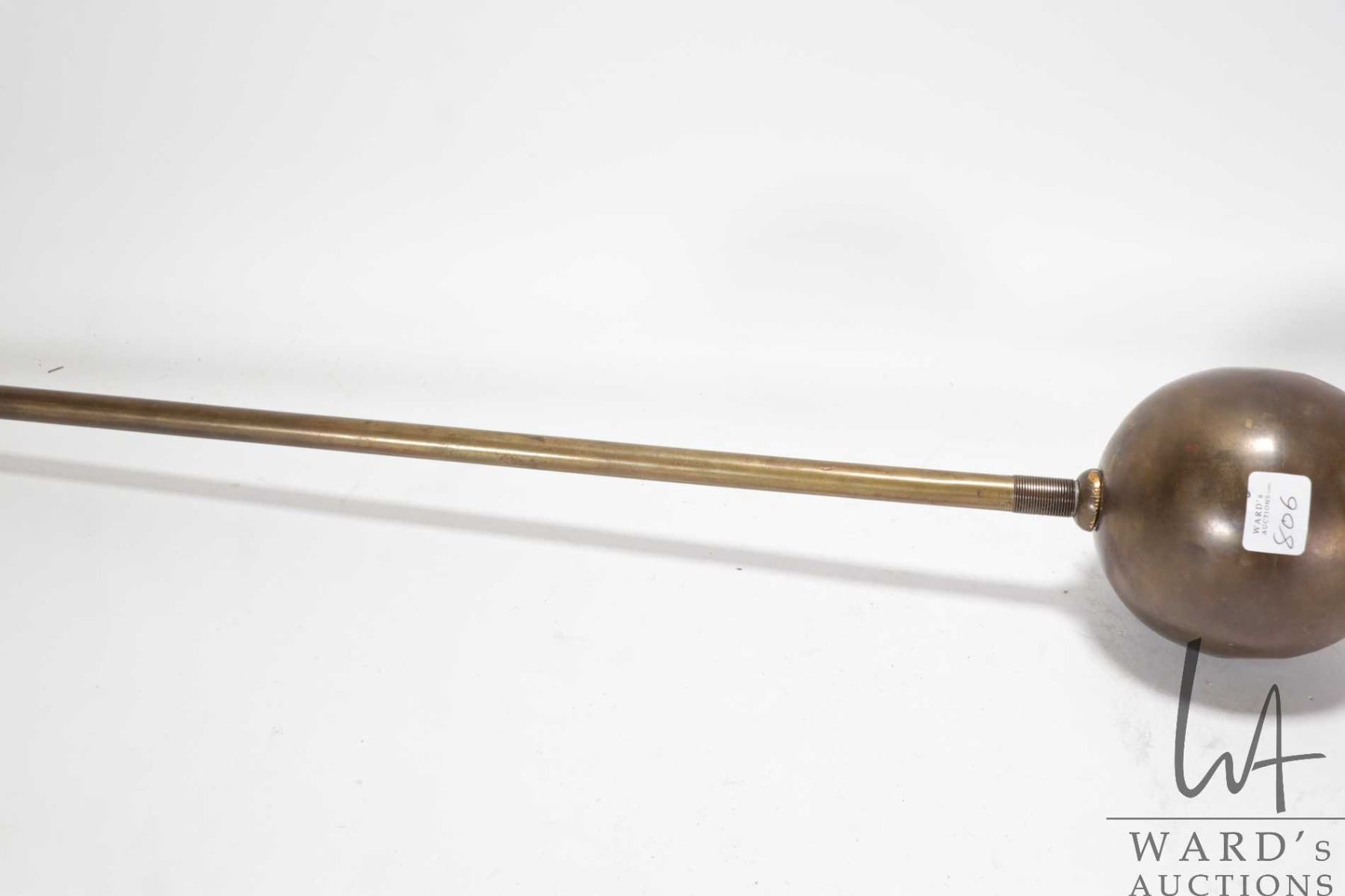 Antique brass instrument with heavy weighted ball on one end, large brass float and wooden handle. C