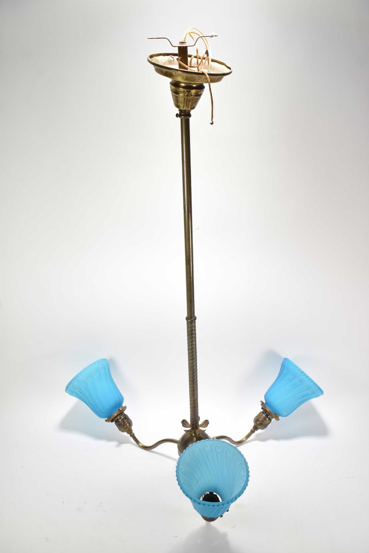 Antique brass three branch 36" ceiling fixture with blue satin glass shades