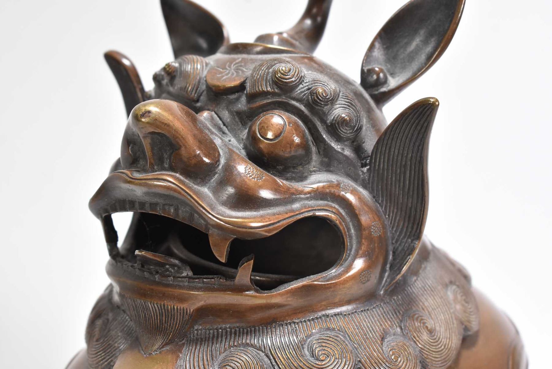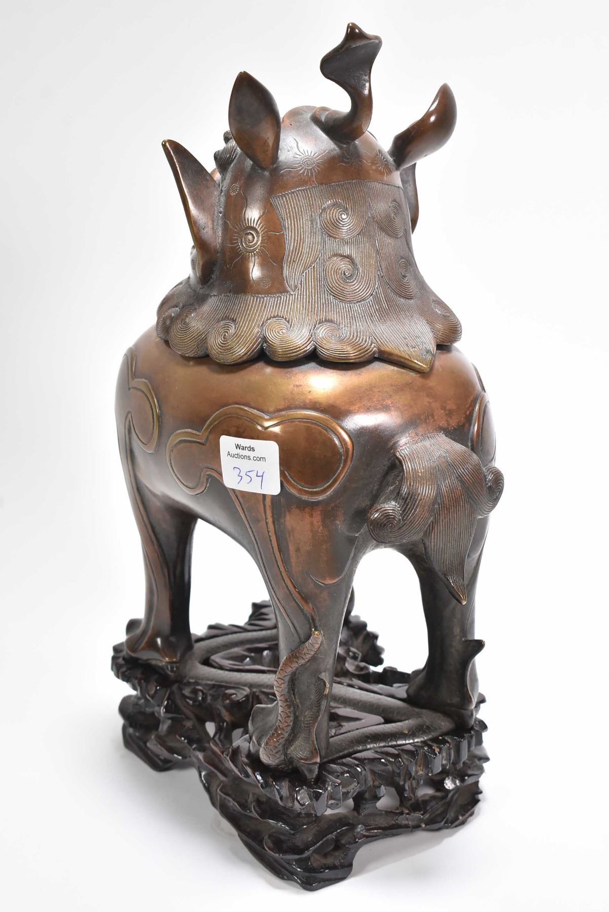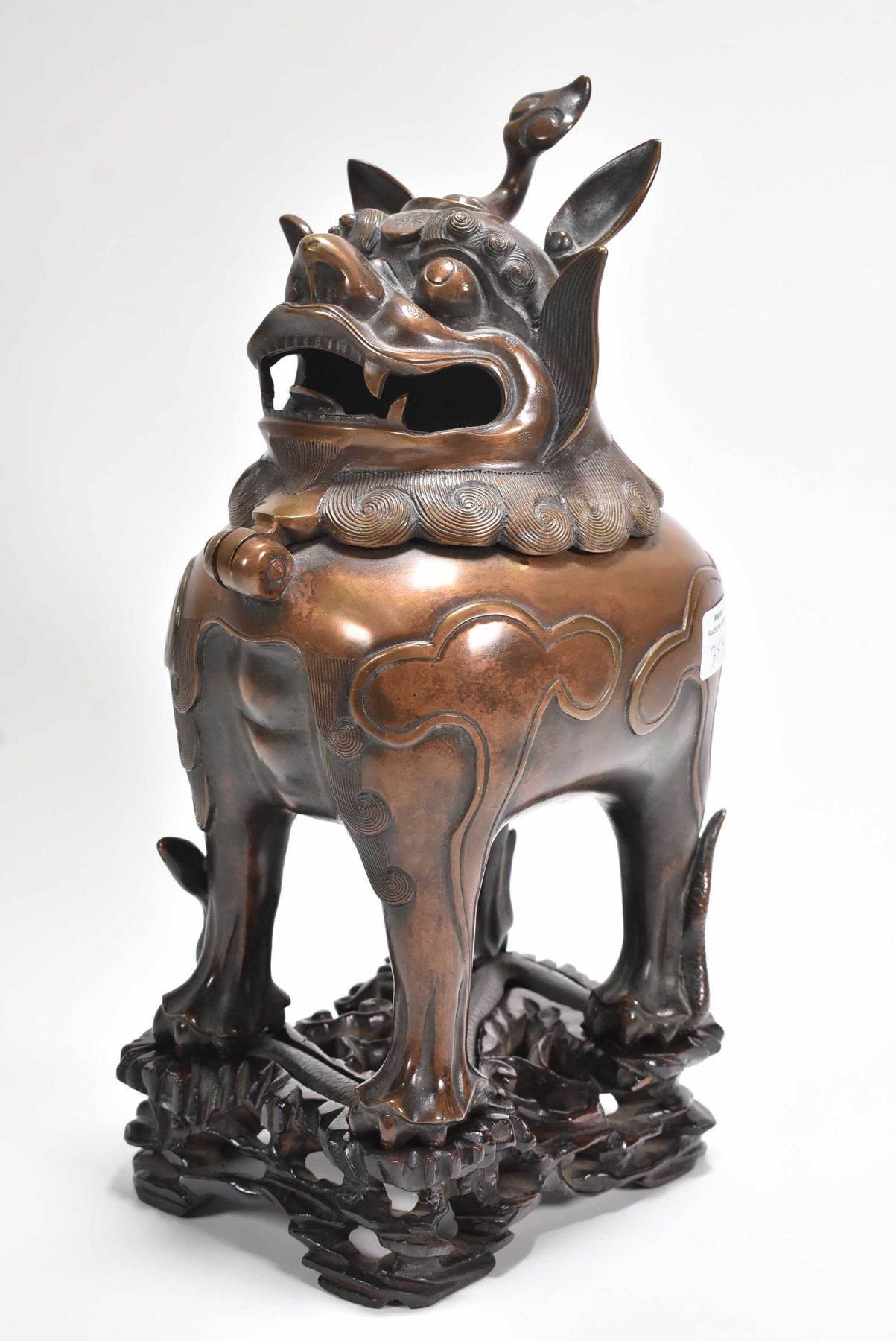 Antique bronze foo dog incense burner with hinged lid, original removable burner and original fitted wooden base, 12" in height