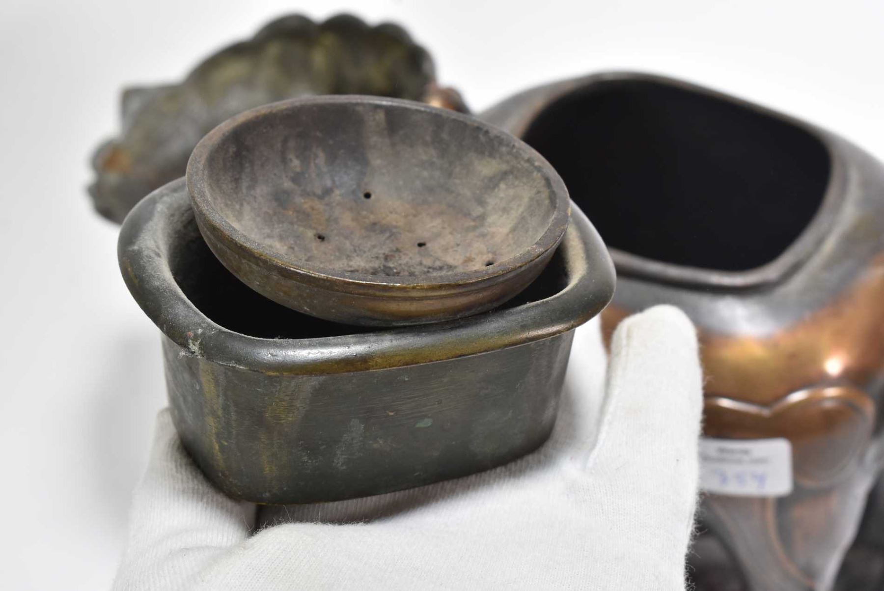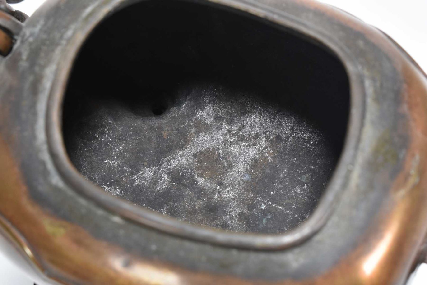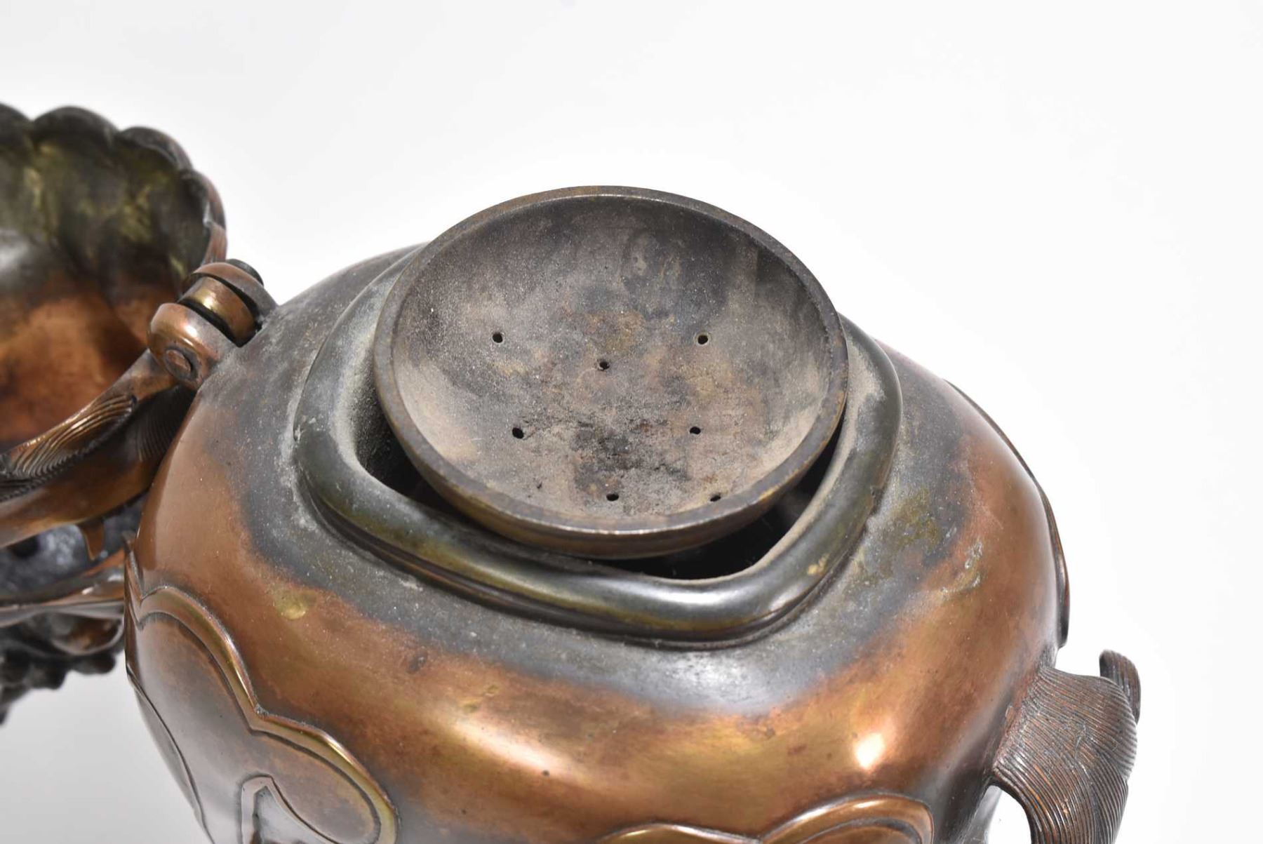 Antique bronze foo dog incense burner with hinged lid, original removable burner and original fitted wooden base, 12" in height