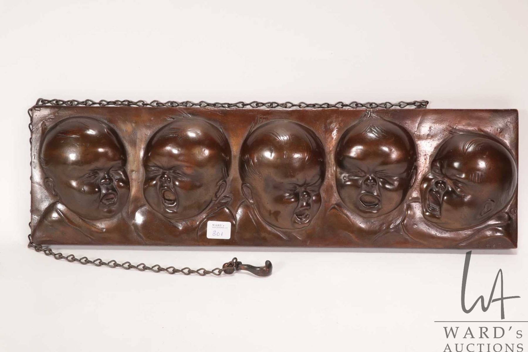 Antique bronze hanging plaque featuring the Dionne Quintuplets as babies, signed E. Romeo, note: missing part of hanging chain 6" X 21"