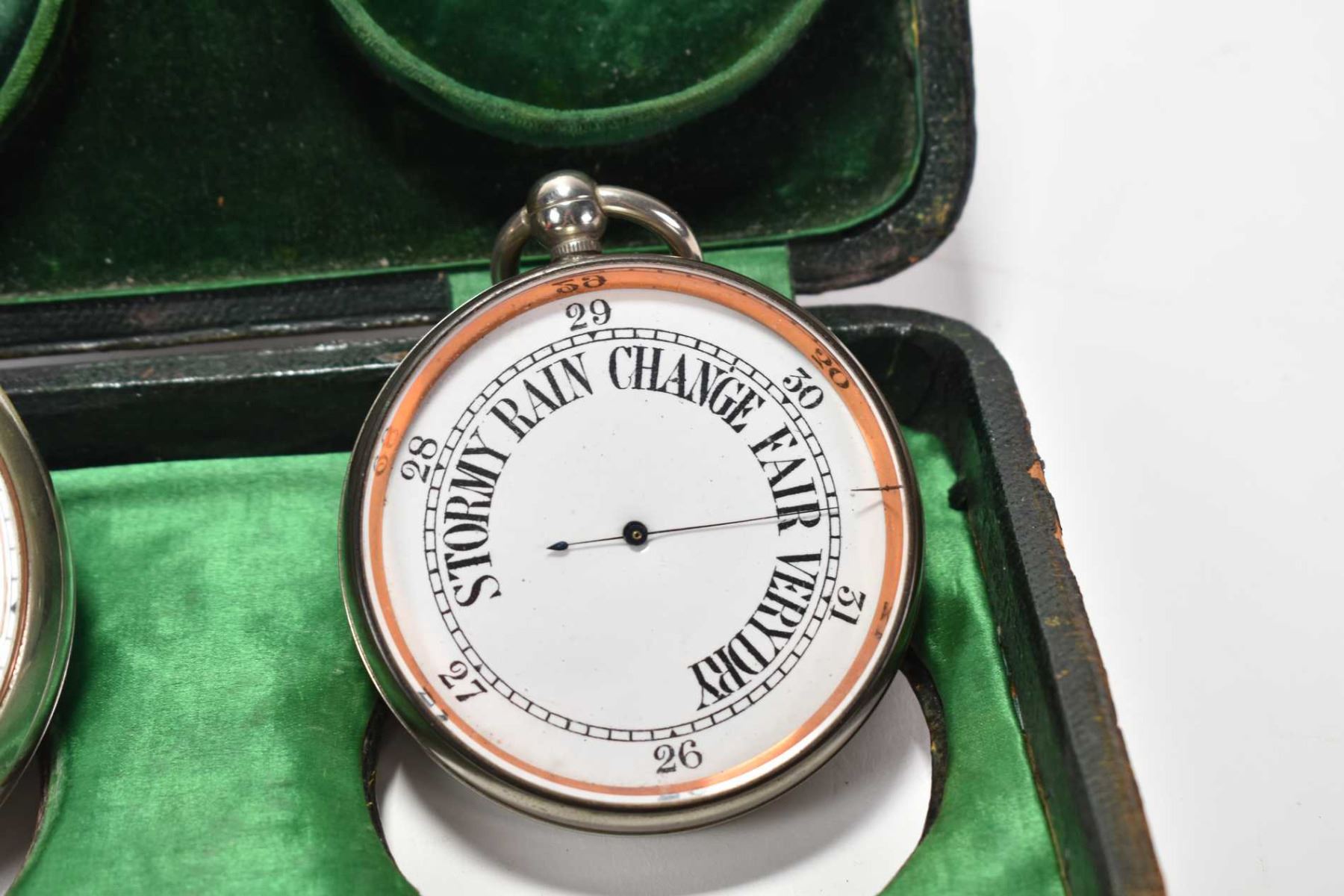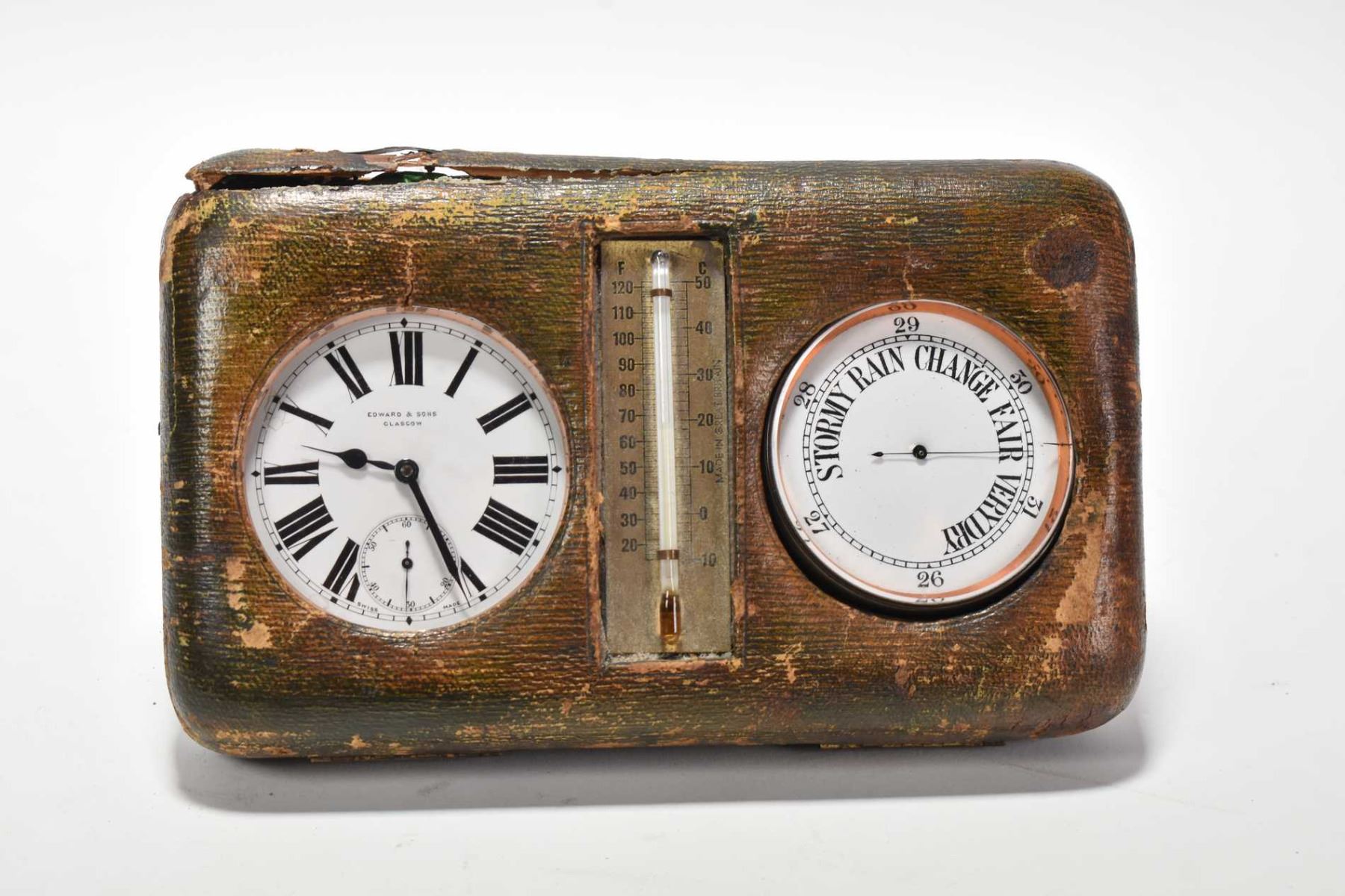 Antique cased travel barometer and pocket watch compendium labelled by Edward and Sons, Glasgow including large pocket watch with Swiss movement trying to work at time of cataloguing plus barometer and leather case with attached thermometer