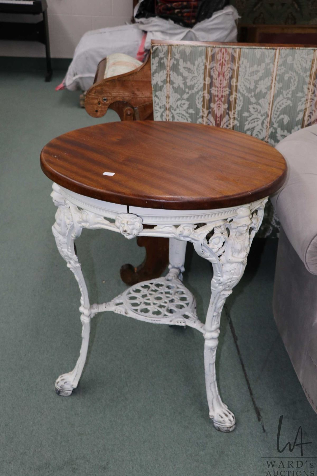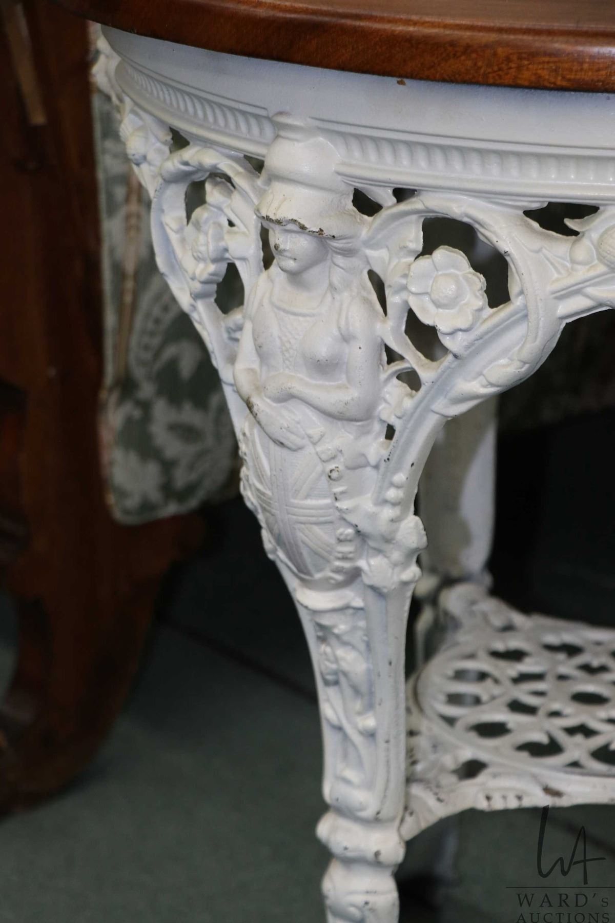 Antique cast iron English made Biclam garden table figural Britannia legs on raised lions paw feet and round wooden top, 30" H X 26" D