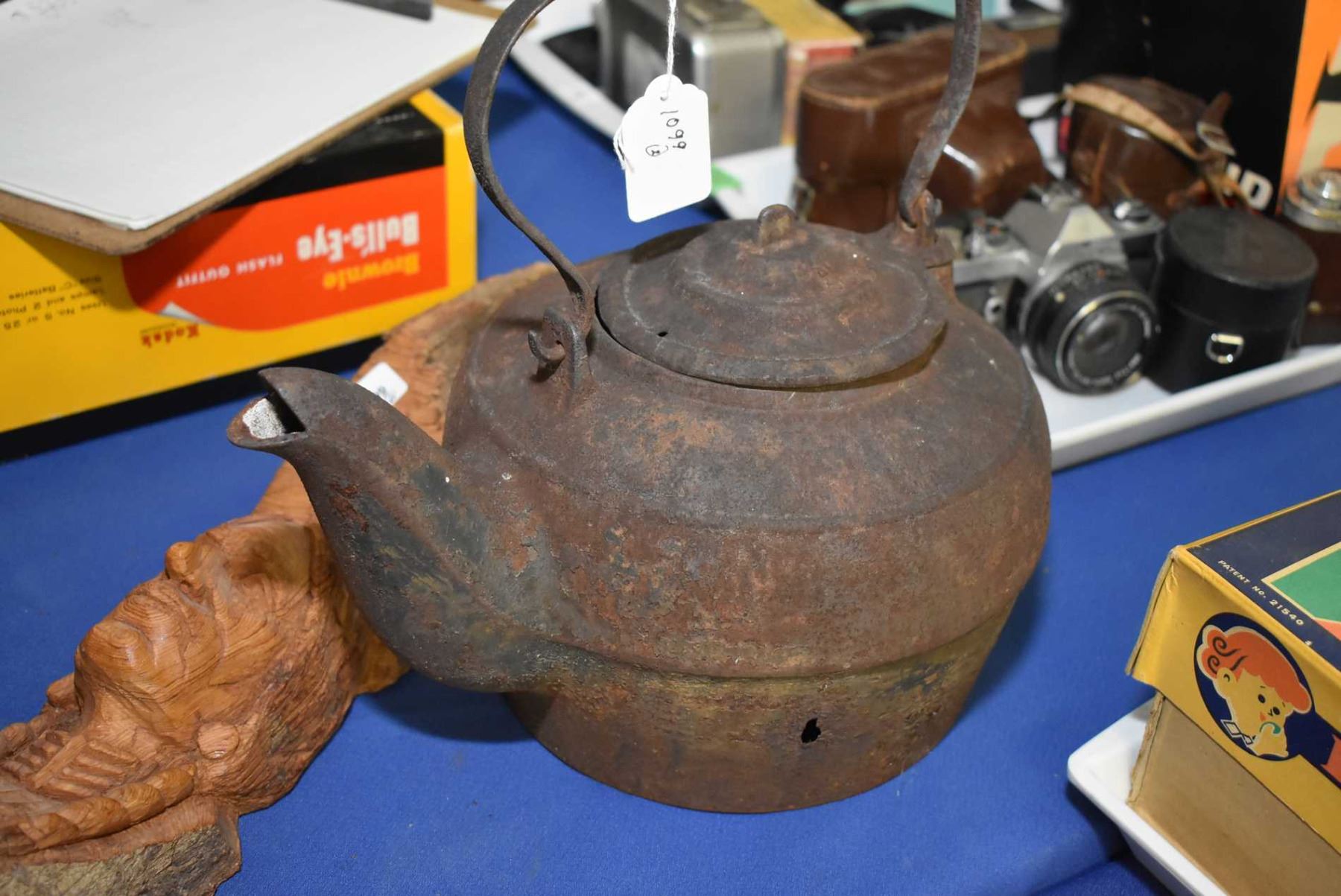 Antique cast iron water kettle and a carved wooden Indian bust signed by artist K. Kaiser