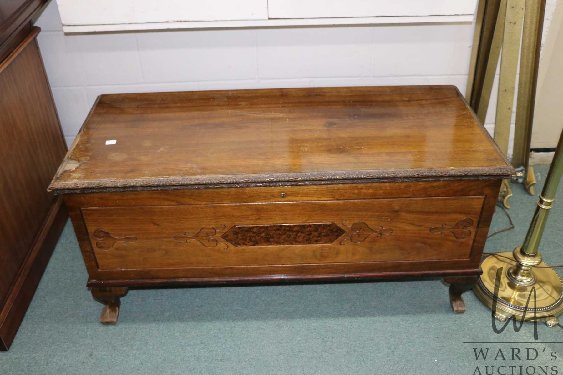 Antique cedar lined blanket box with original label "Heirloom Chests" note: newspaper lining Edmonton Journal 1933