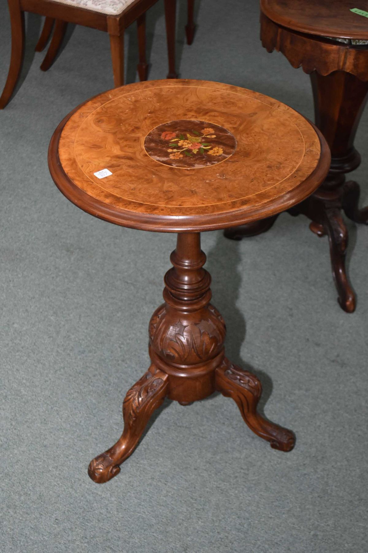 Antique center pedestal wine table with burl and inlaid top, note warpage to top