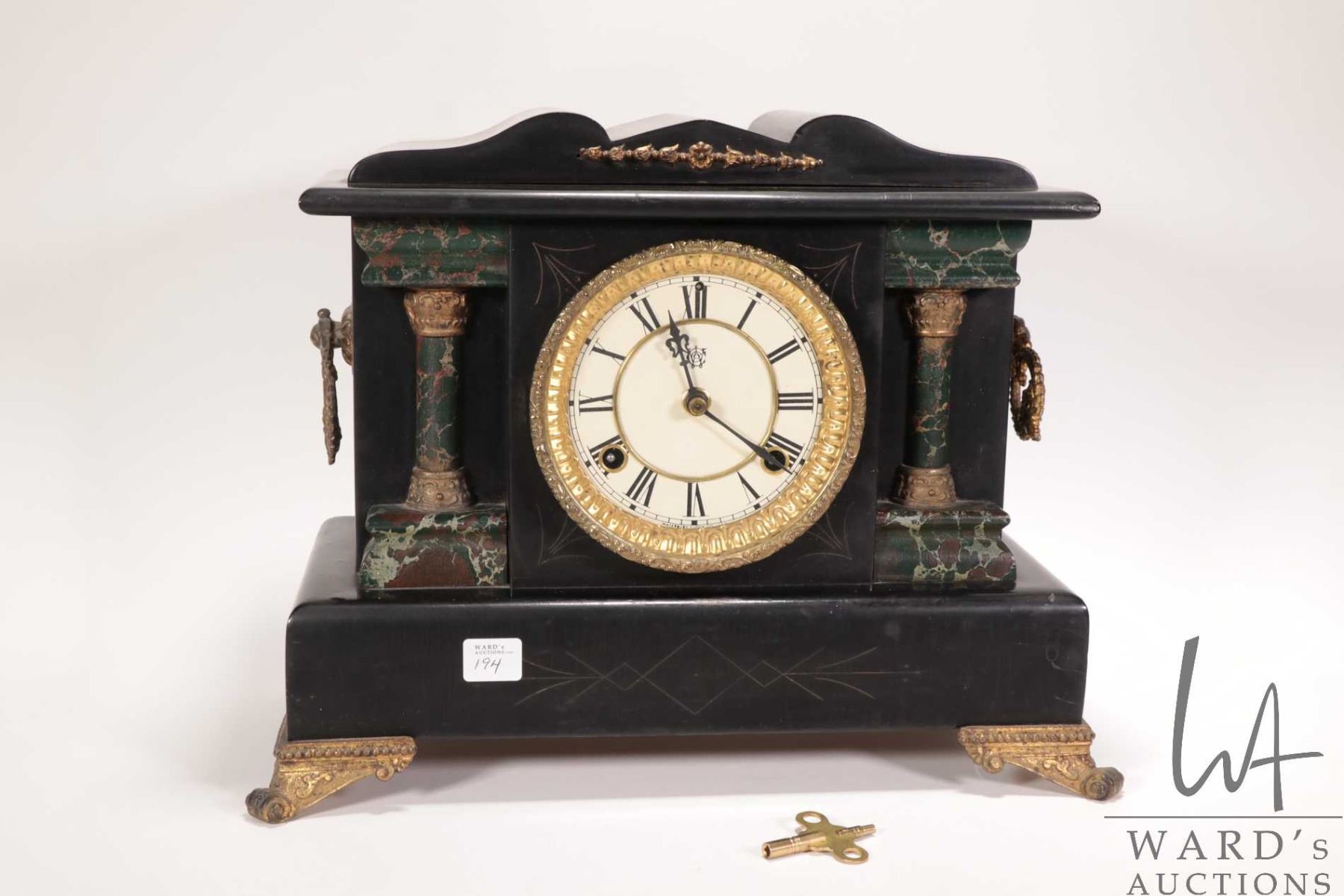 Antique chiming mantle clock with ormolu attachments, made by Waterbury Clock Co., working at time of cataloguing, includes key, 12" H X 15" W X 8" D