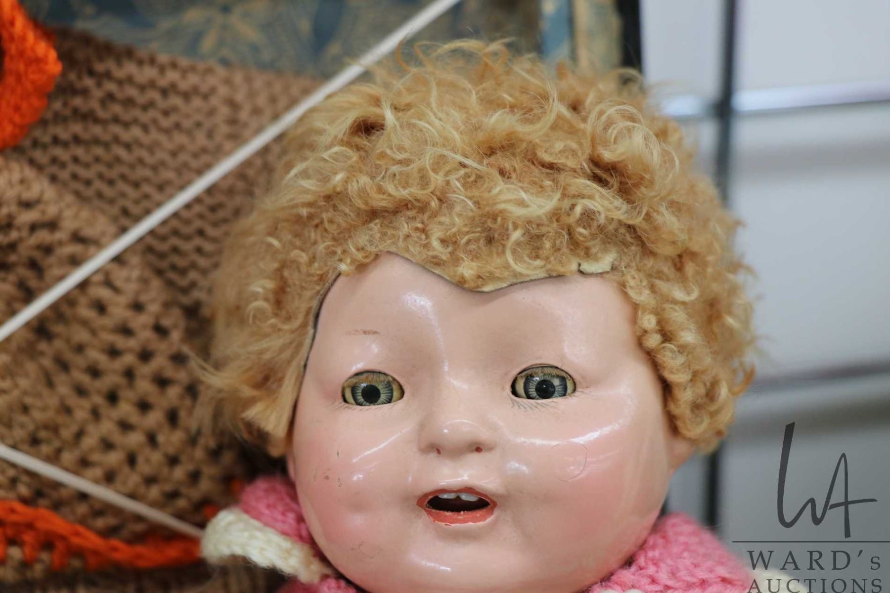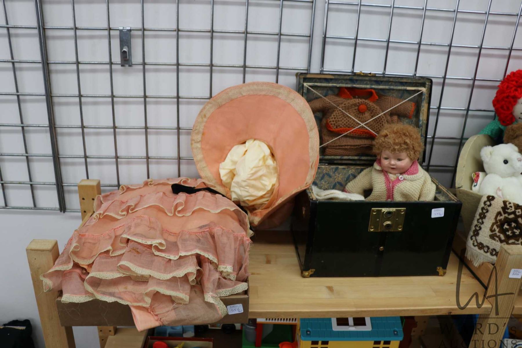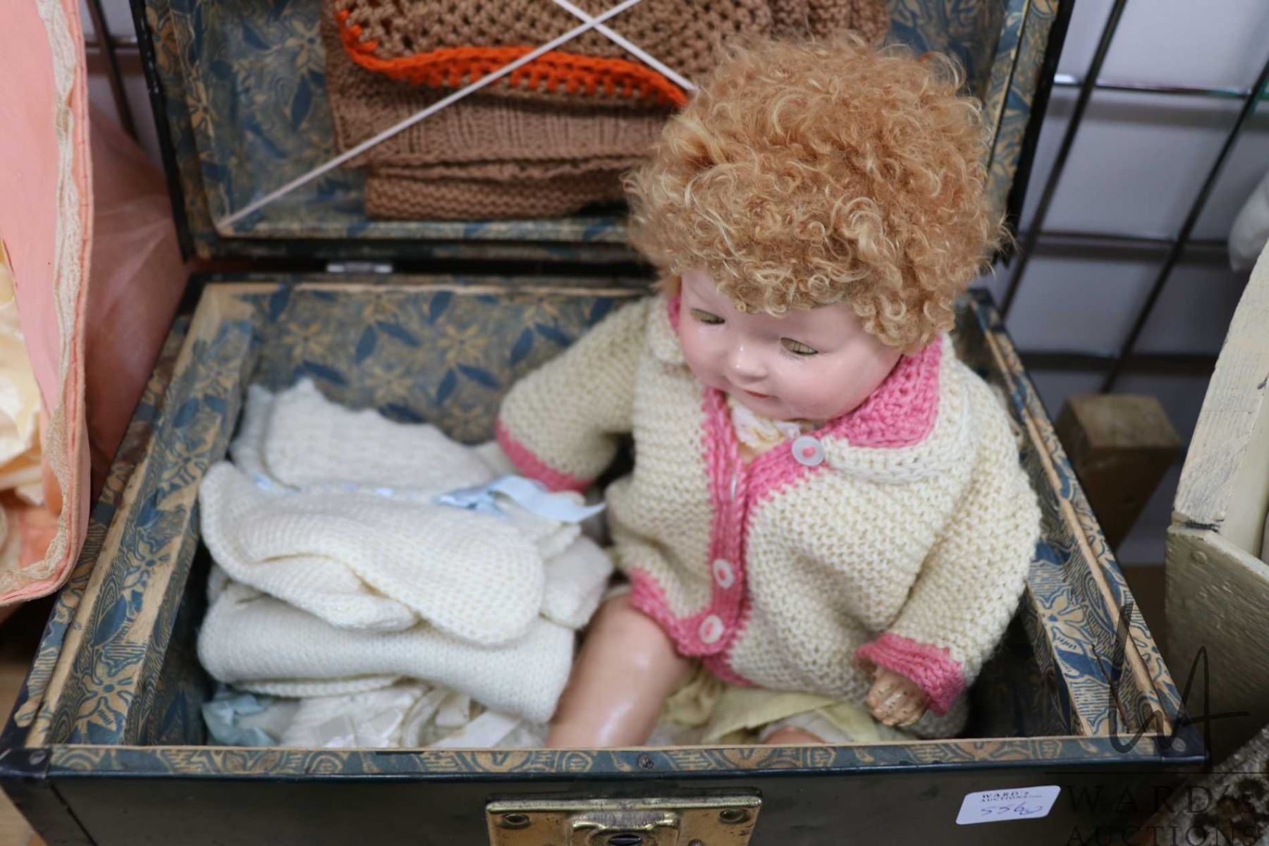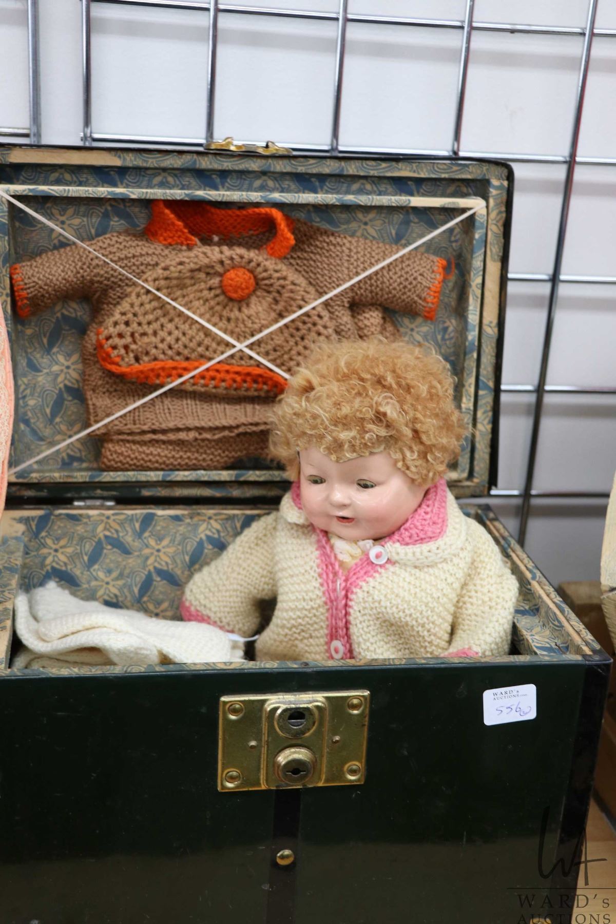 Antique composition dydee type baby doll with sleep eyes and skin wig 15" in length in a metal wrapped doll trunk with removable tray plus a selection of hand made knitted baby/ doll cardigans, boots and hats and a 1930's organdy dress with underslip and matching poke bonnet