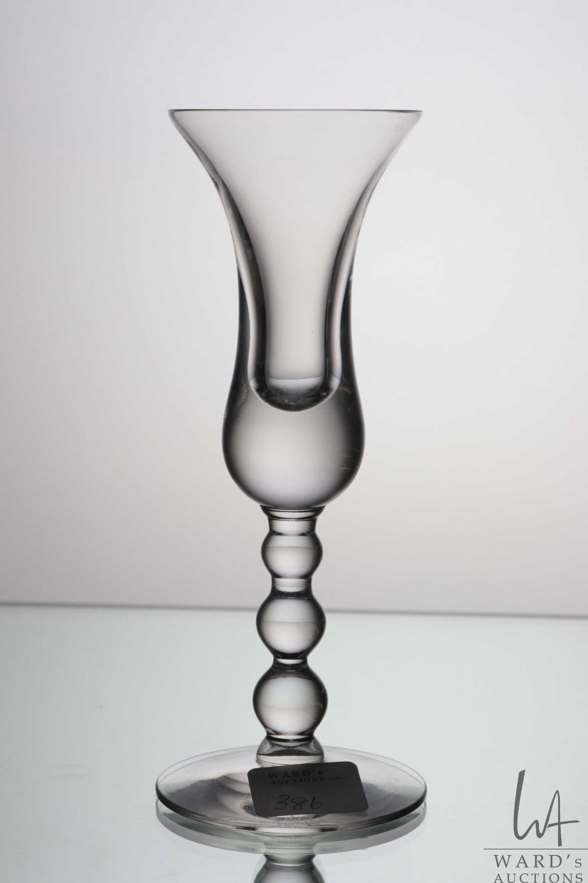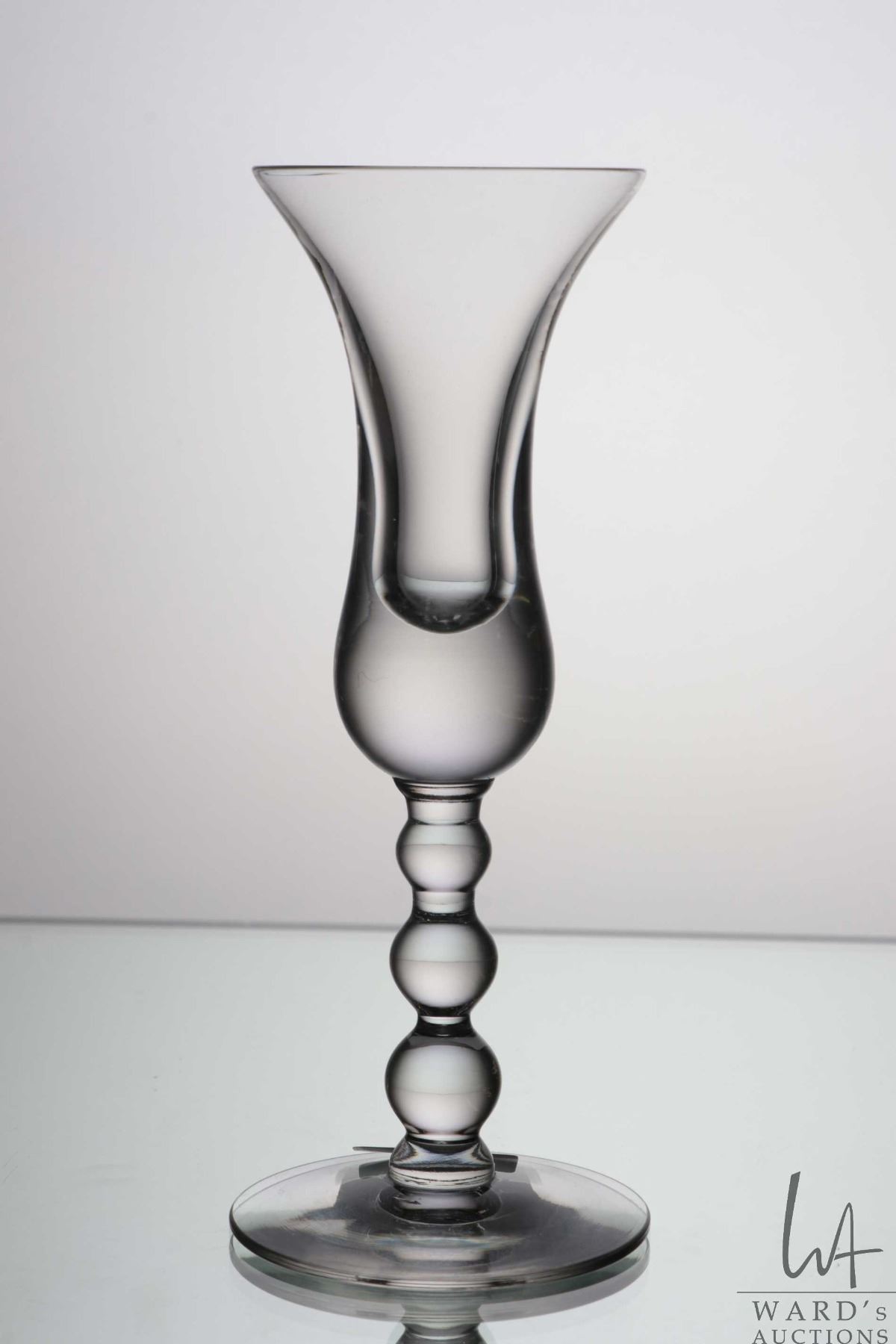 Antique "deceptive" dram toasting glass bell bowl and three knob pressed glass stem and base, 15.5cm