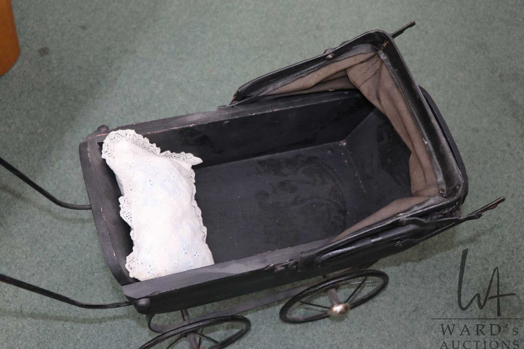 Antique doll pram with oil cloth bonnet, 21" to top of handle