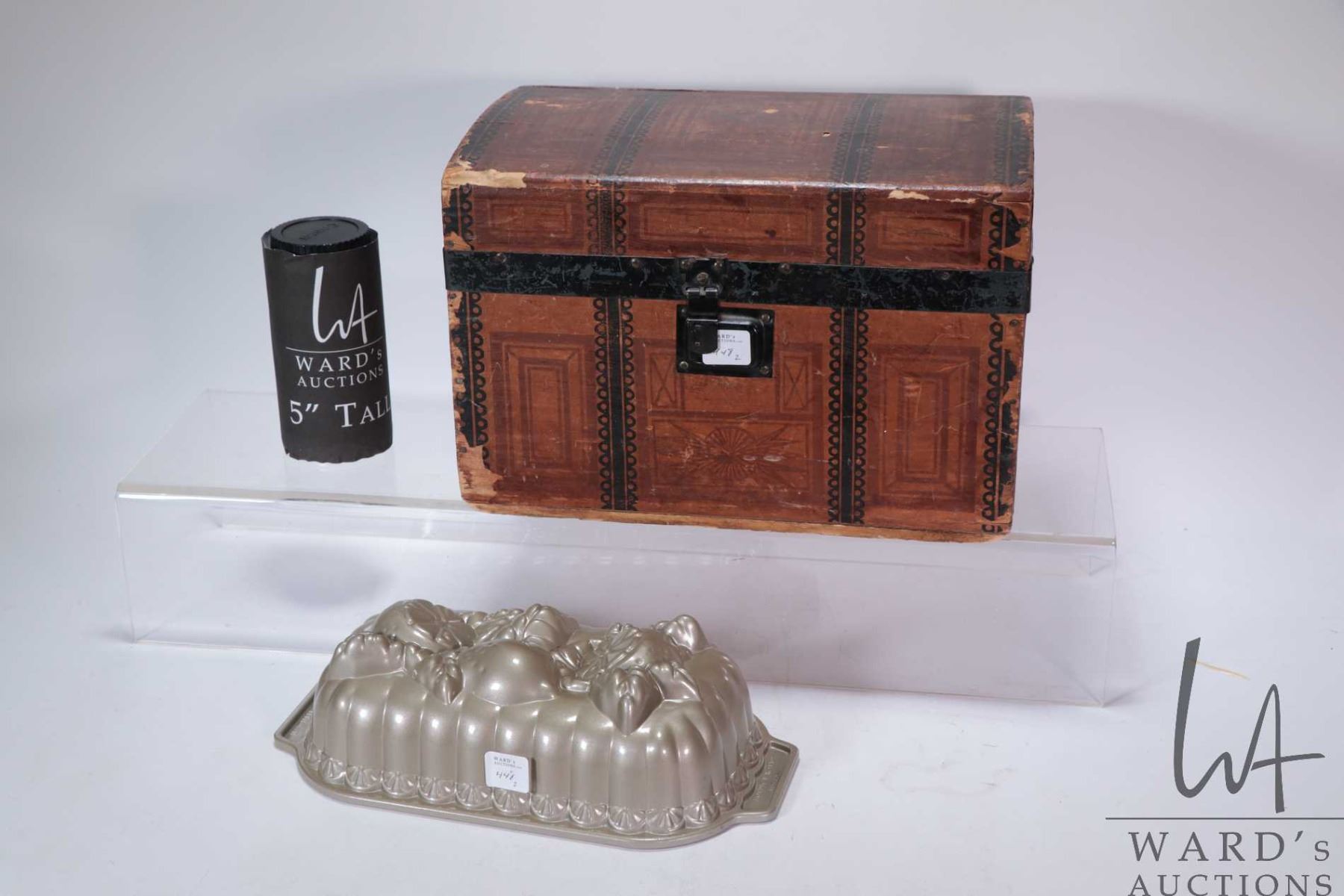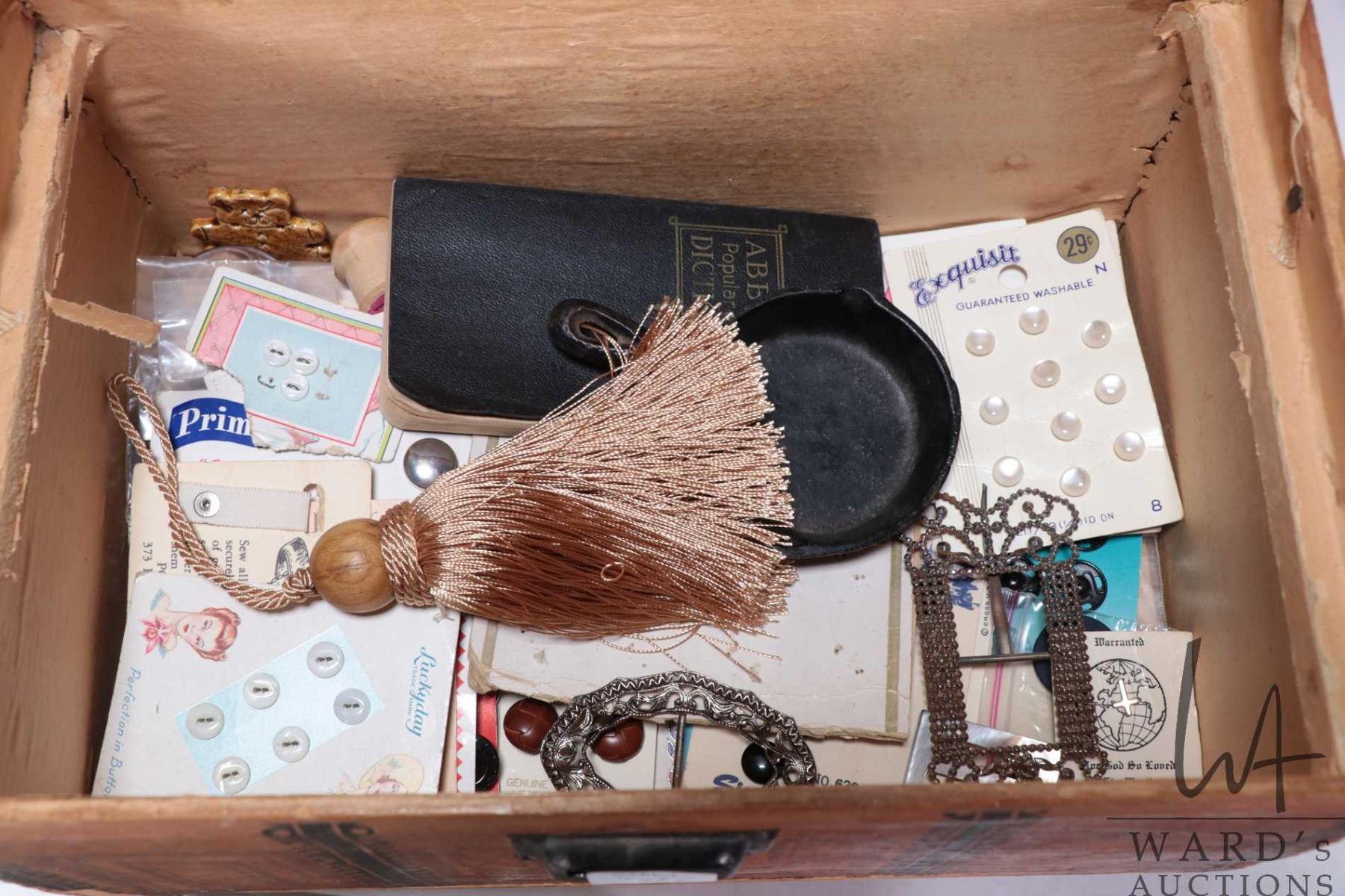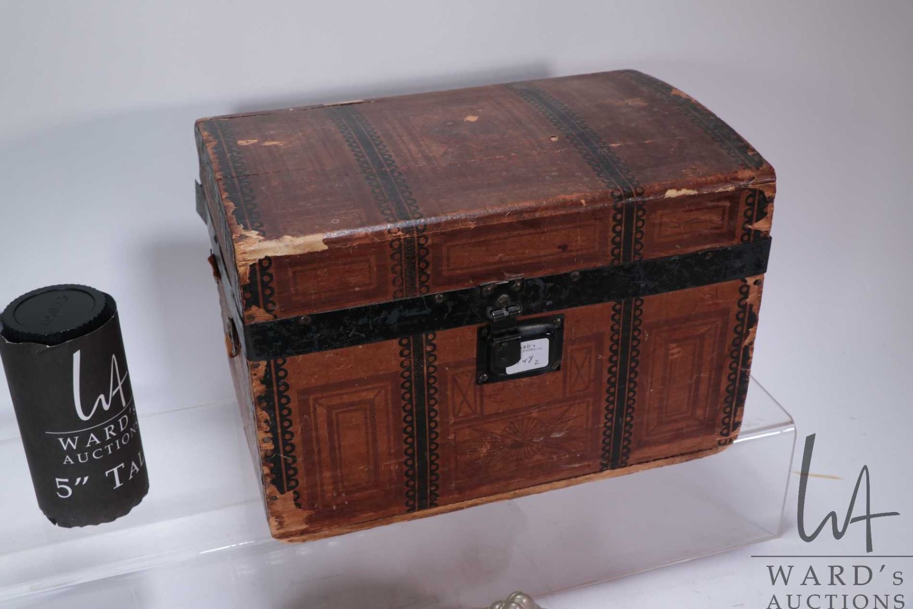 Antique doll trunk, 12" wide X 8" high X 7 3/4" and contents including French made steel buckles, small mother-of-pearl buttons, cast pan, Abbott's dictionary plus a lemon cake mold etc.