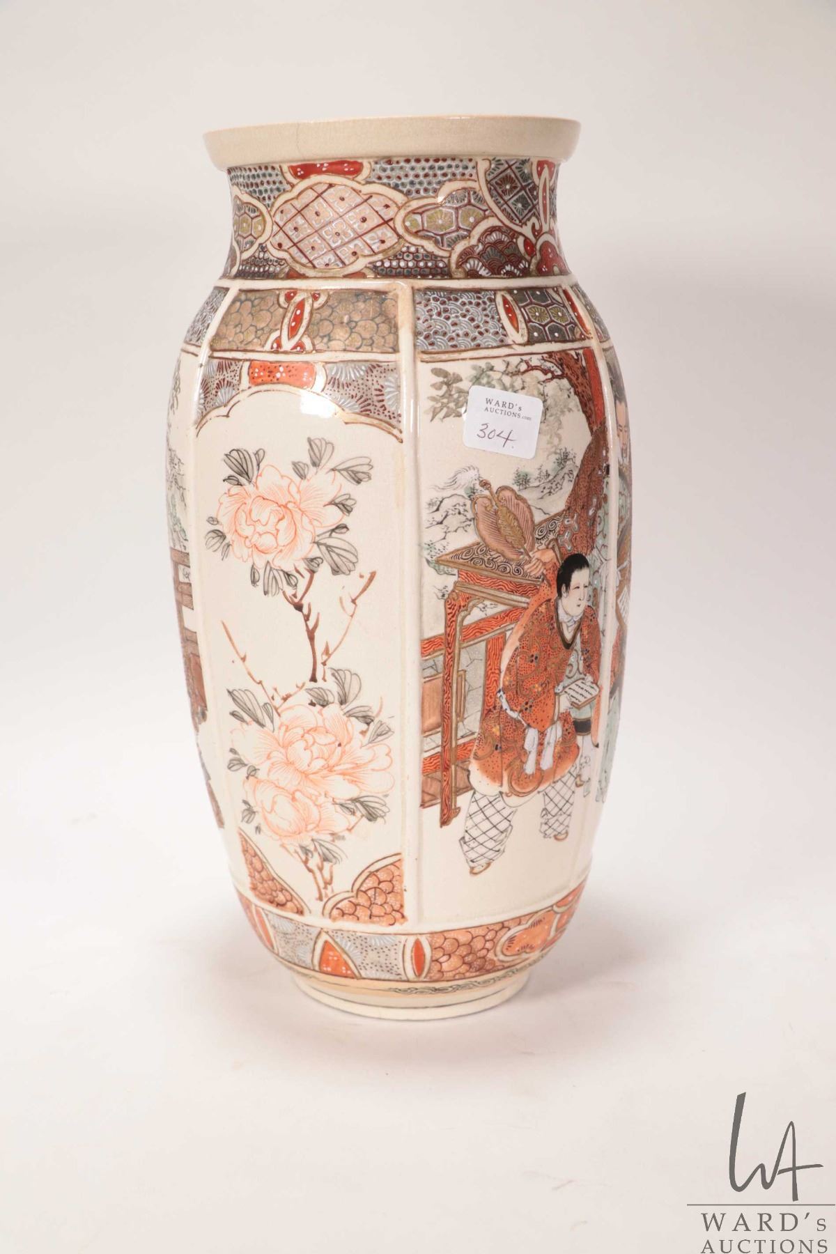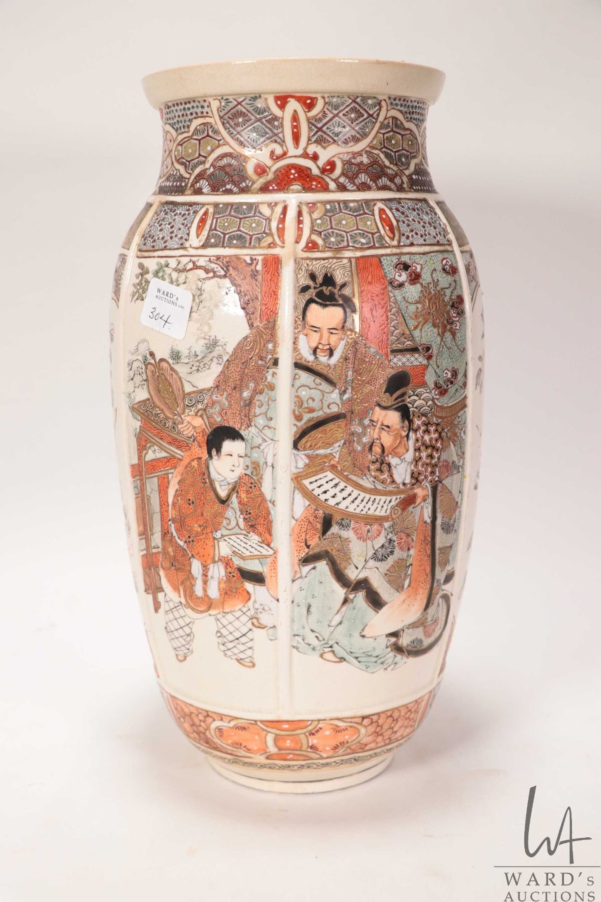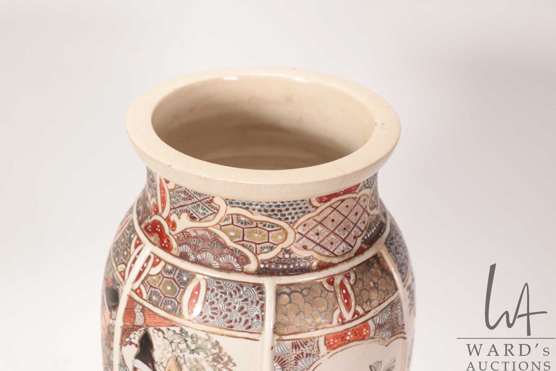 Antique earthern ware, hand painted Japanese Satsuma vase with figural and flower panels, 12" in hei