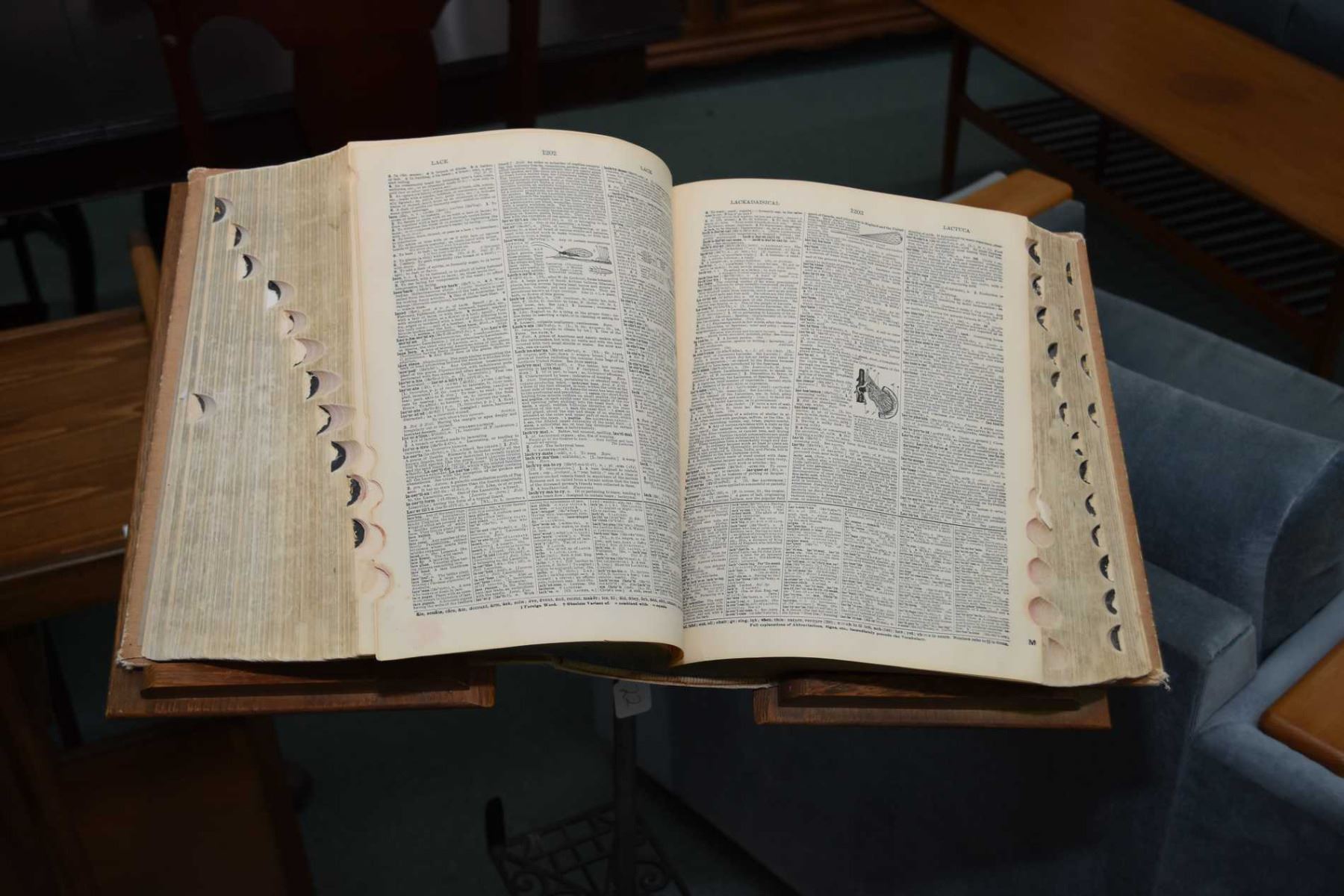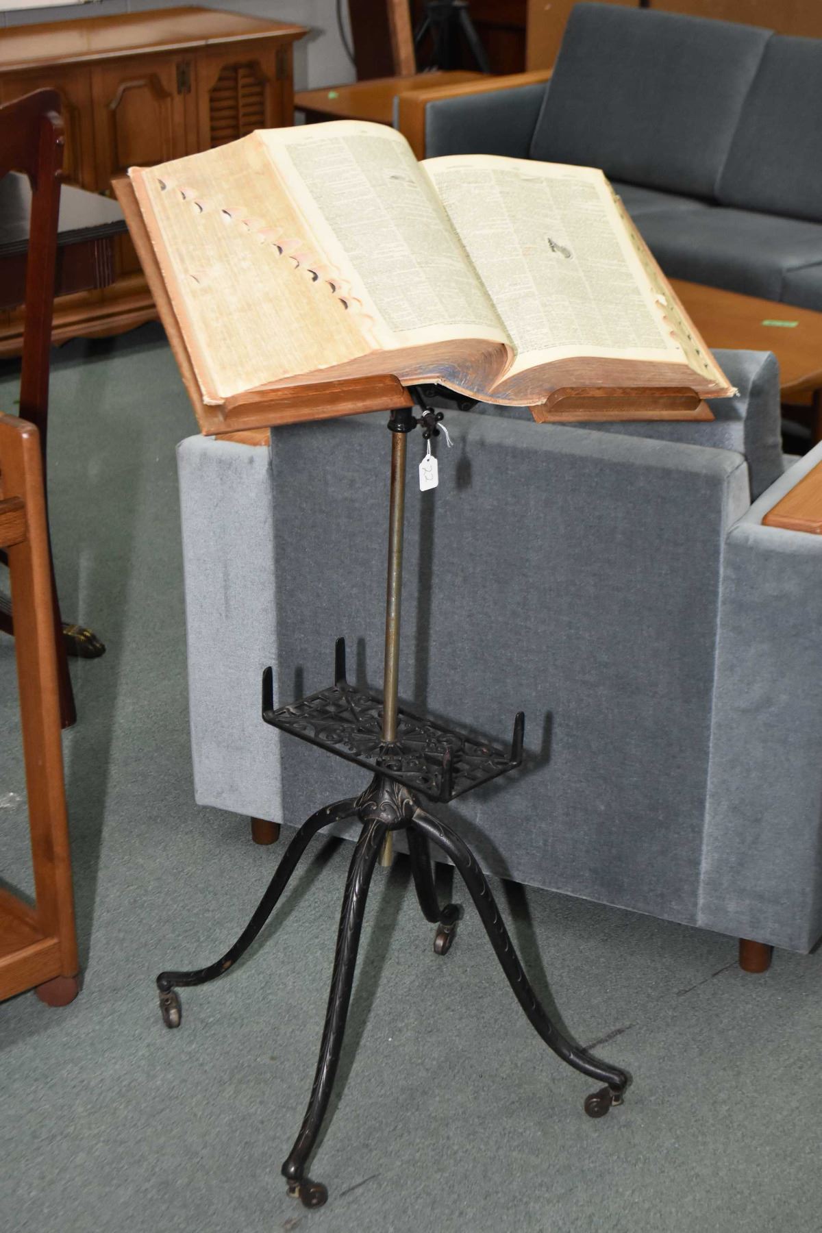 Antique encyclopaedia/bible stand with four leg cast base and fully adjustable mechanism with oak platforms