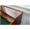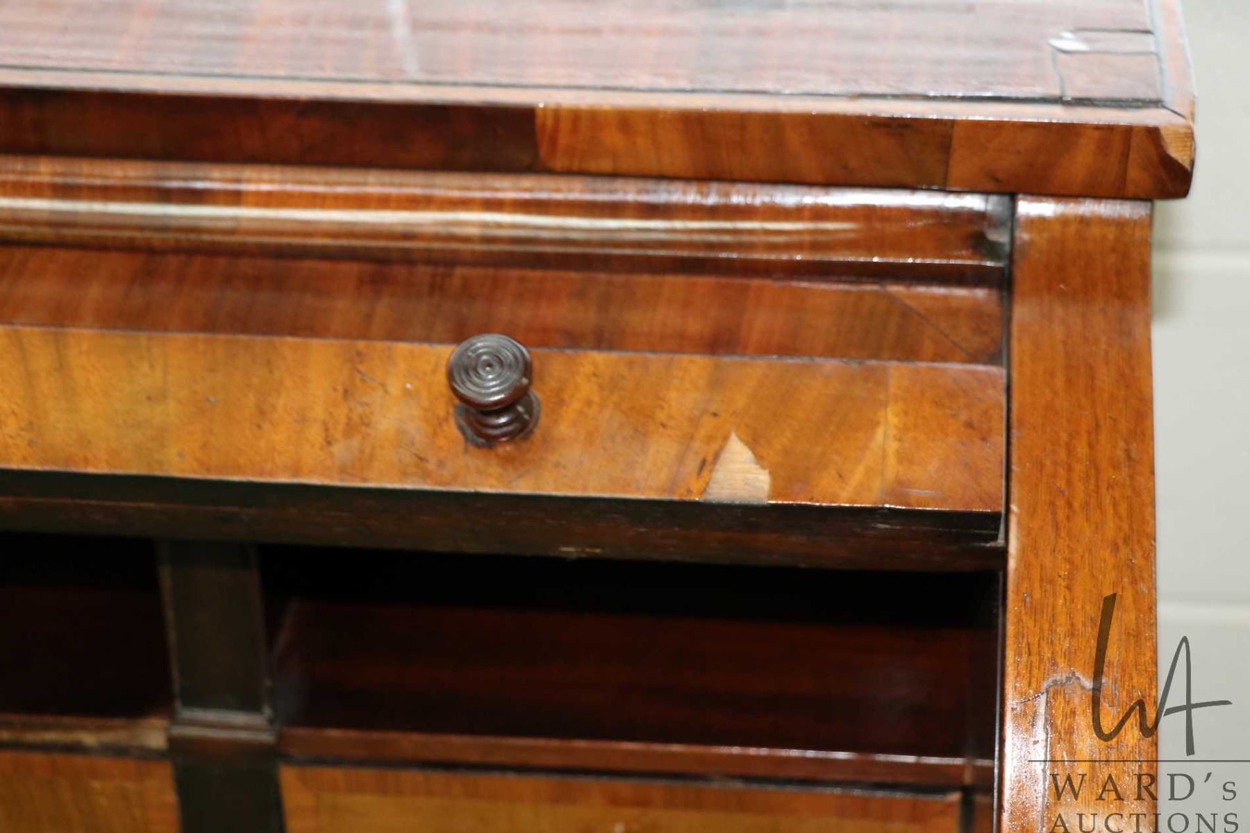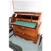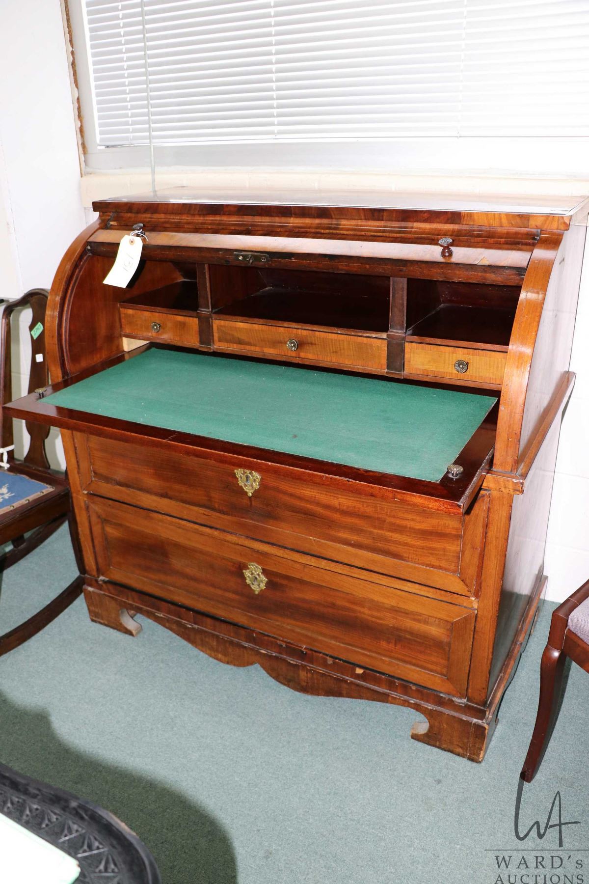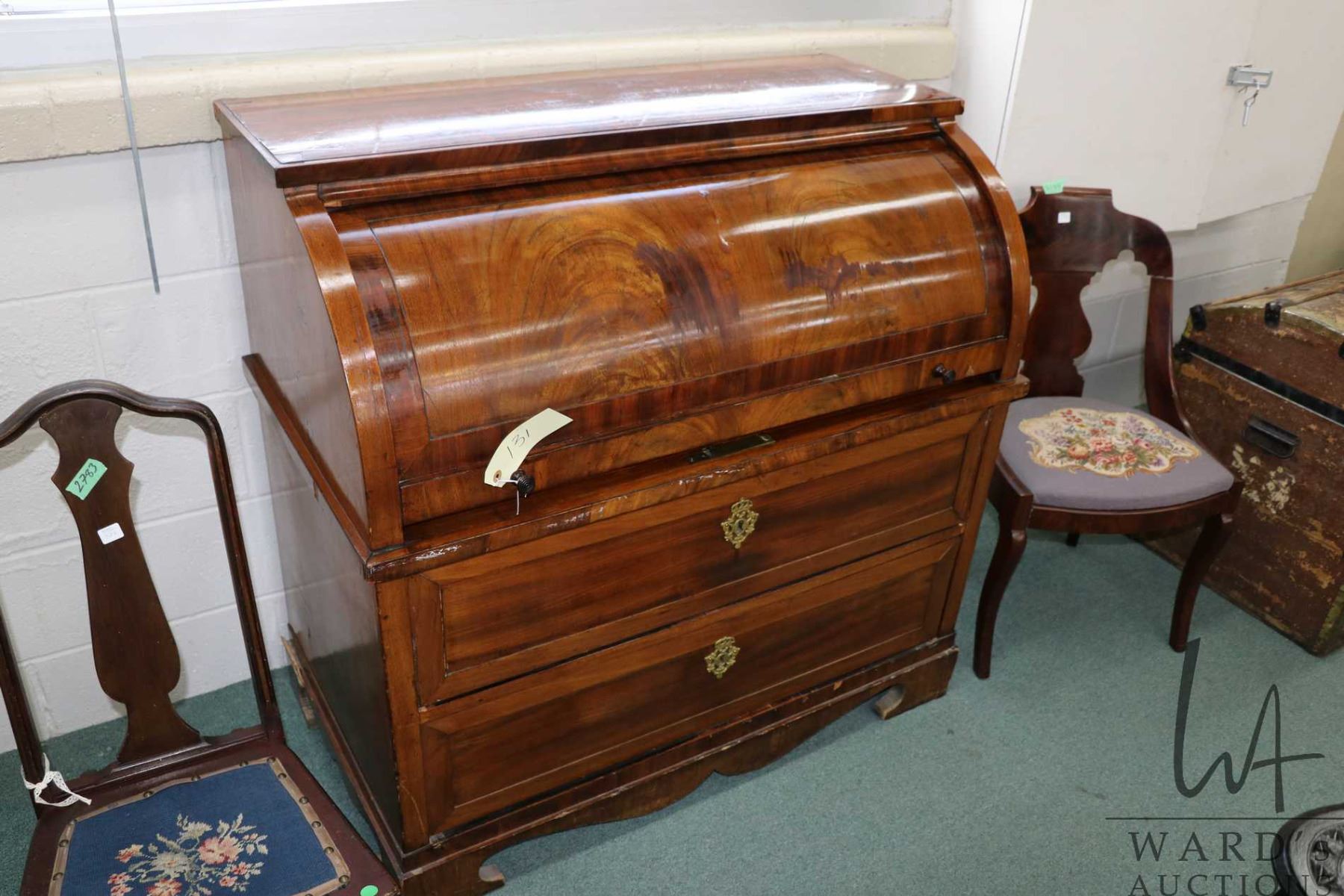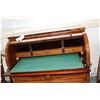 Antique flame mahogany cylinder desk with pull out writing surface and fitted interior, note: cylinder a bit sticky and will need some adjustment, 42" H X 43" W X23" D
