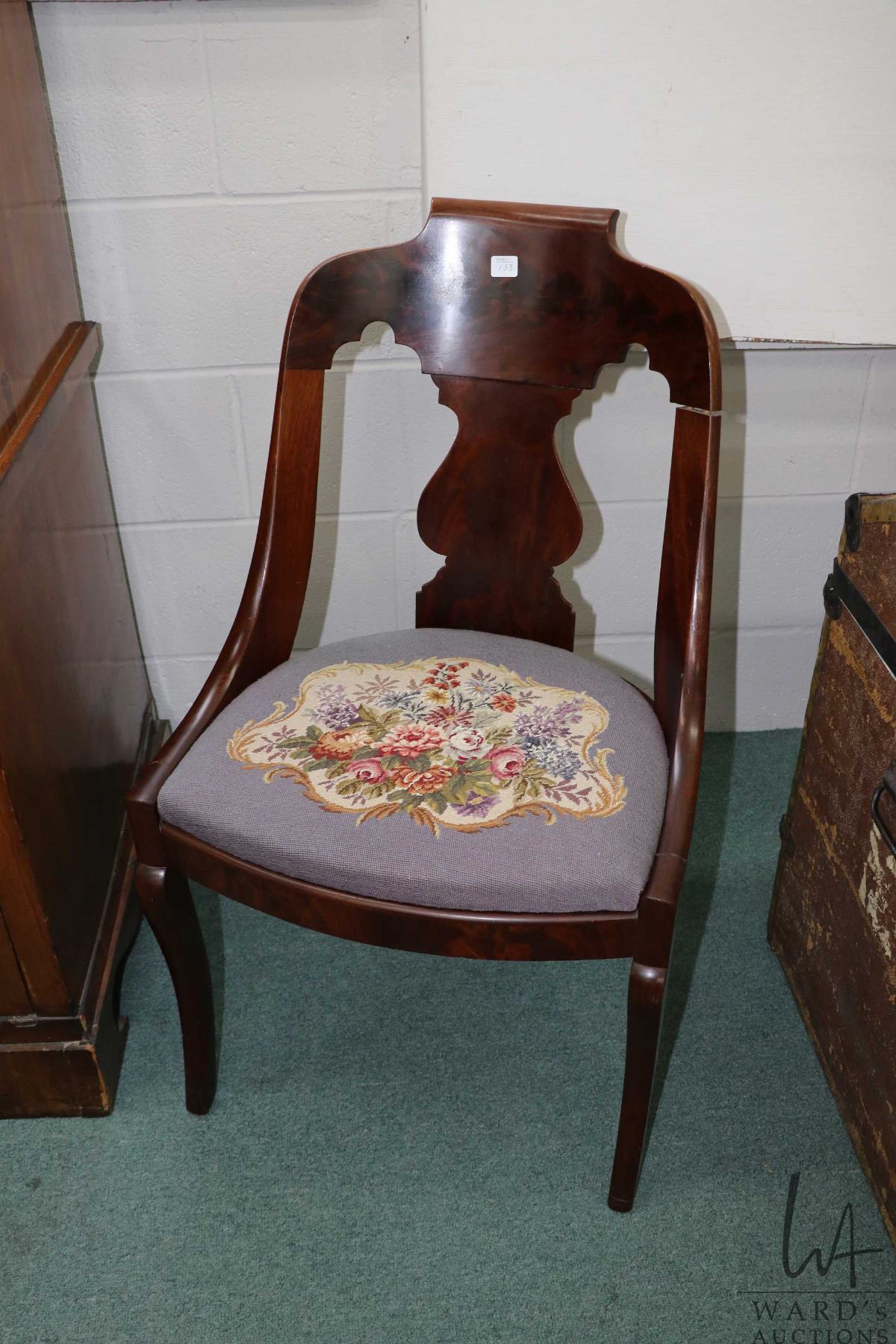 Antique flame mahogany side chair with needlepoint upholstered seat
