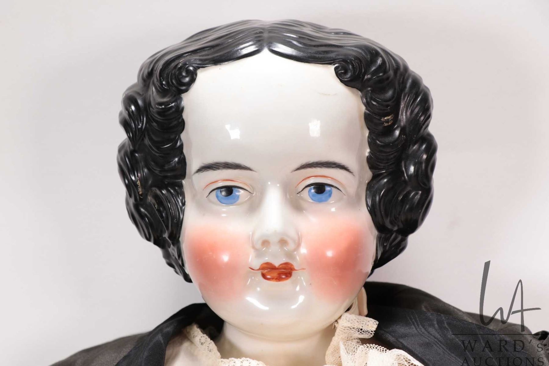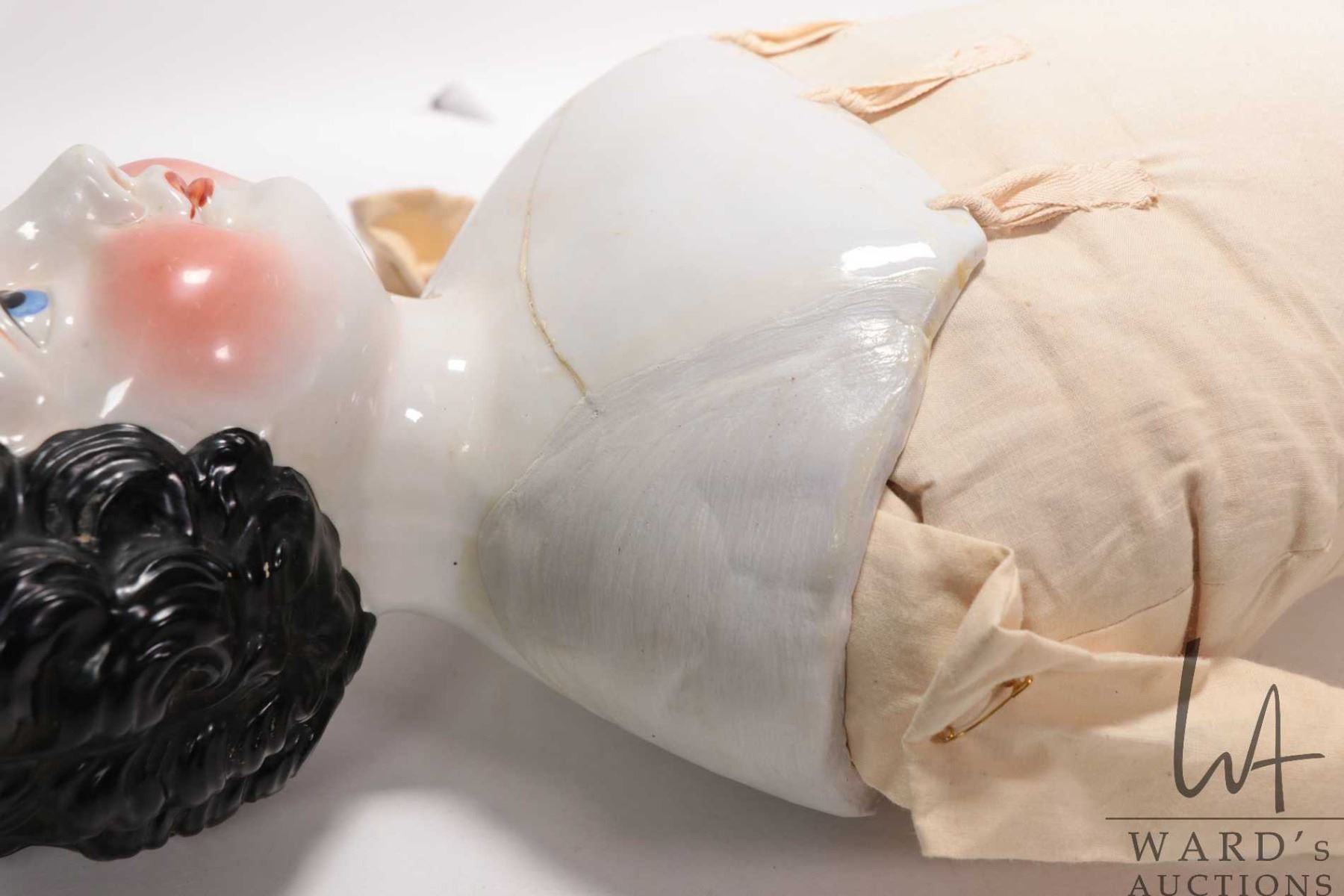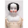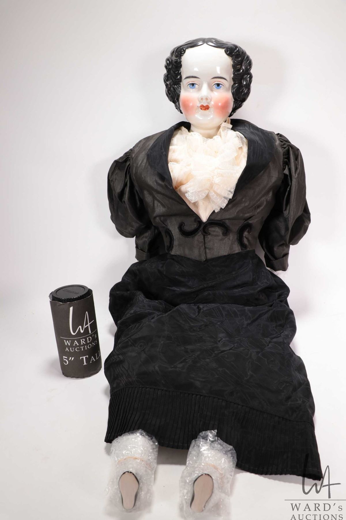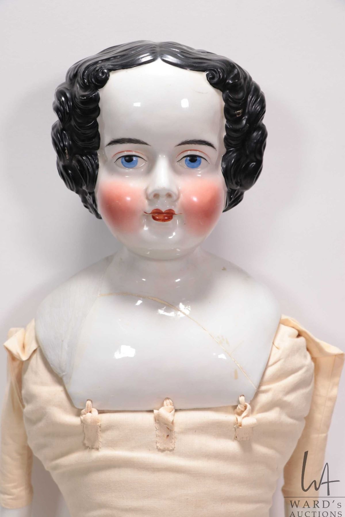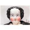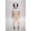 Antique flat head china doll circa 1860-1870 with what appears to be replaced china arms on legs on cloth body. Note: doll has had major repair to shoulder plate, see photos, 33" in height