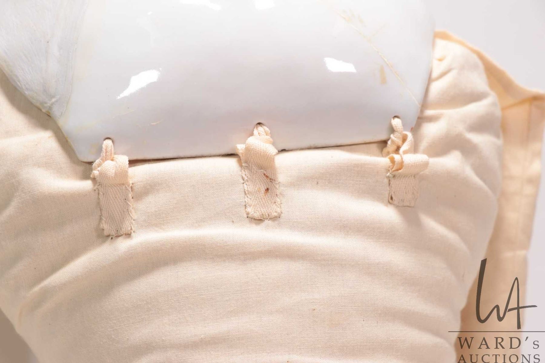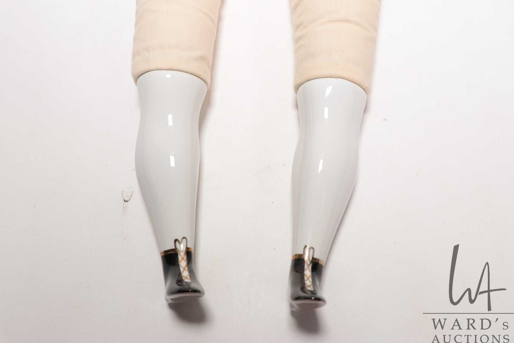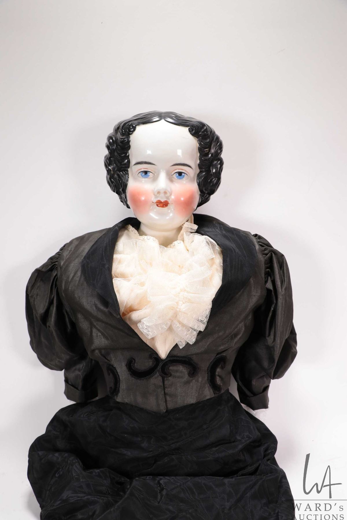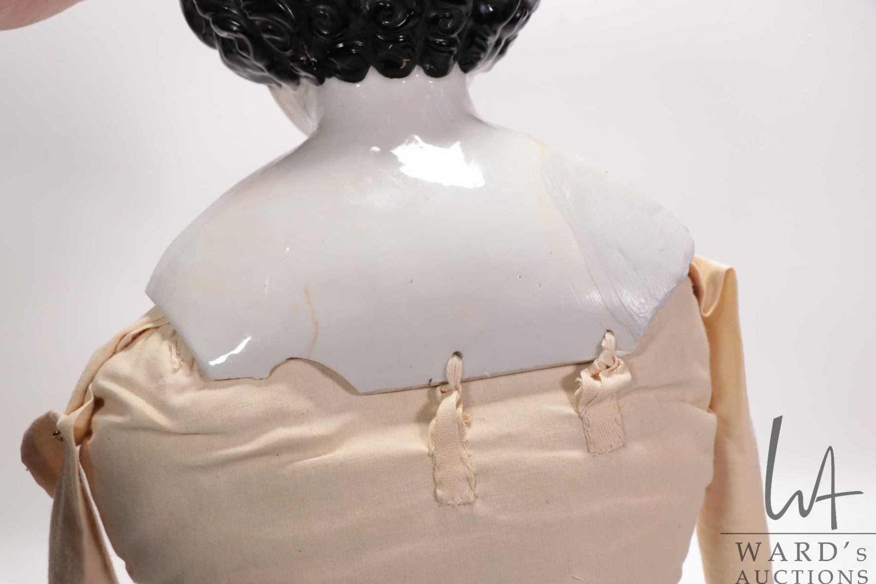 Antique flat head china doll circa 1860-1870 with what appears to be replaced china arms on legs on cloth body. Note: doll has had major repair to shoulder plate, see photos, 33" in height
