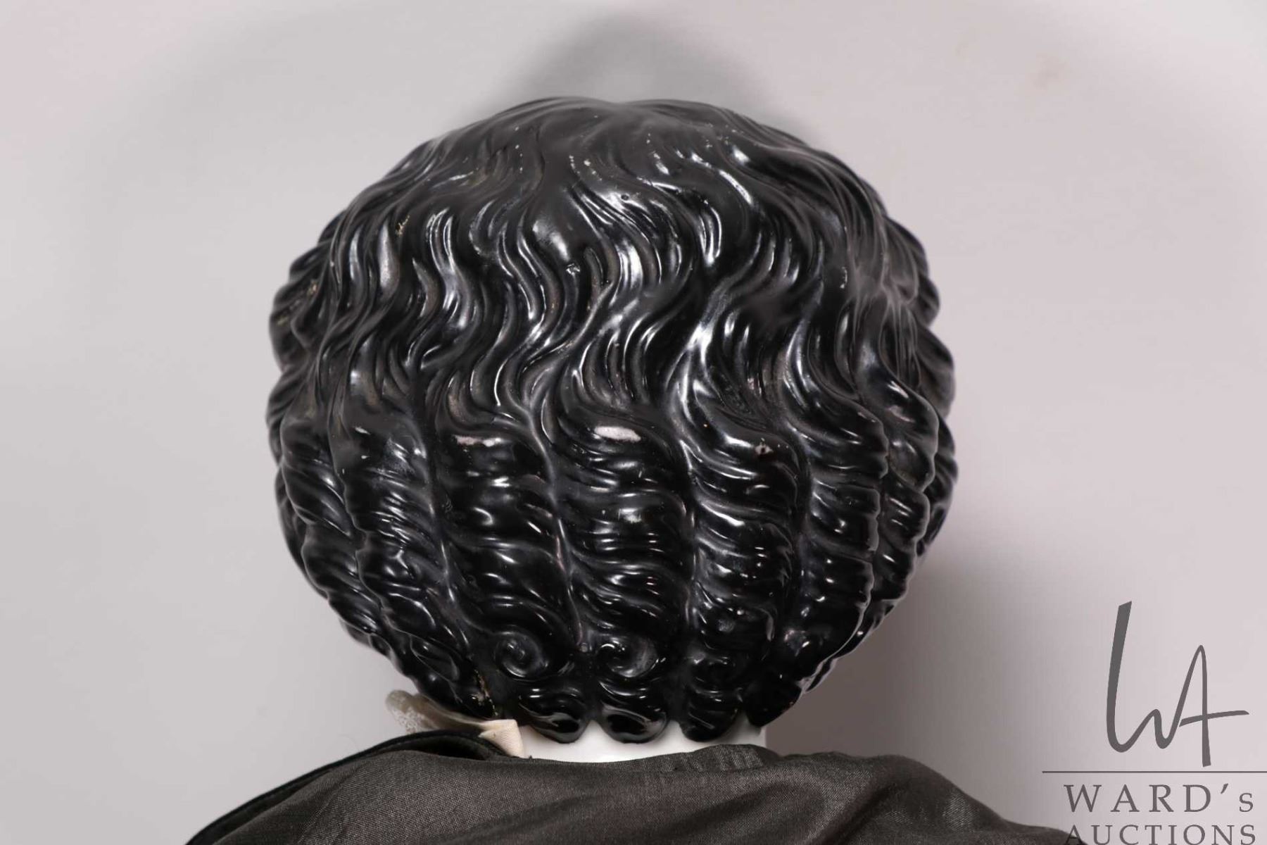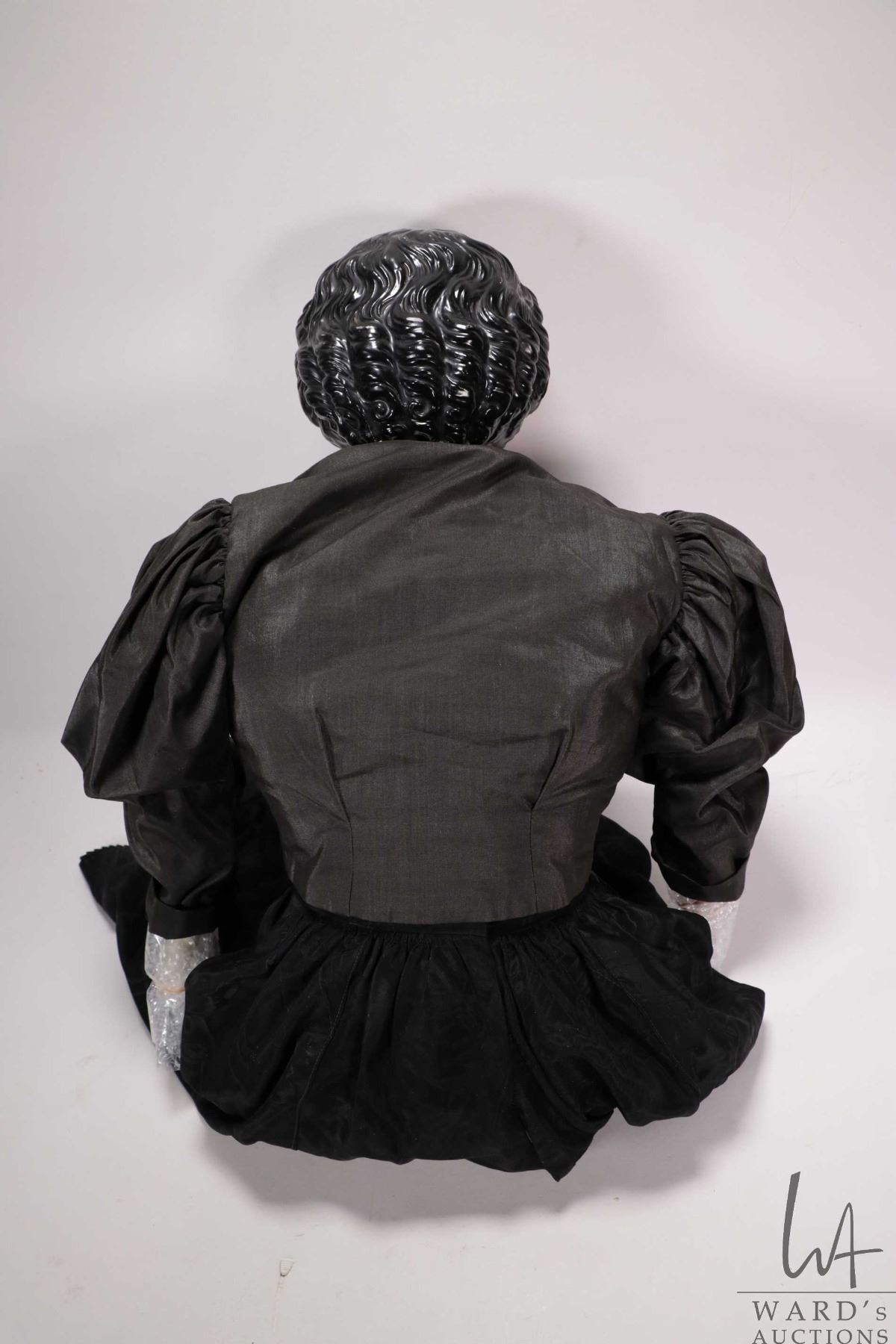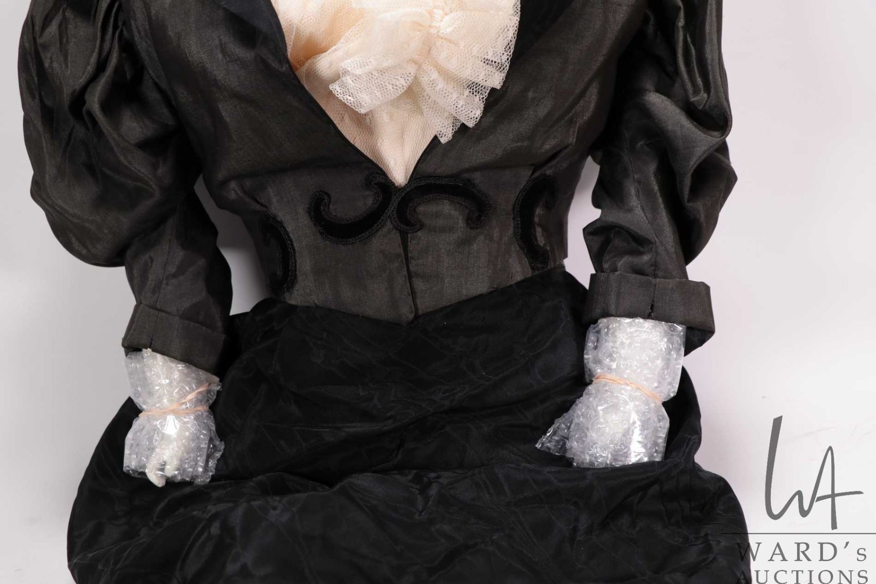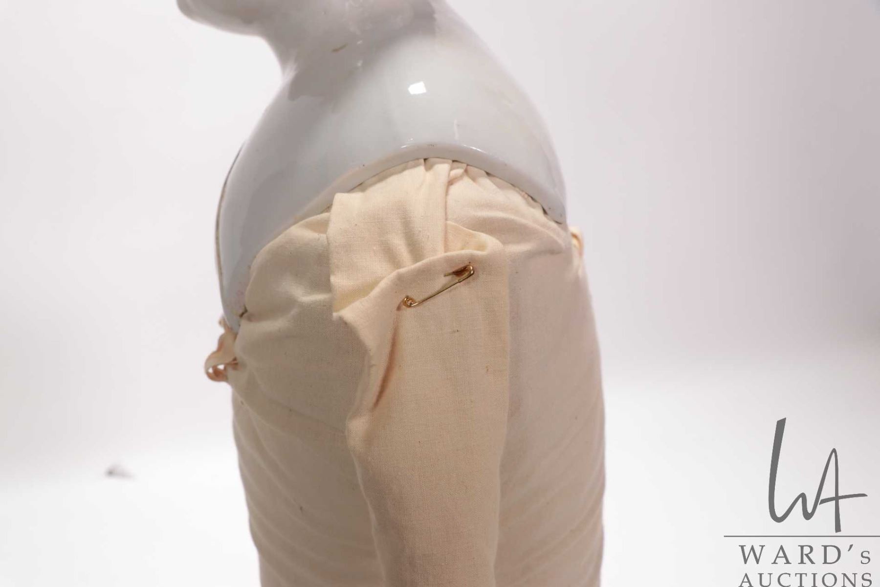 Antique flat head china doll circa 1860-1870 with what appears to be replaced china arms on legs on cloth body. Note: doll has had major repair to shoulder plate, see photos, 33" in height