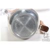 Antique framed Brazil tray with Amazon butterfly wing top, 17" X 28 1/2" plus a English made Picquot ware aluminum tea service including teapot, cream sugar and hot water, circa 1950. Note: Not available for shipping. Local pickup only