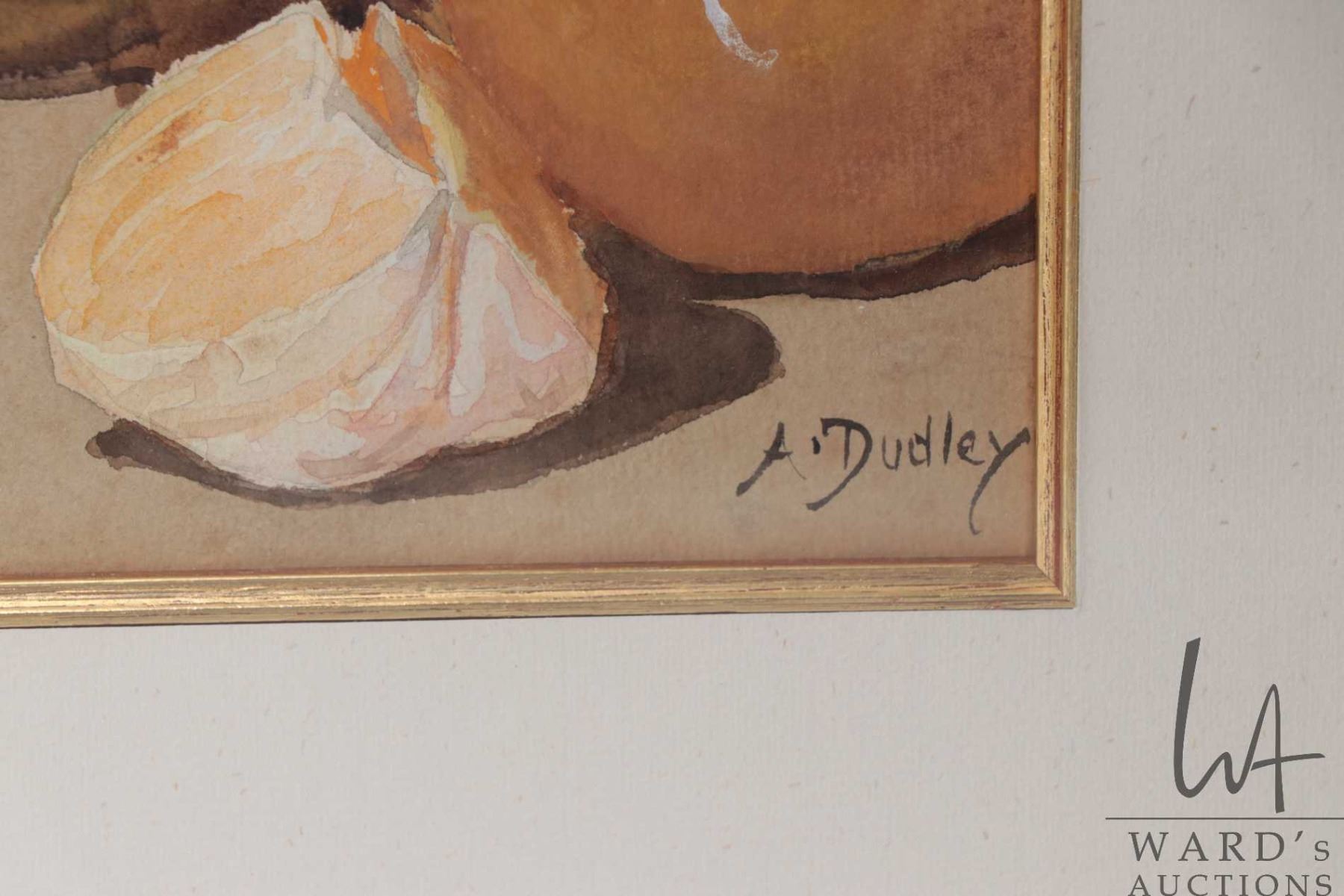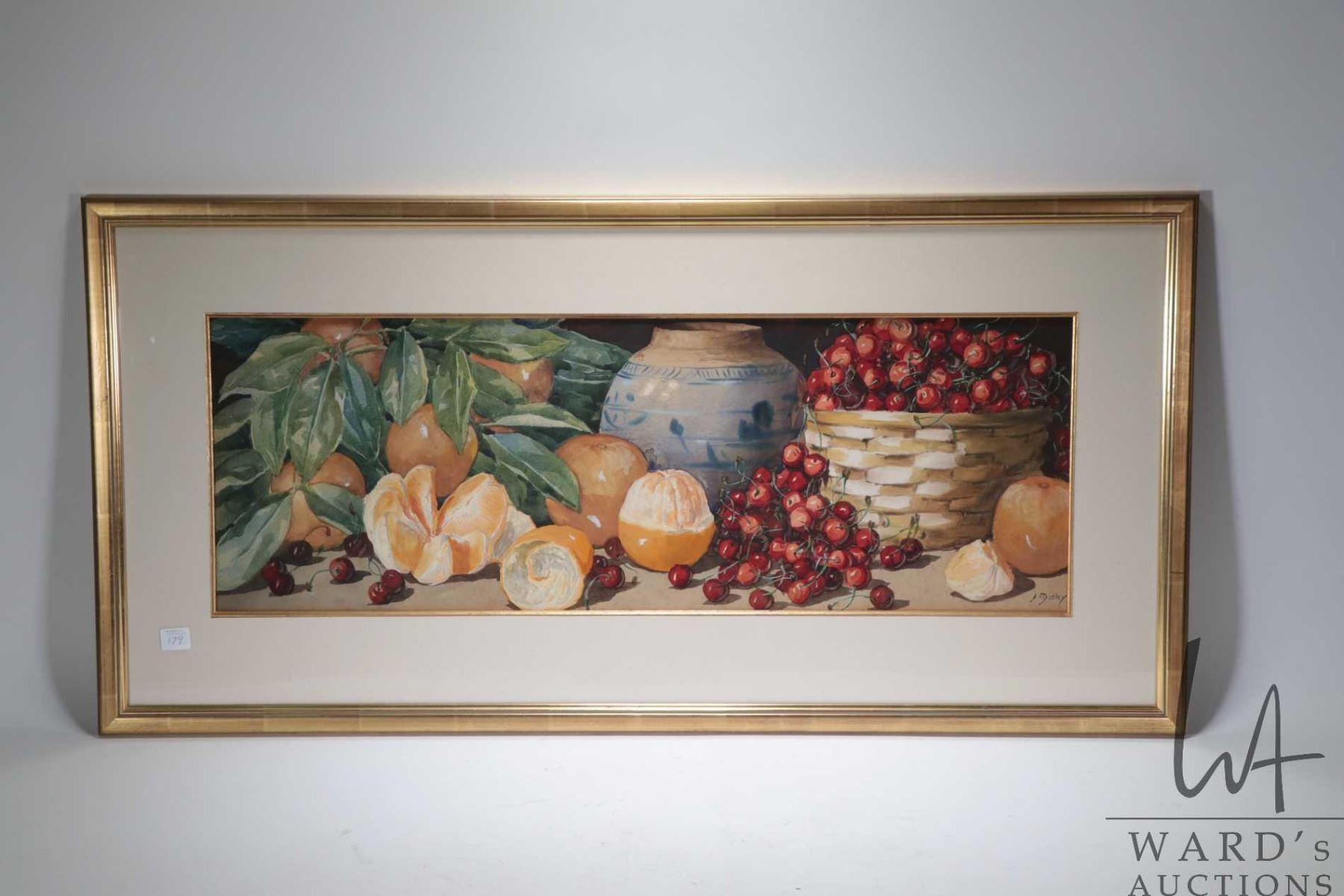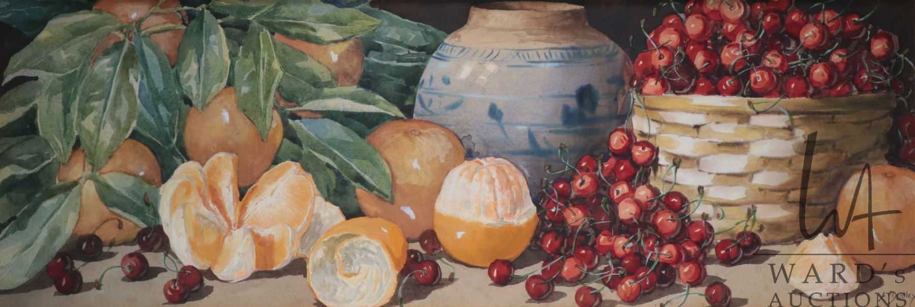 Antique framed original watercolour still-life painting featuring cherry basket and oranges. Signed by acclaimed English watercolour painter Arthur Dudley ( 1864-1919). Labeled on verso that he exhibited at the Royal Institute of painters and the Royal Society of British Artists, Royal Academy between 1180-1907, 10" X 29". Shipping Note: Artwork cannot be insured by any shipping or courier companies in Canada. Ward's Auctions will endeavor to adequately pack these items but the risk falls to the buyer in the event of damage. Local pickup is recommended