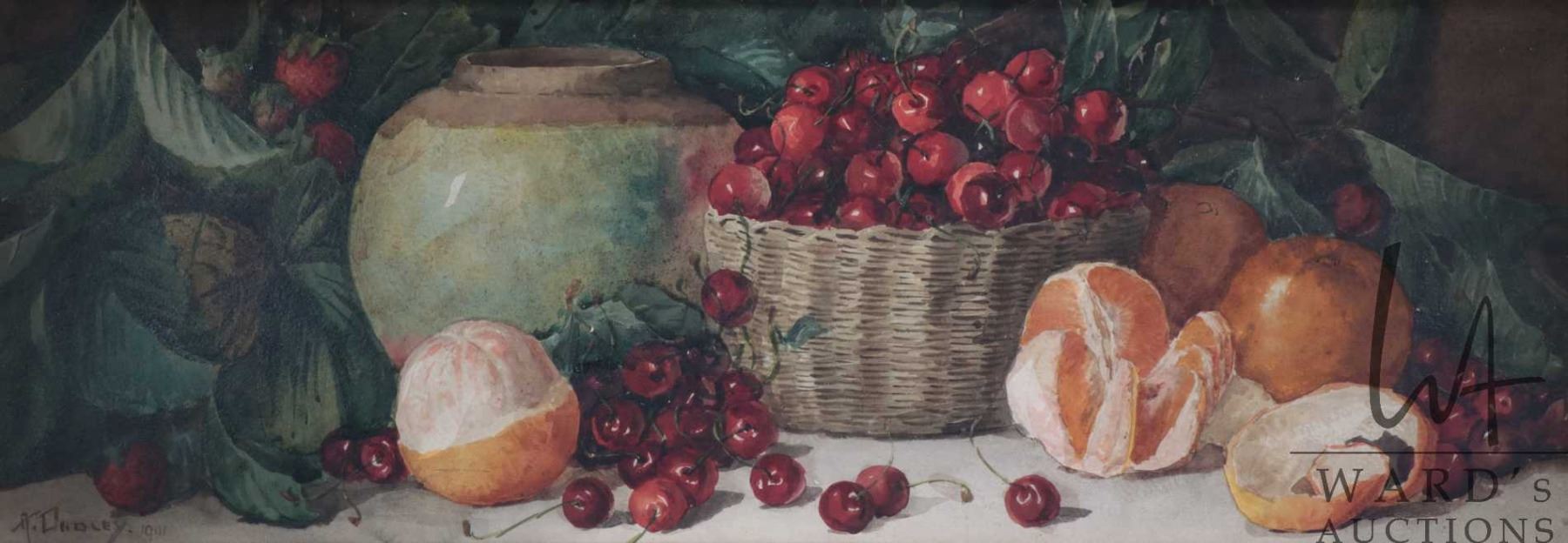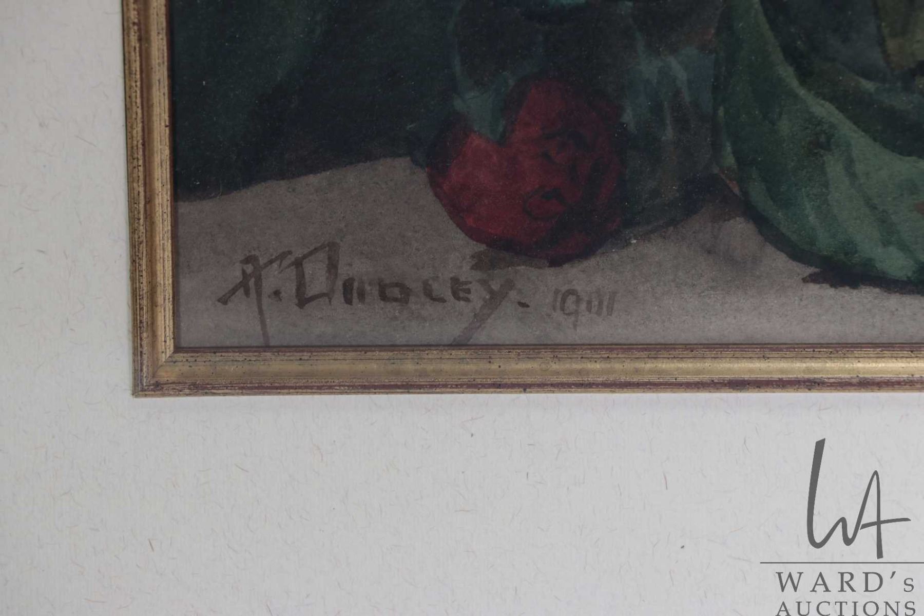 Antique framed original watercolour still-life painting labeled on verso "Still Life with Fruit, 1901" and signed by artist Arthur Dudley (1864-1919), also included on verso provenance that this painting was formally the property of Dan Leno, popular music hall entertainer" and is purporteded to be labeled on verso of painting with his name and address which was discovered during the paintings last reframing, 11" X 30". Shipping Note: Artwork cannot be insured by any shipping or courier companies in Canada. Ward's Auctions will endeavor to adequately pack these items but the risk falls to the buyer in the event of damage. Local pickup is recommended