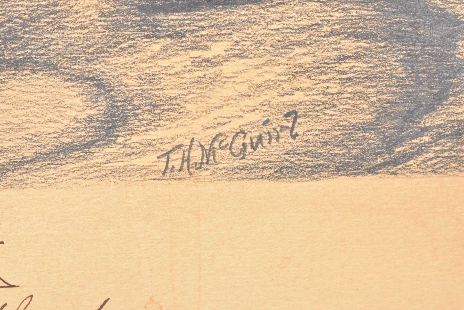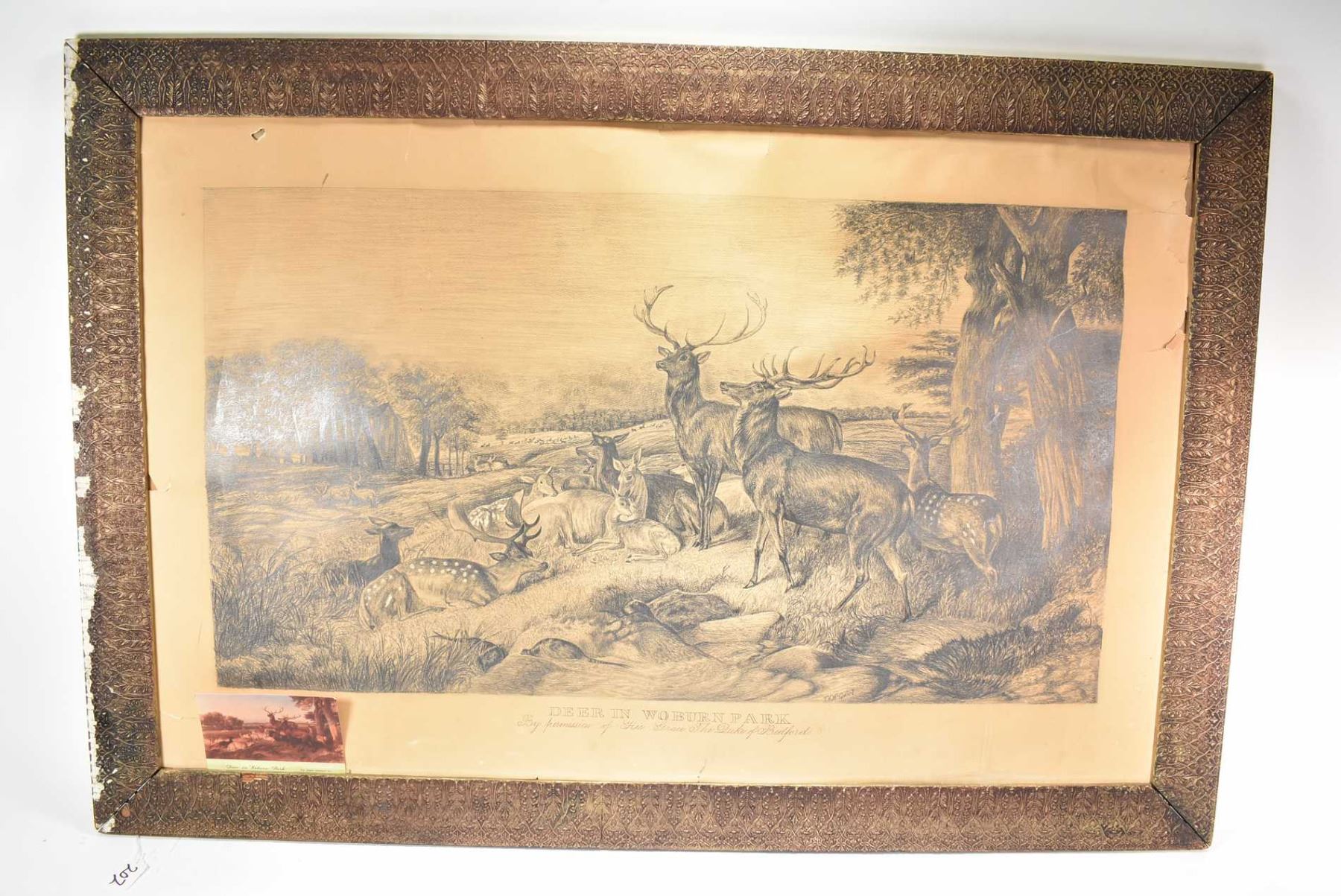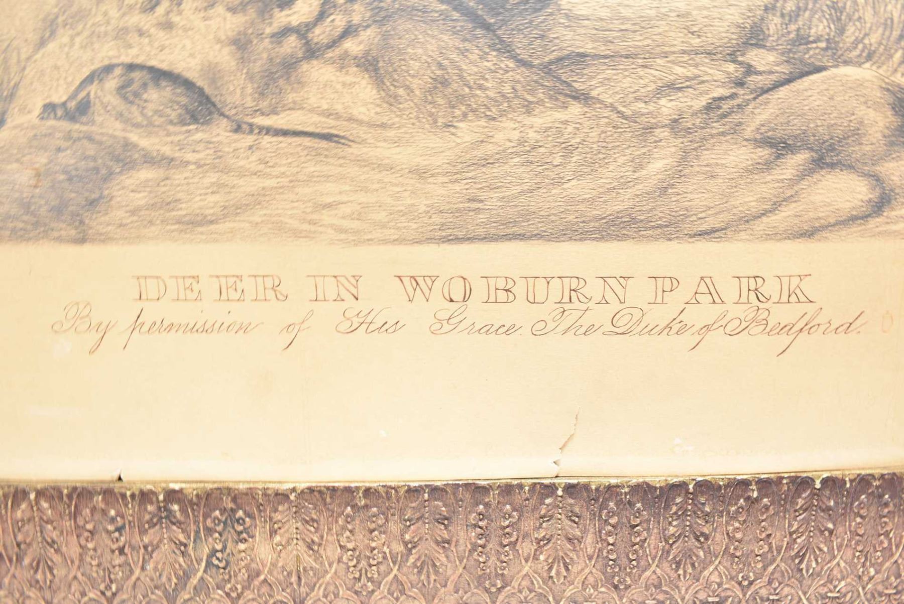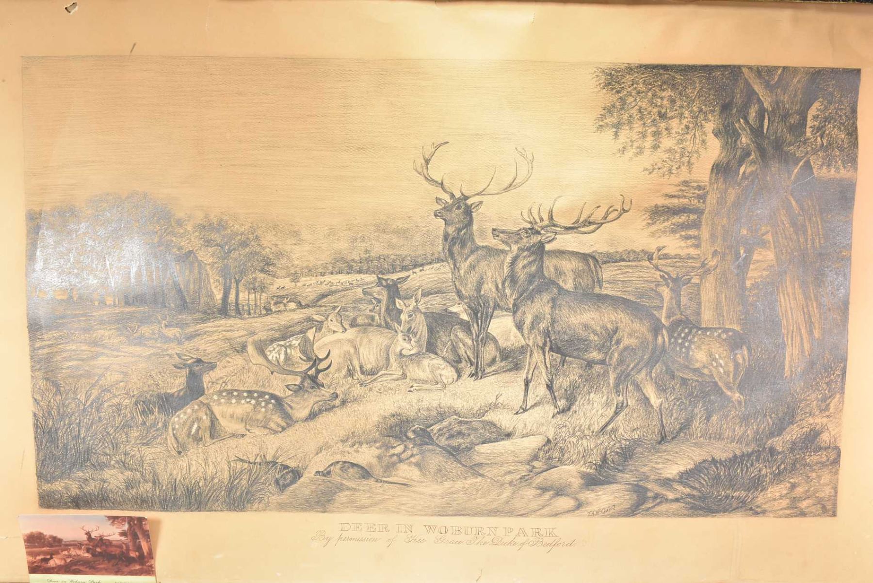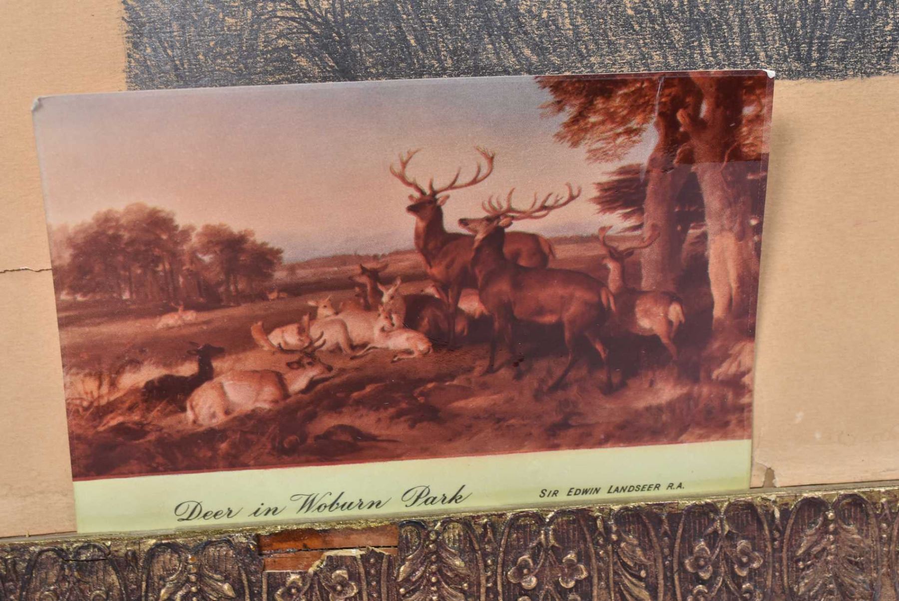 Antique framed pencil drawing after Deer in Woburn Park originally by artist Sir Edwin Landser. R.A. and titled "Deer in Woburn Park by Permission of his grace The Duke of Bedford" and signed by artist T.H. McGuirl (?) 27" X 41" note also includes postcard of the original painting, likely used as reference