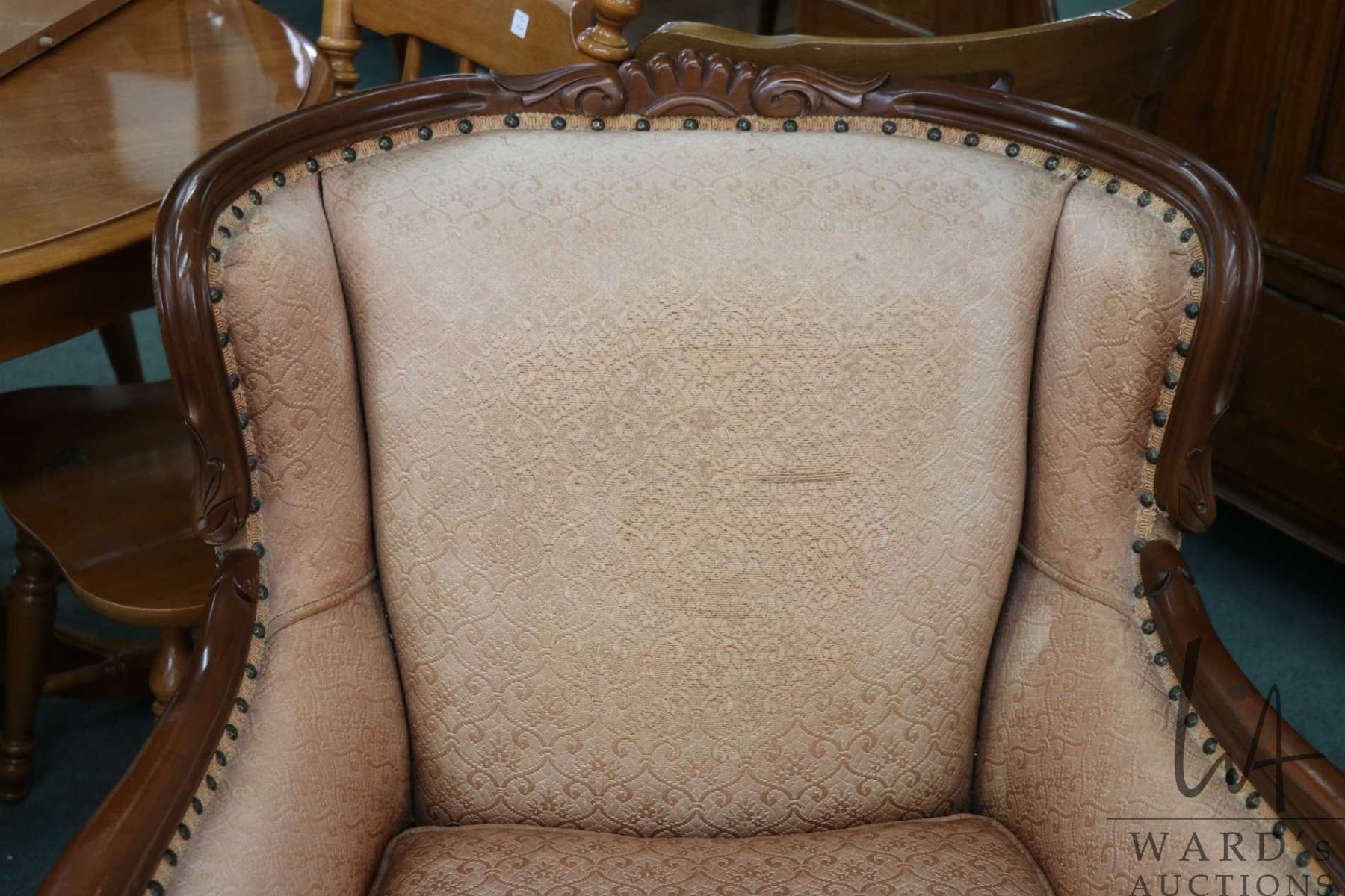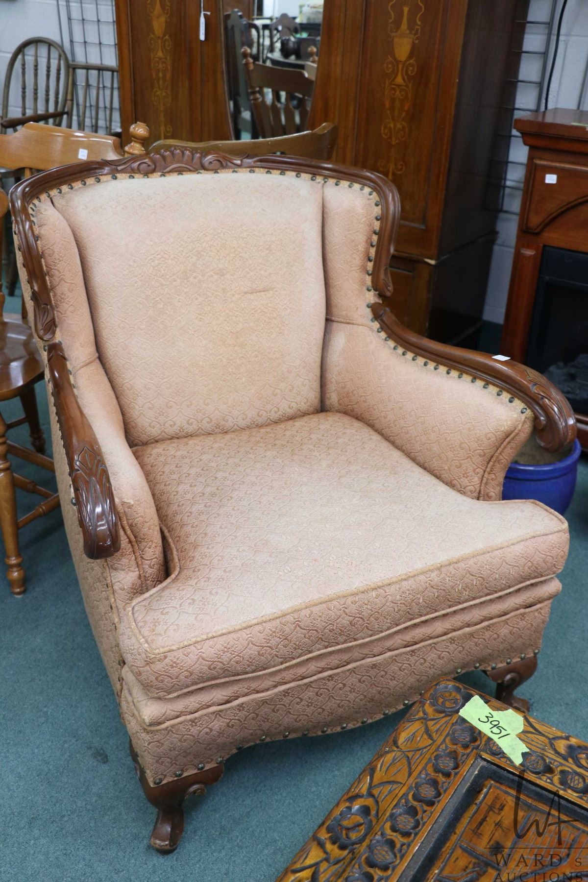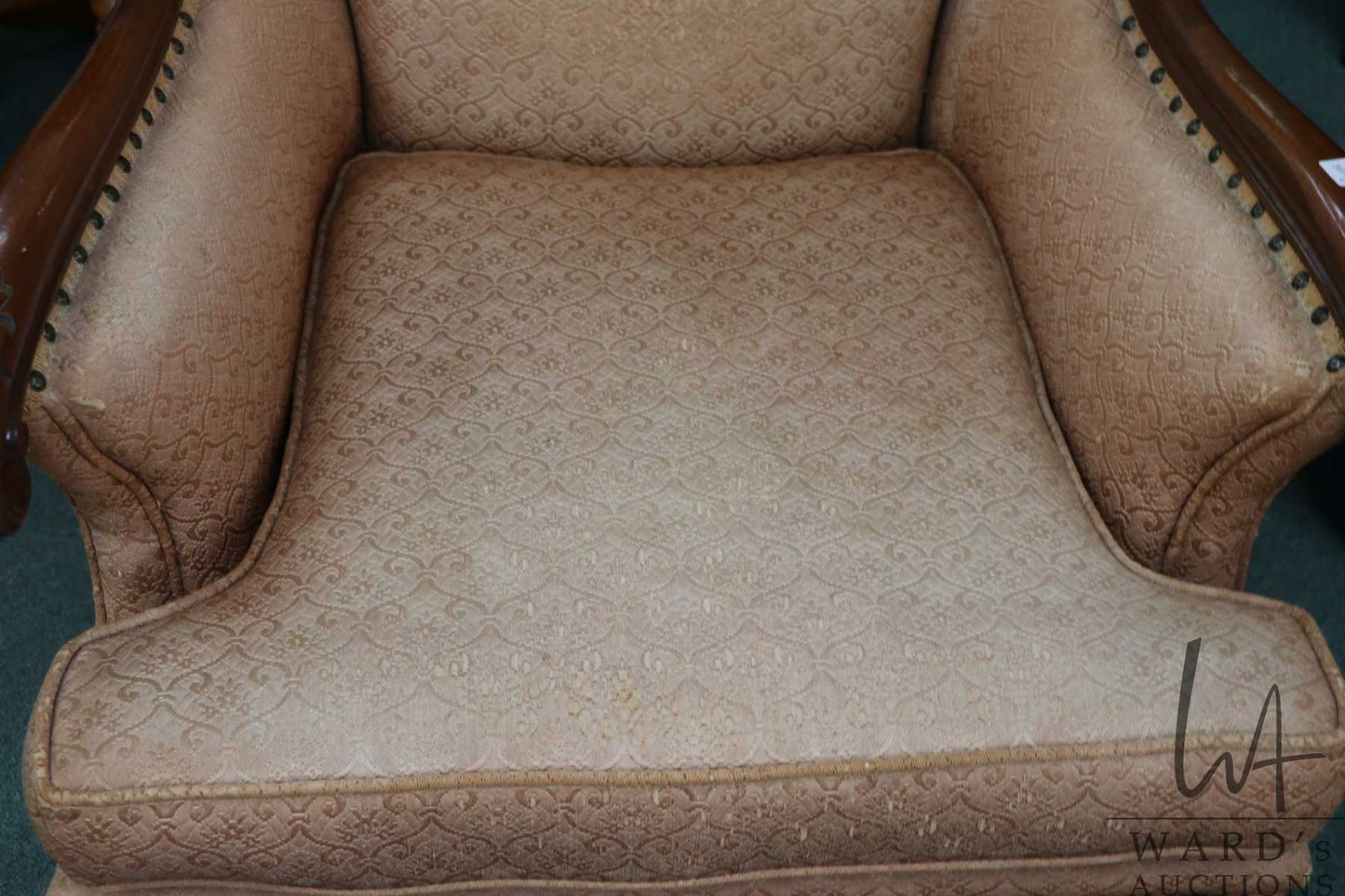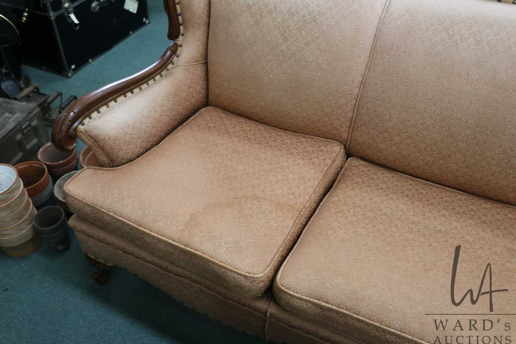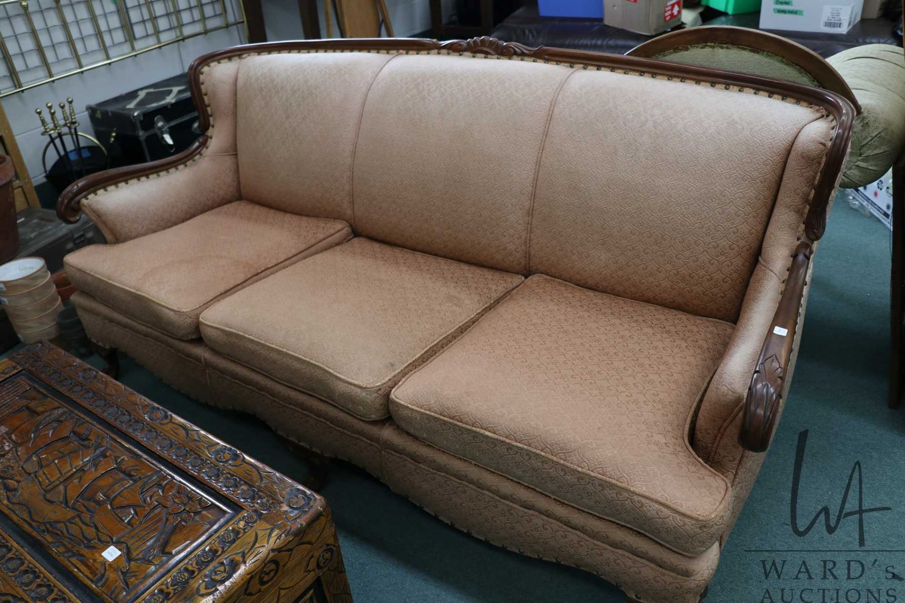 Antique full size sofa and chair with nail head decoration and show wood, 74" in wide