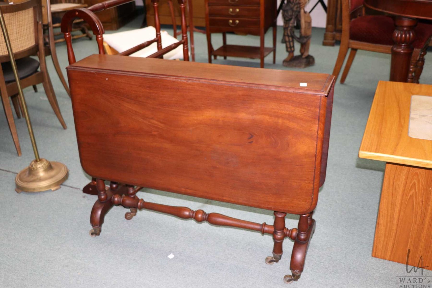 Antique gate leg drop leaf table with turned supports and brass castors