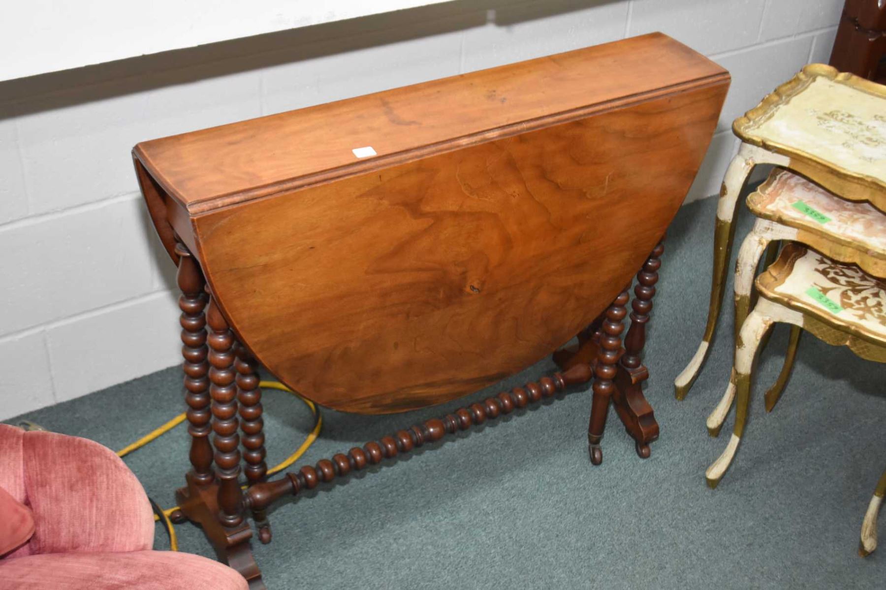 Antique gate leg table with bobbin supports and stretchers, fitted with original porcelain castors