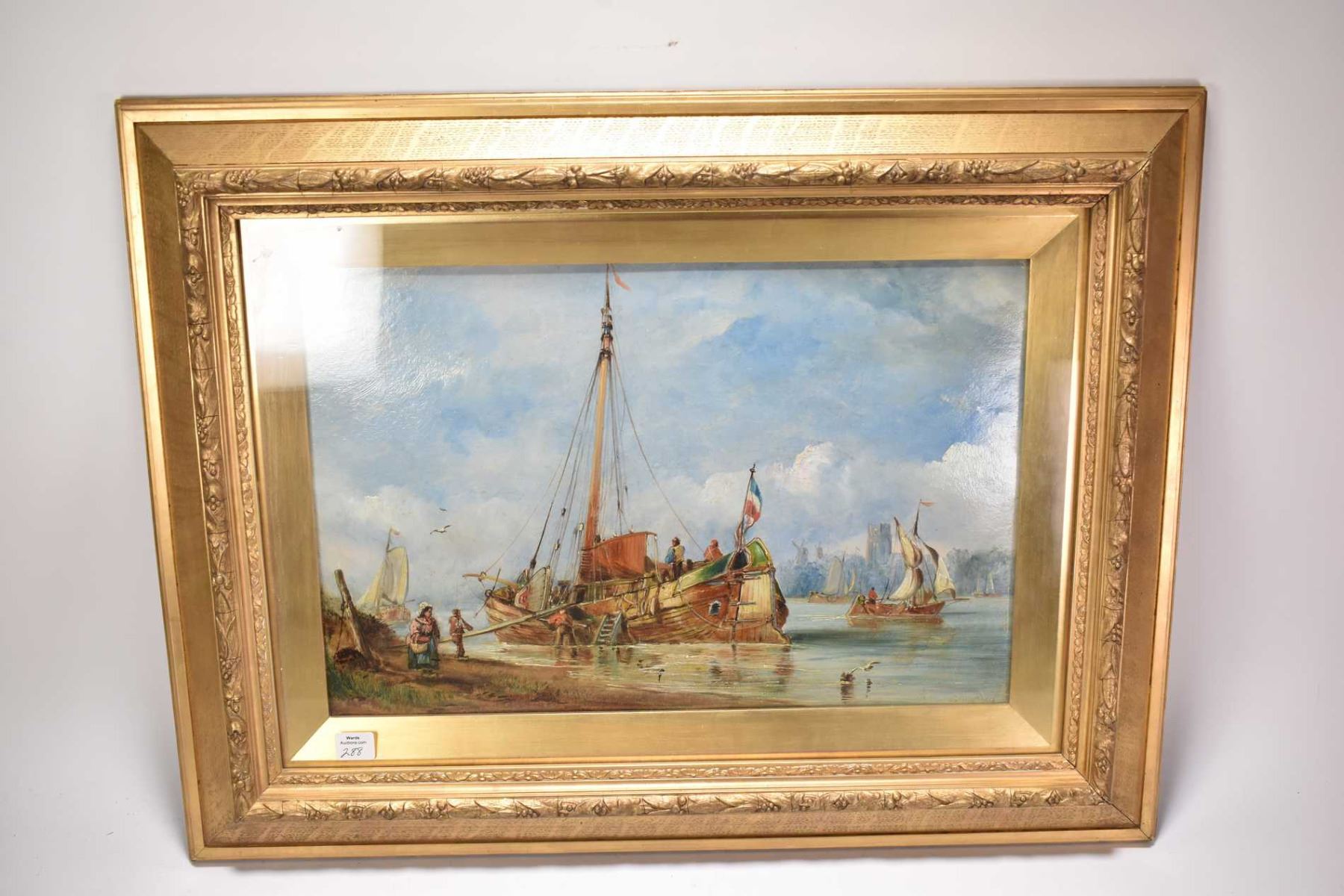 Antique gilt framed oil on board painting titled on verso "View in Holland" and signed by artist G. (George) Chambers 12" X 17"