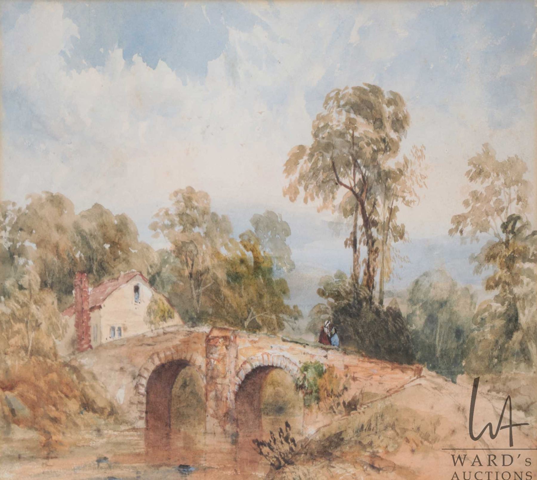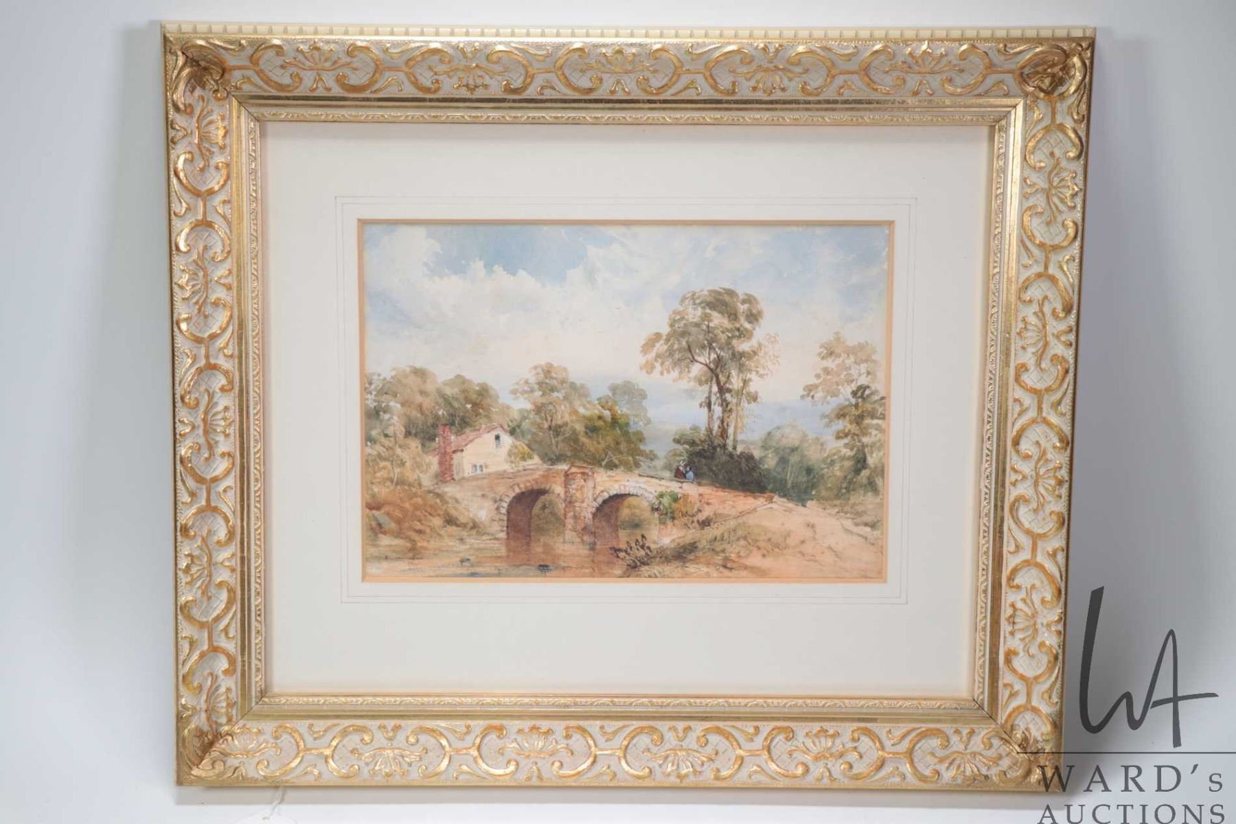 Antique gilt framed watercolour painting of a stone bridge with cottage, no artist signature seen, 8" X 12"