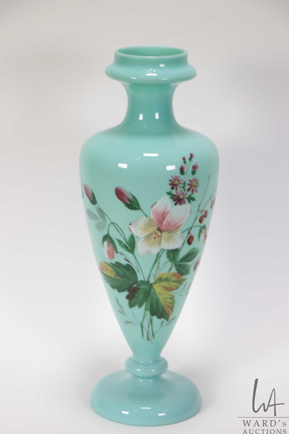 Antique green Bristol glass vase with hand painted flowers, 13" in height