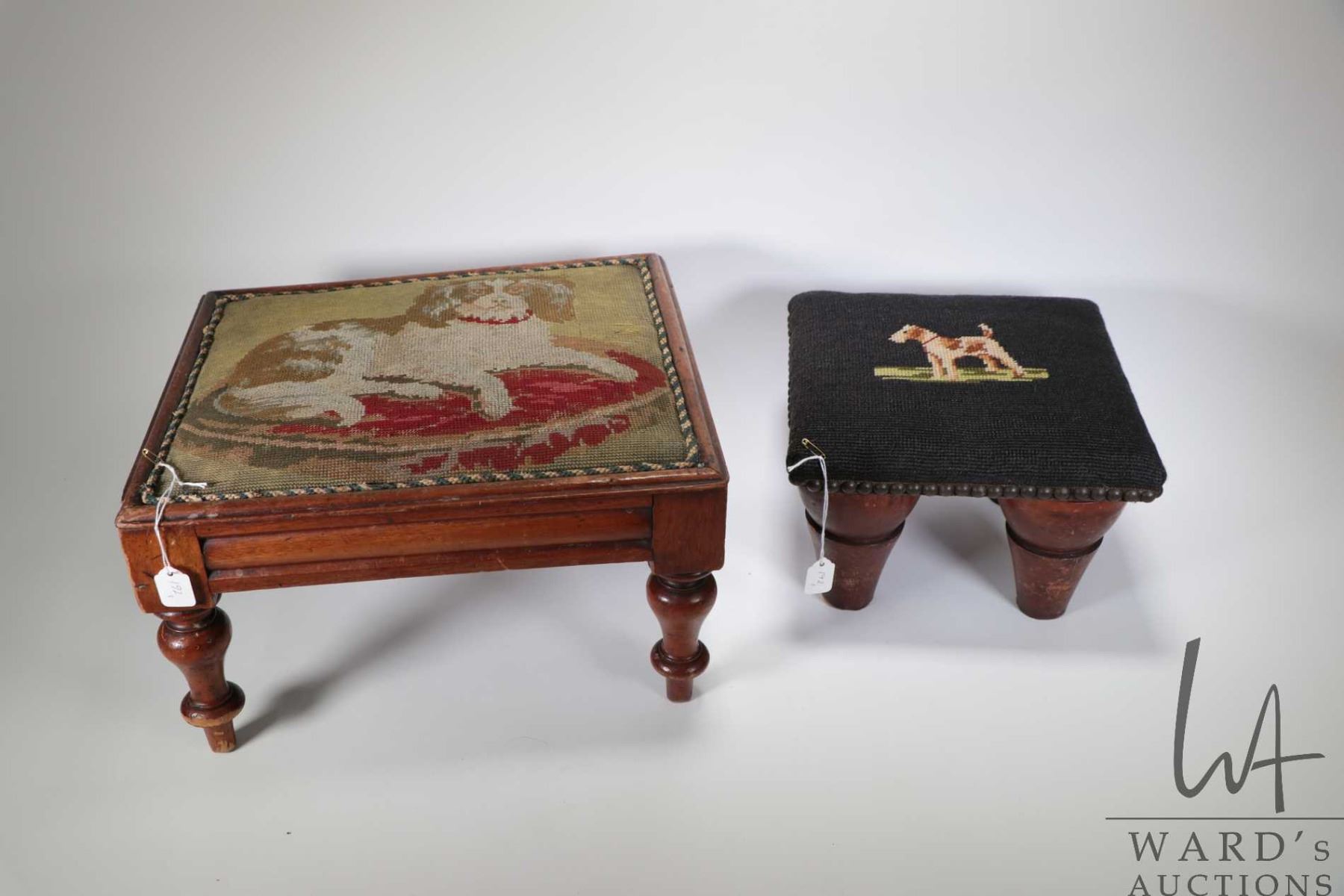 Antique hand carved and needlework wall mount towel rack and two needlepoint upholstered dog motif stools