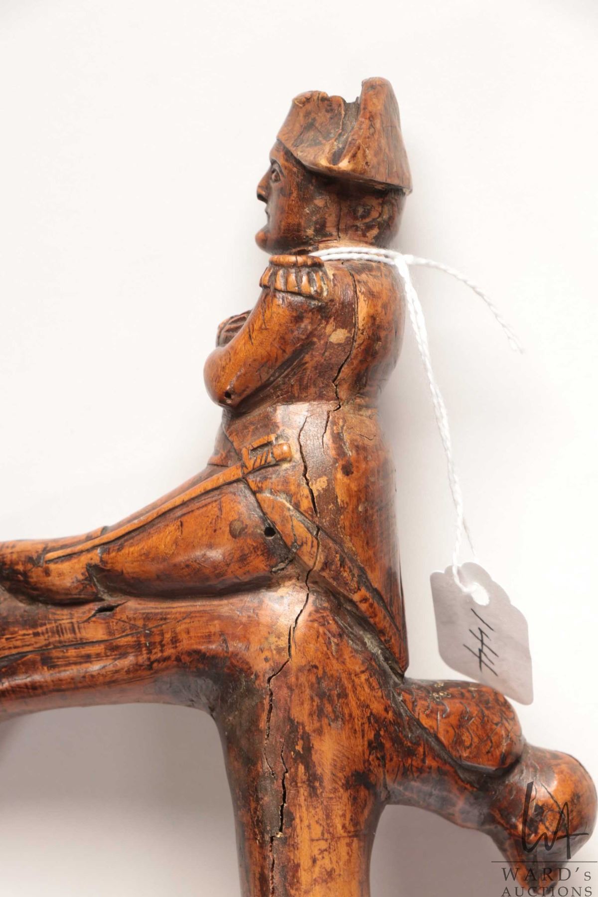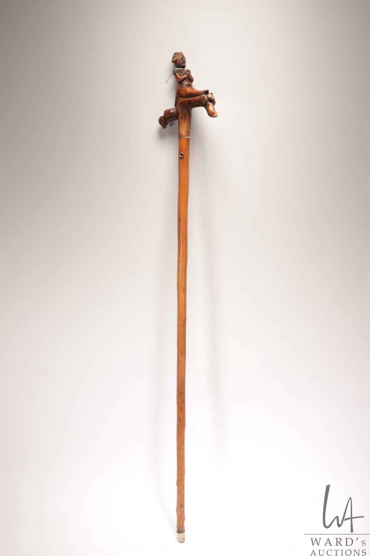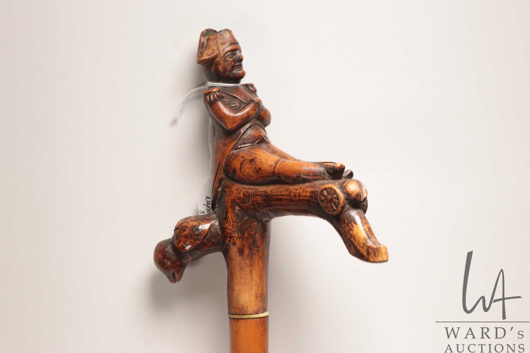 Antique hand carved wooden figural walking stick featuring Napoleon riding a cannon with his military eagle, 38" in height