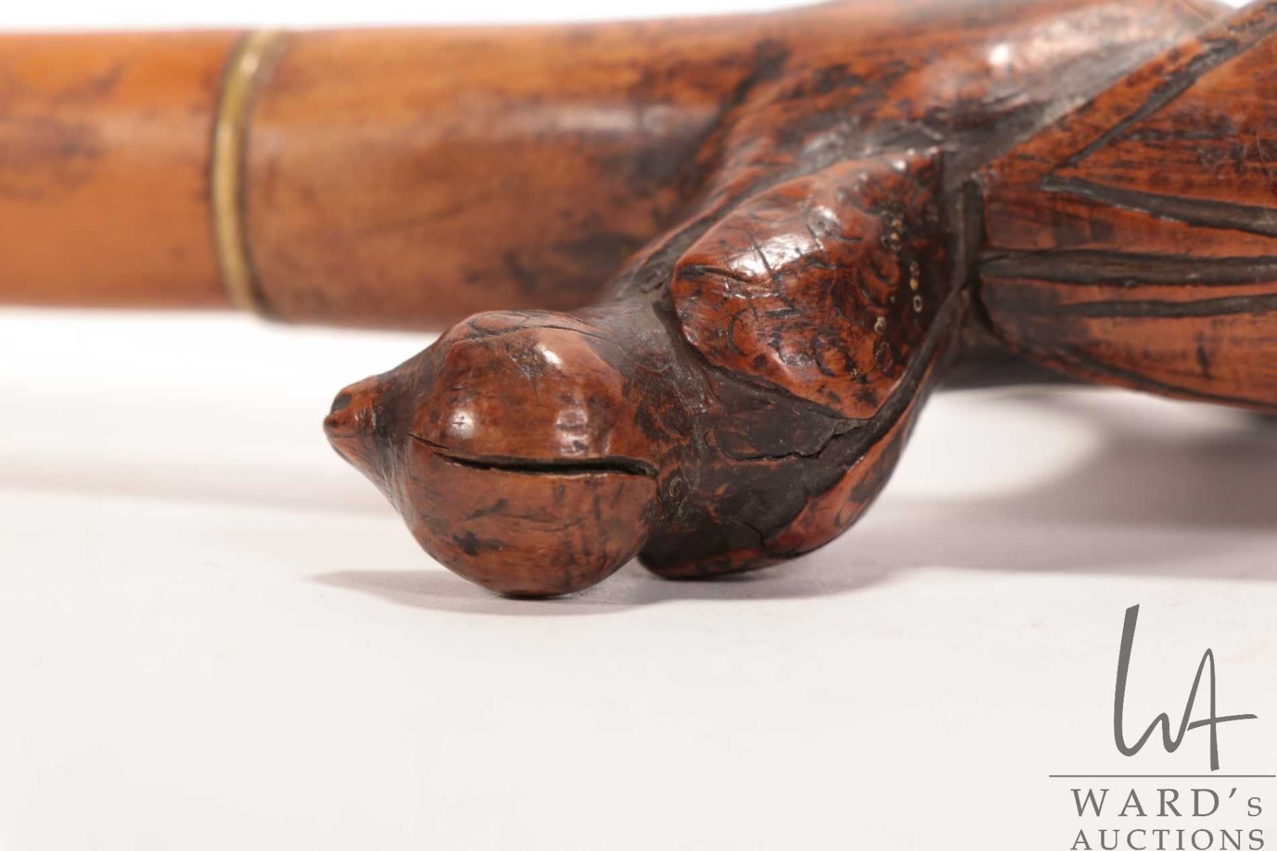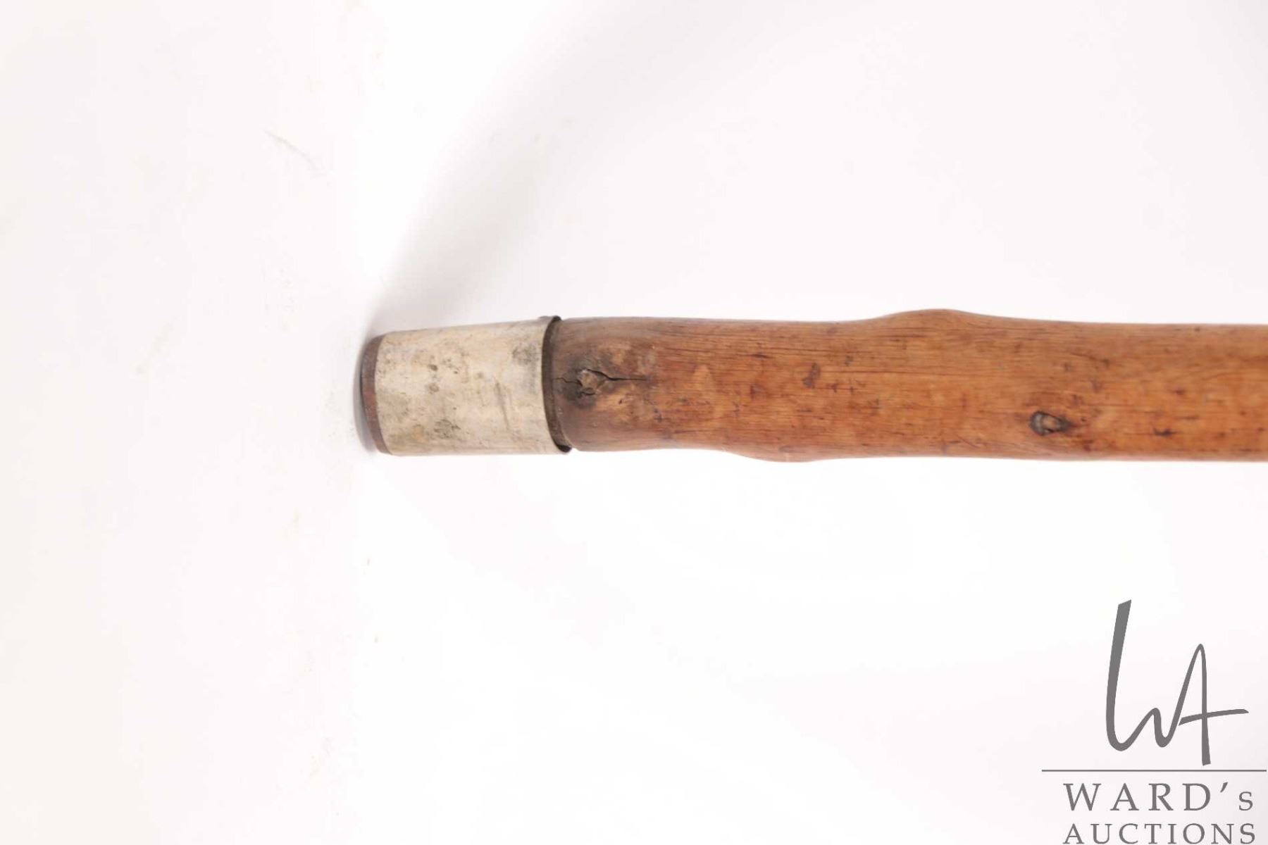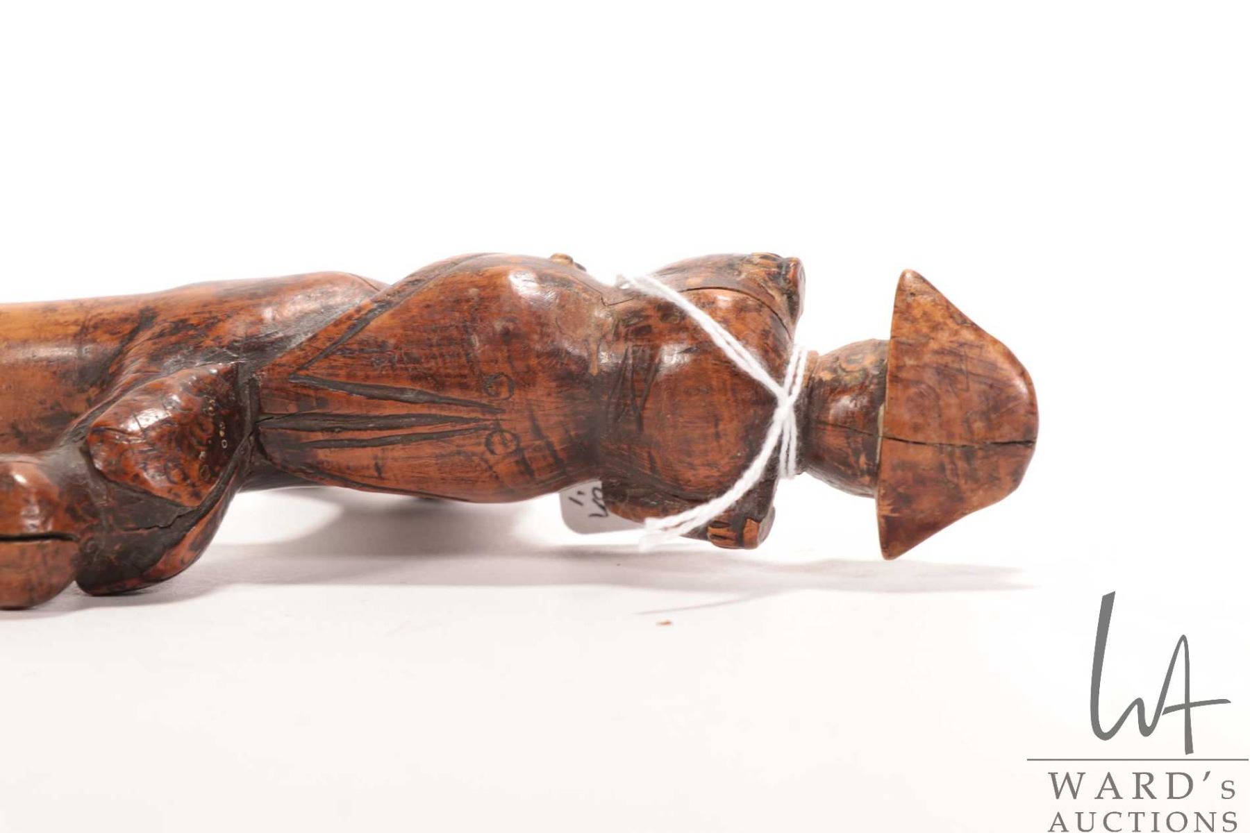 Antique hand carved wooden figural walking stick featuring Napoleon riding a cannon with his military eagle, 38" in height