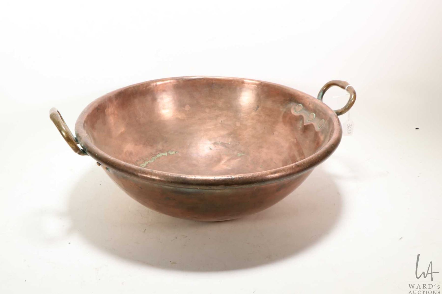 Antique hand hammered copper bowl with double brass handles, 17" in diameter